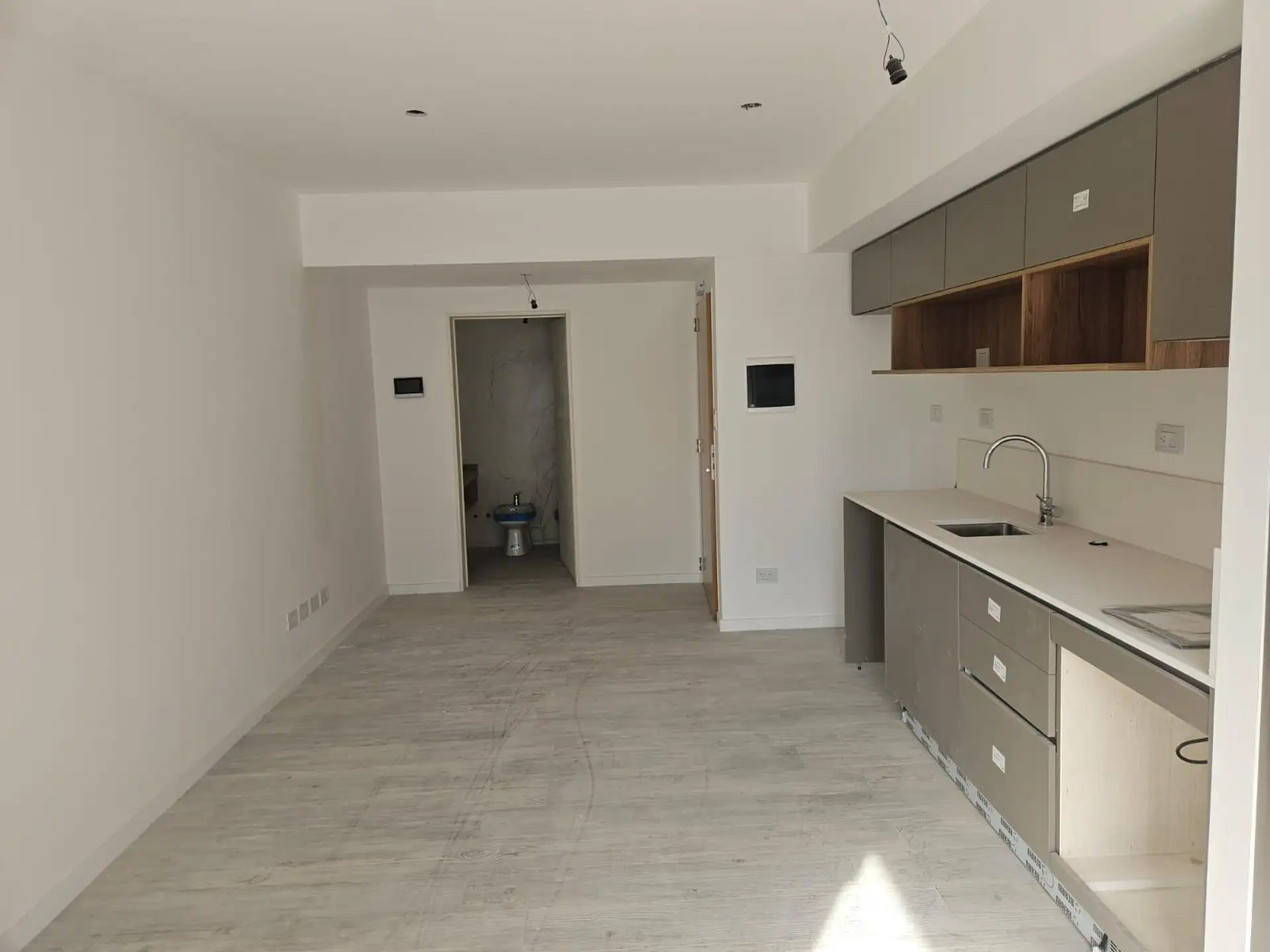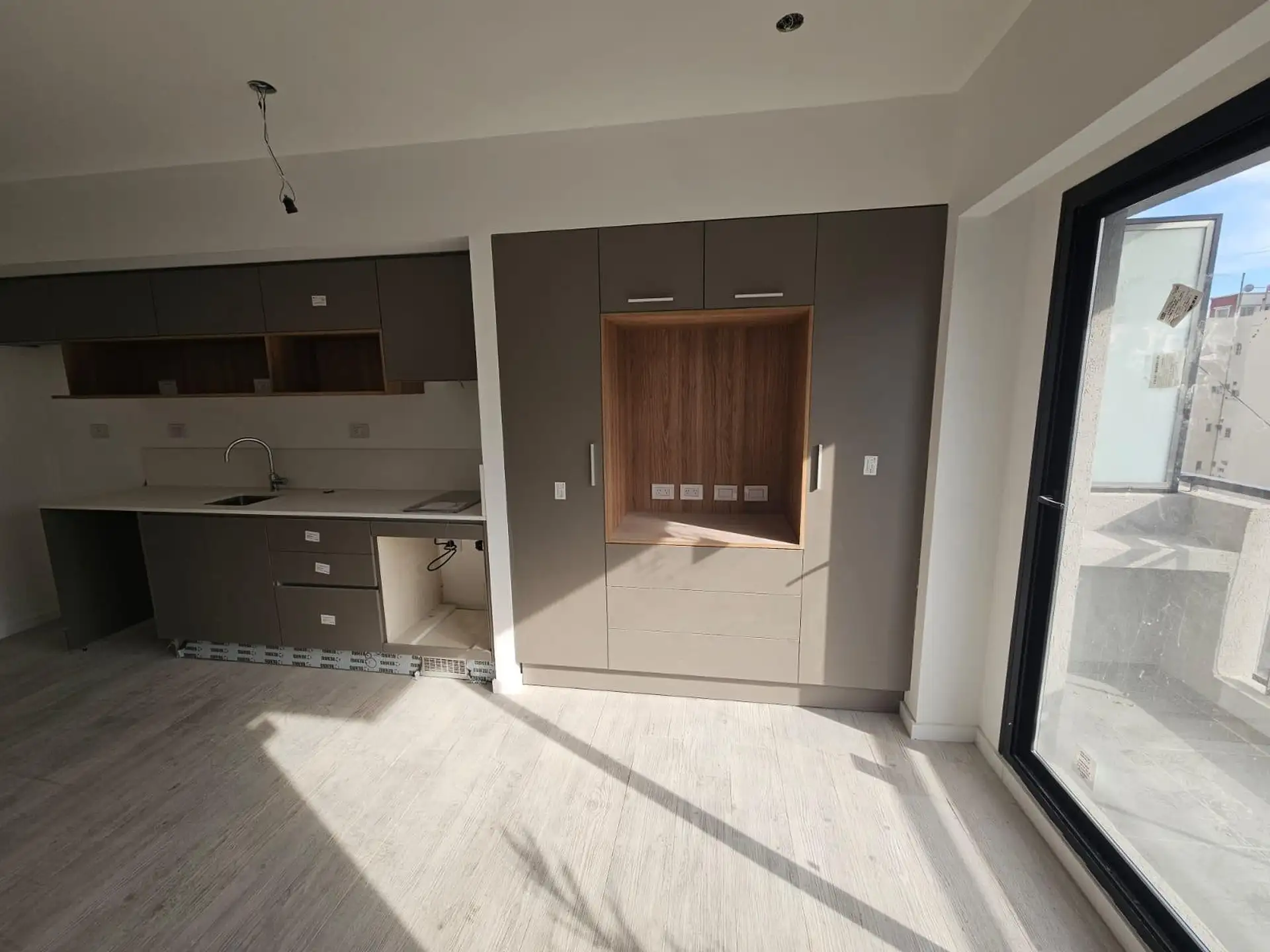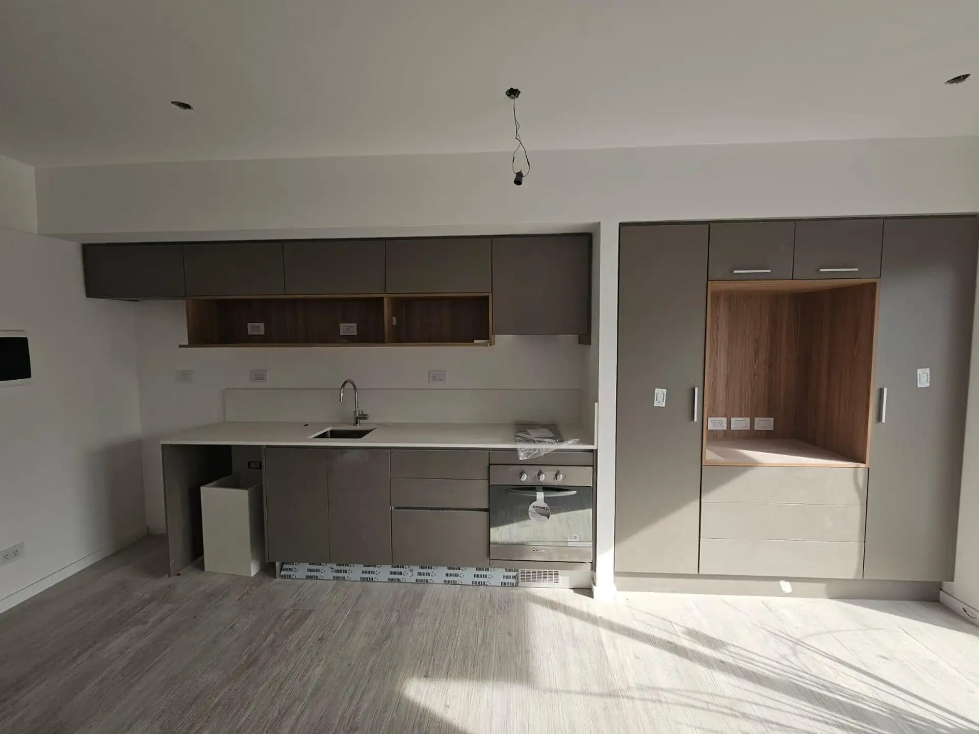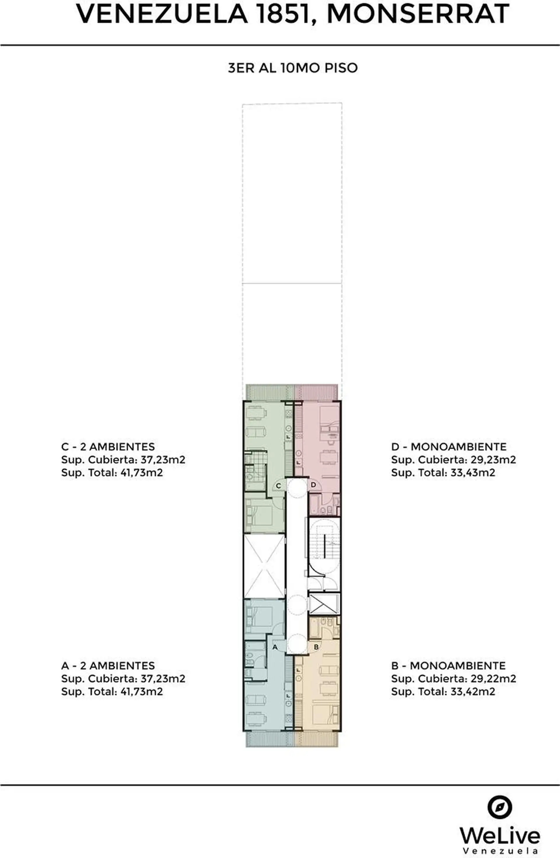 Apartamento de dois ambientes em WeLive Venezuela, em Monserrat, a 1 quadra da Av. Belgrano e a poucas quadras da Plaza del Congreso. Há balcões e terraços privados. Cozinha com bancada em purastone branco nube, pia de aço inox, bancada e armários inferiores e aéreos em melamina texturada e fogão com 4 bocas e forno elétricos. Pisos em estar, sala de jantar e dormitório com piso flutuante similar a madeira; guarda-roupa do piso ao teto com portas de correr e trilhos em alumínio; janelas e portas