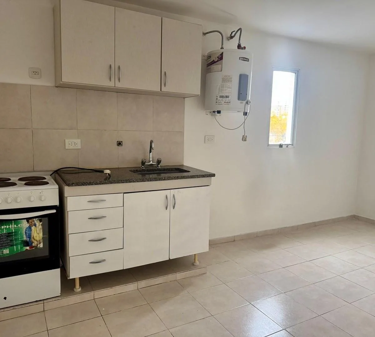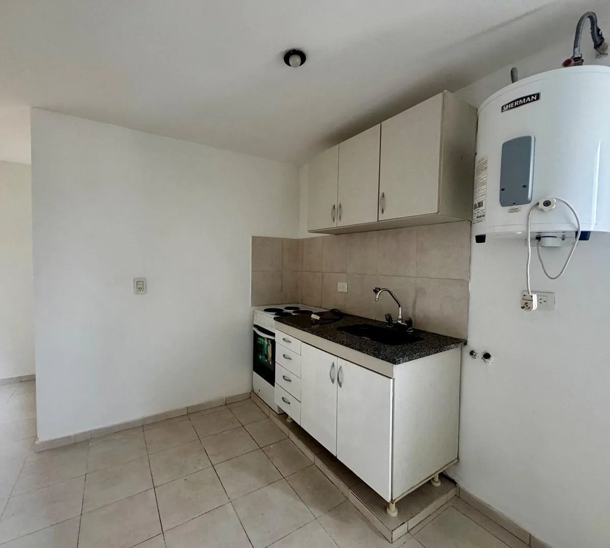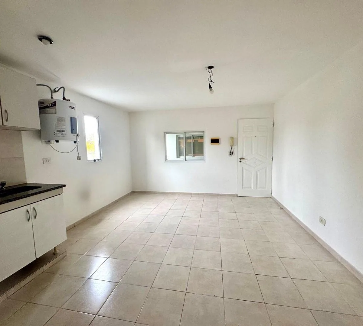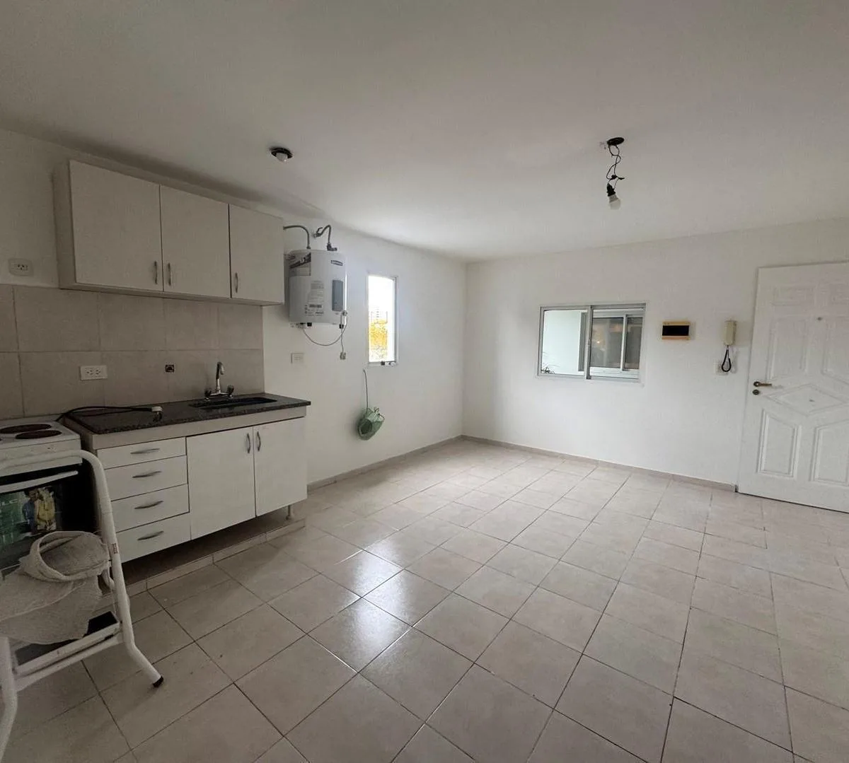 Apartamento de 2 ambientes no 2º andar, com acesso por escada. Sala de estar e jantar com cozinha integrada. Quarto amplo sem armário, sem mobília. Não são aceitos animais de estimação.