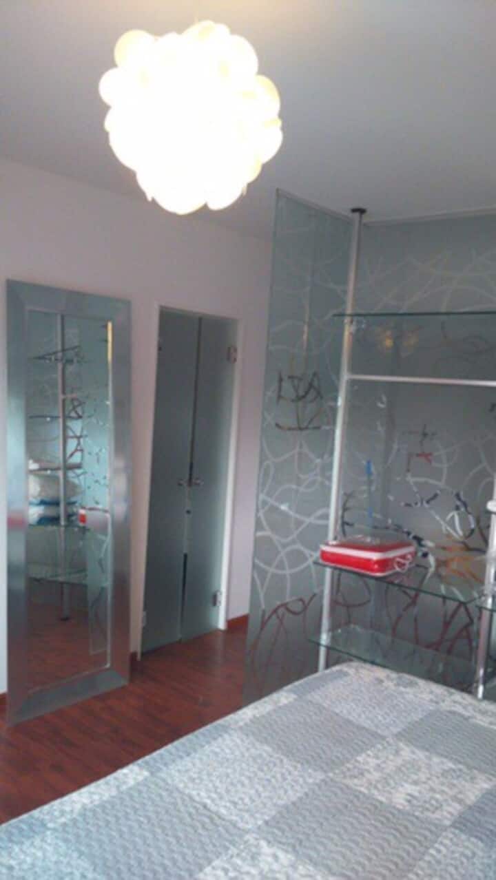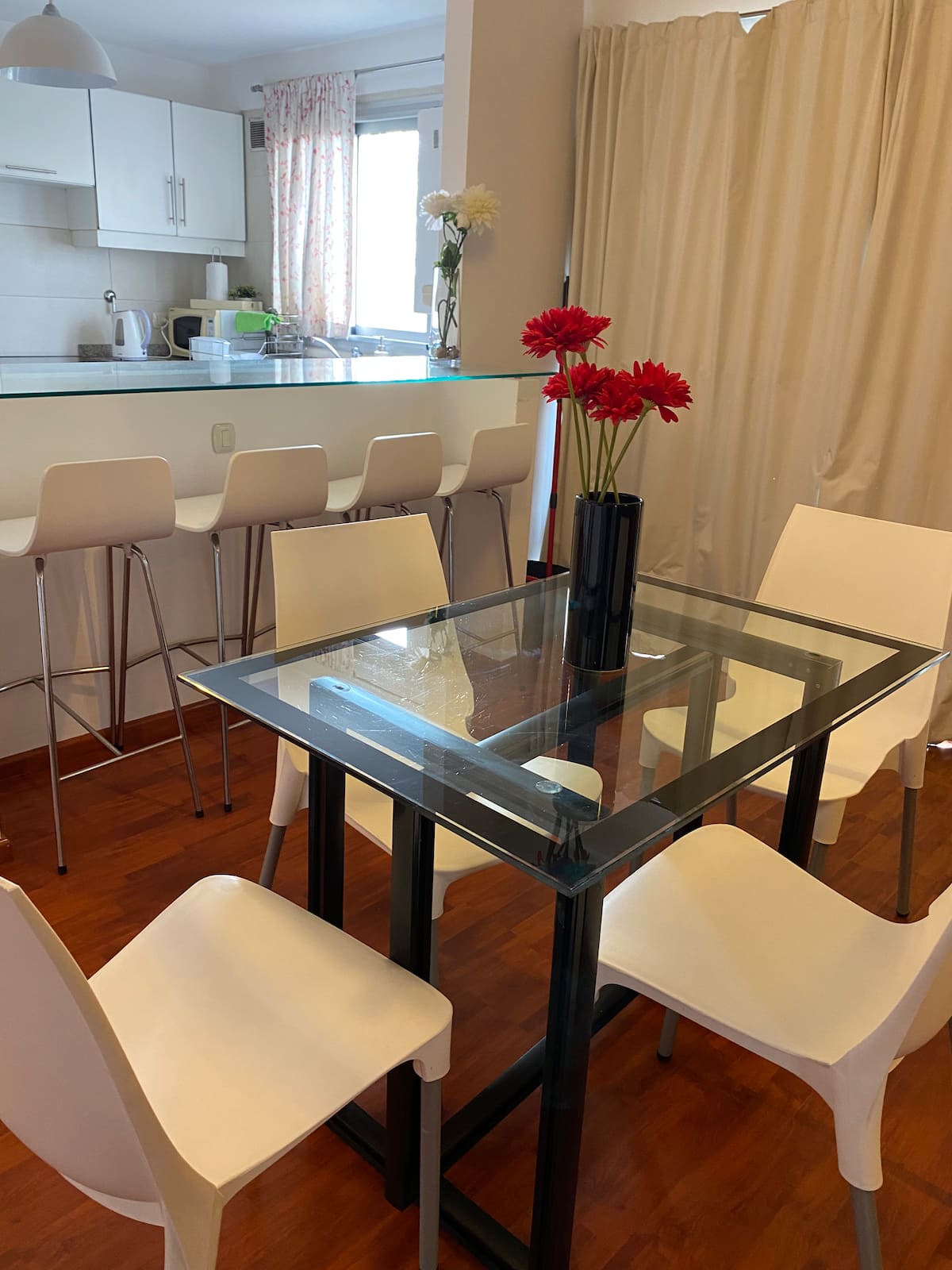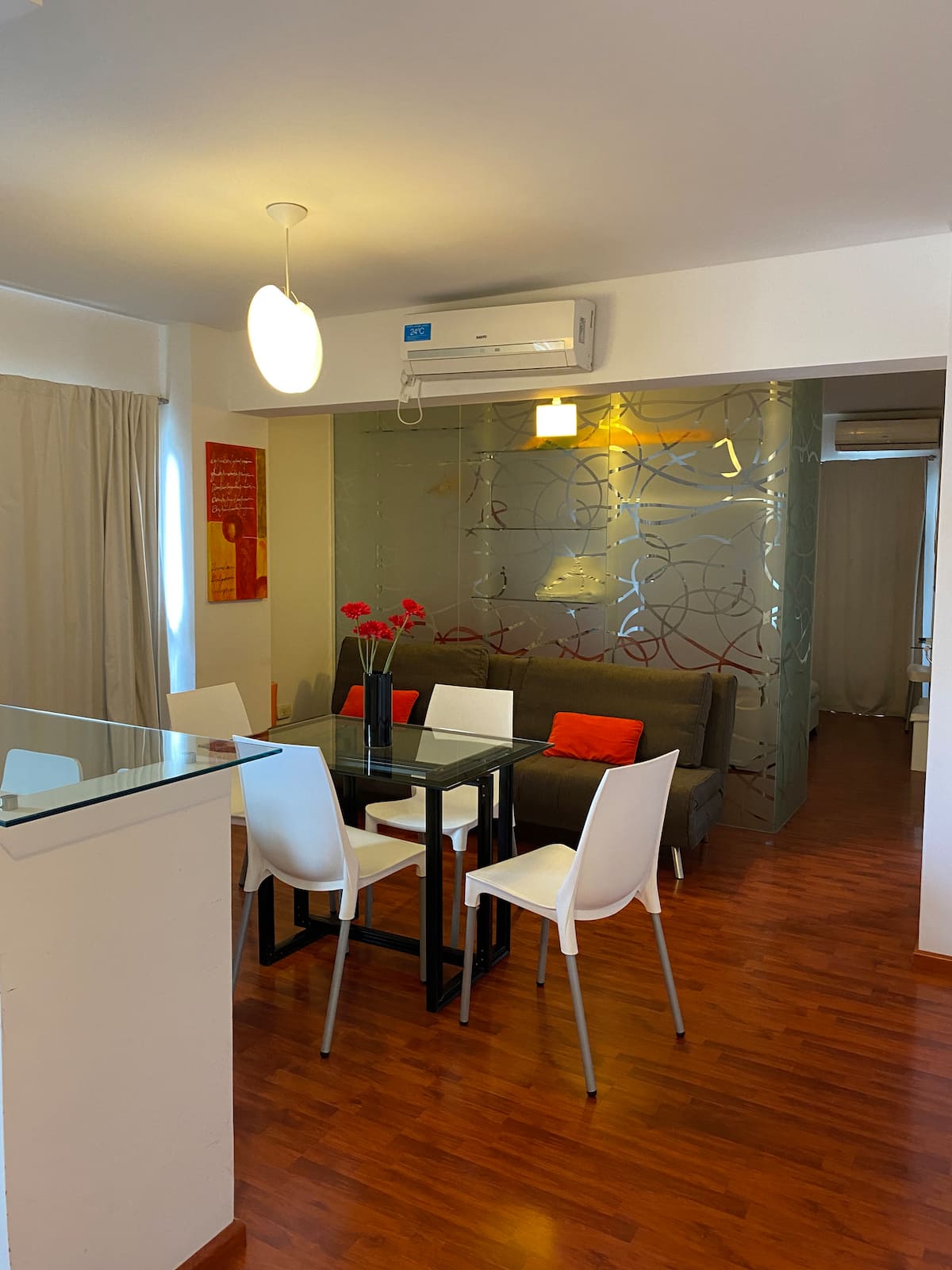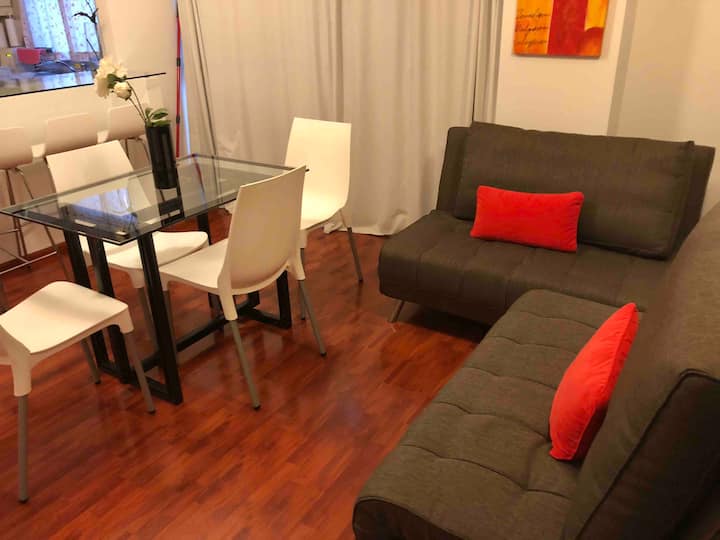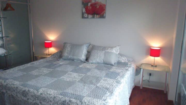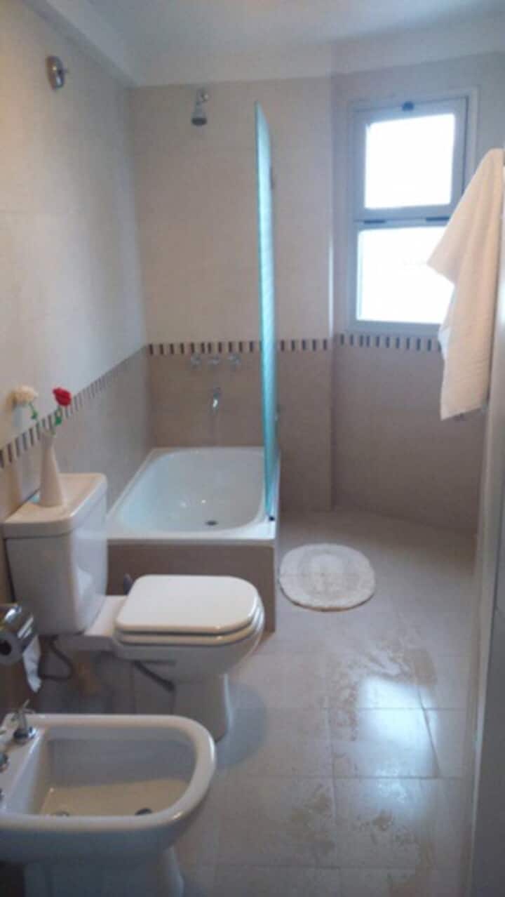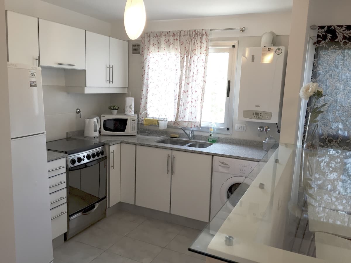 Apartamento em Beccar, mobiliado, com 1 quarto e sala. Cozinha equipada com torradeira, cafeteira, micro-ondas e máquina de lavar, além de utensílios de mesa. Sala com futon e poltrona, ar-condicionado e TV a cabo. Quarto com colchão king size (2x2). Há Wi-Fi e itens de banho, além de roupa de cama.