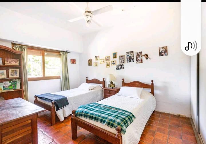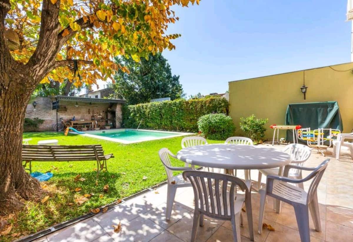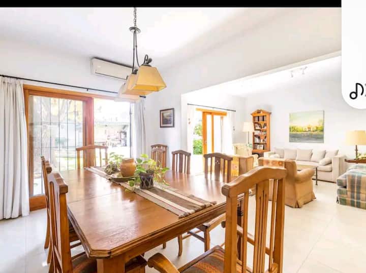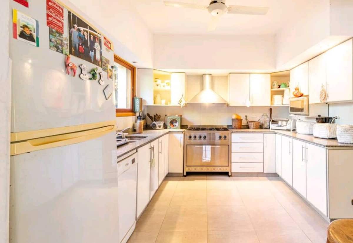 Descrição de unidade em Beccar associada a hospedagem familiar. Acesso a linhas de transporte coletivo e trem, a poucos quarteirões da rodovia. A casa tem piscina e permite uso de churrasqueira e mesa de pingue-pongue. Há uso de cozinha com geladeira e máquina de lavar (lavarropas).