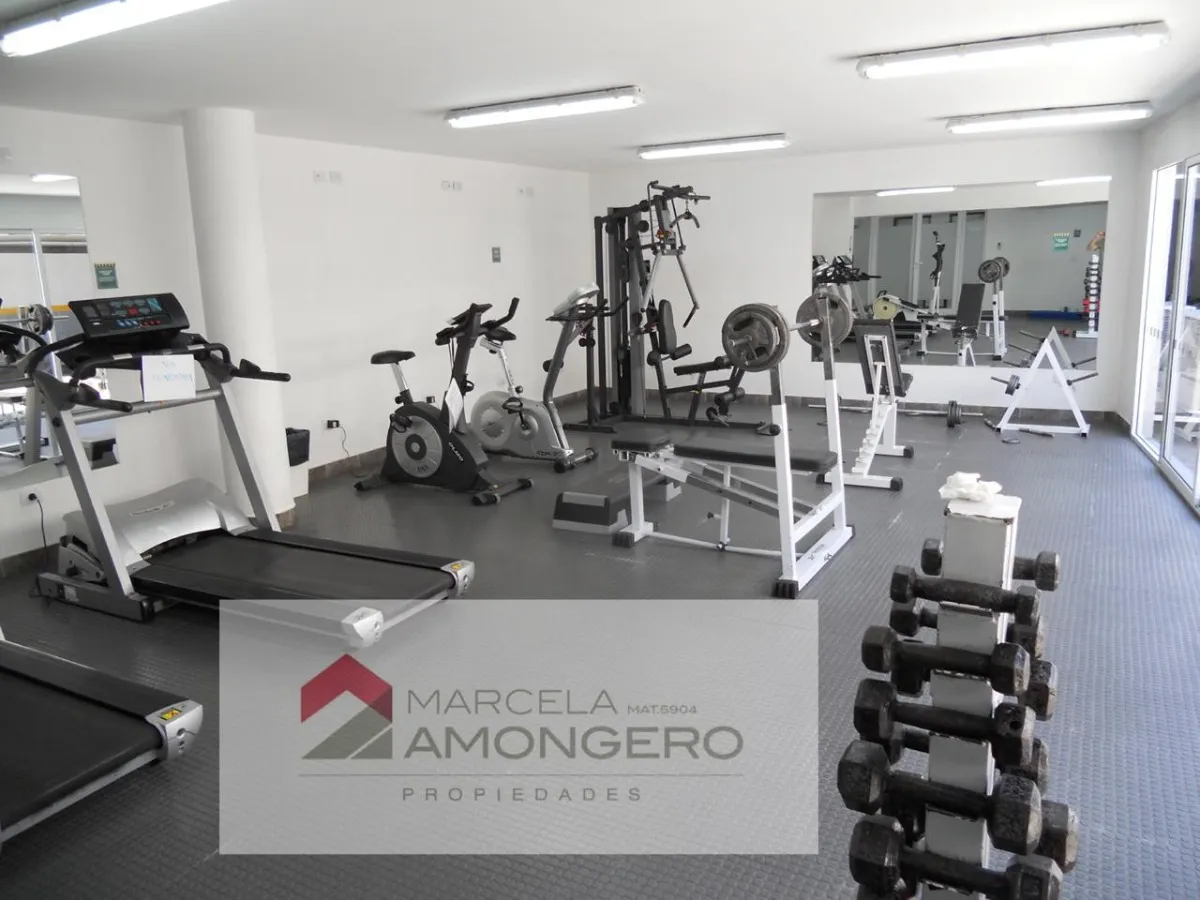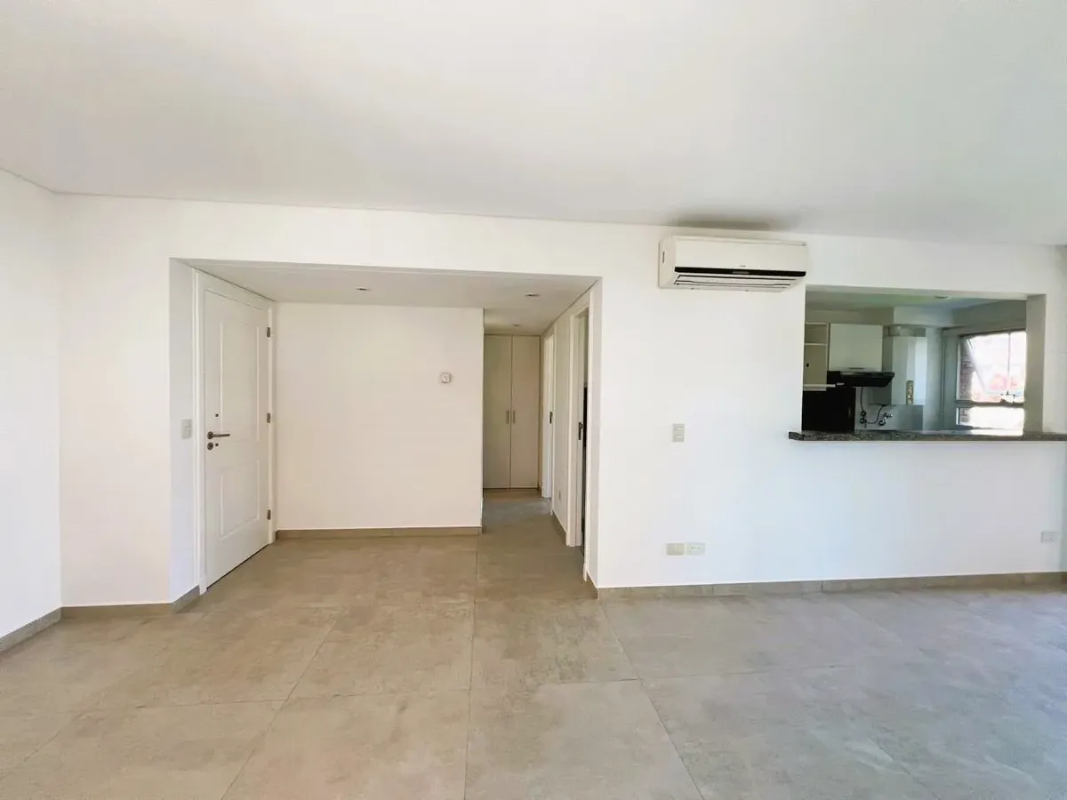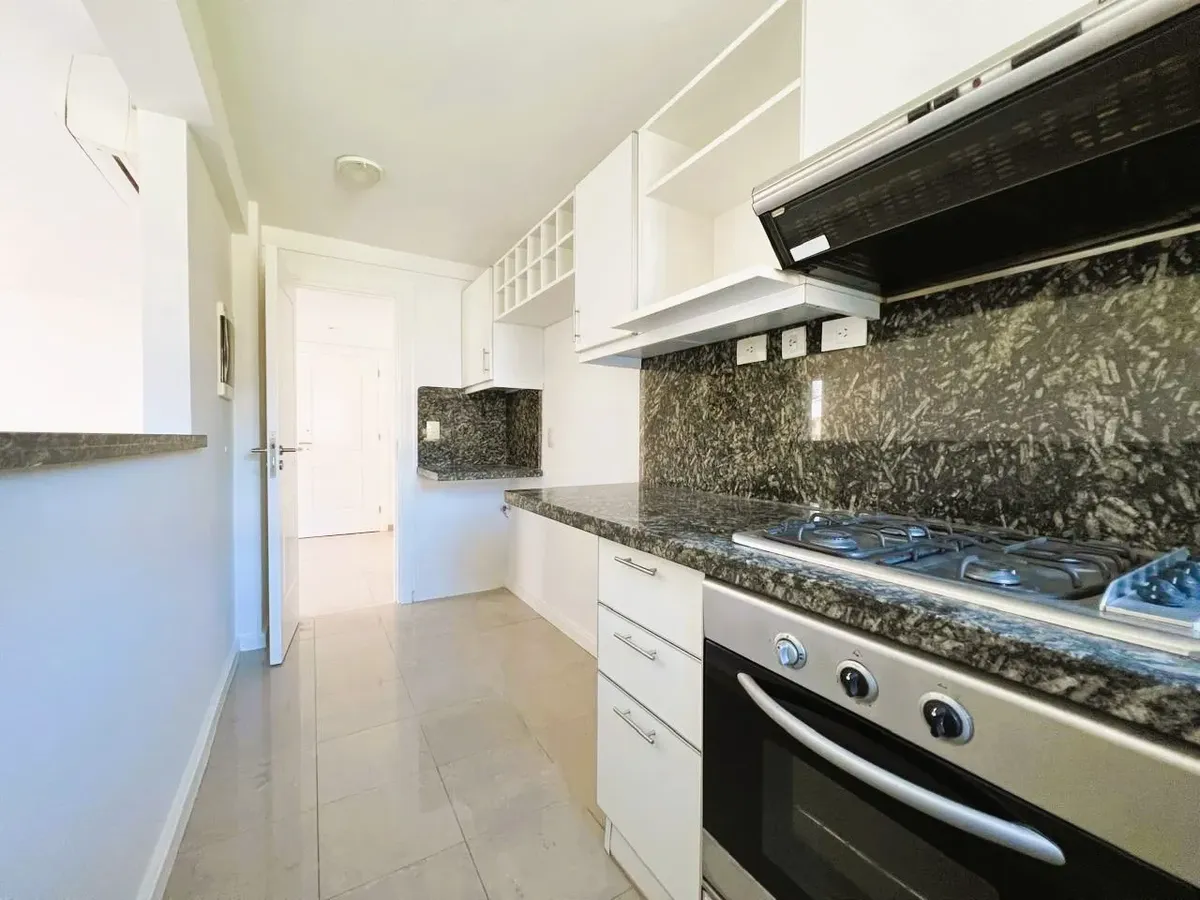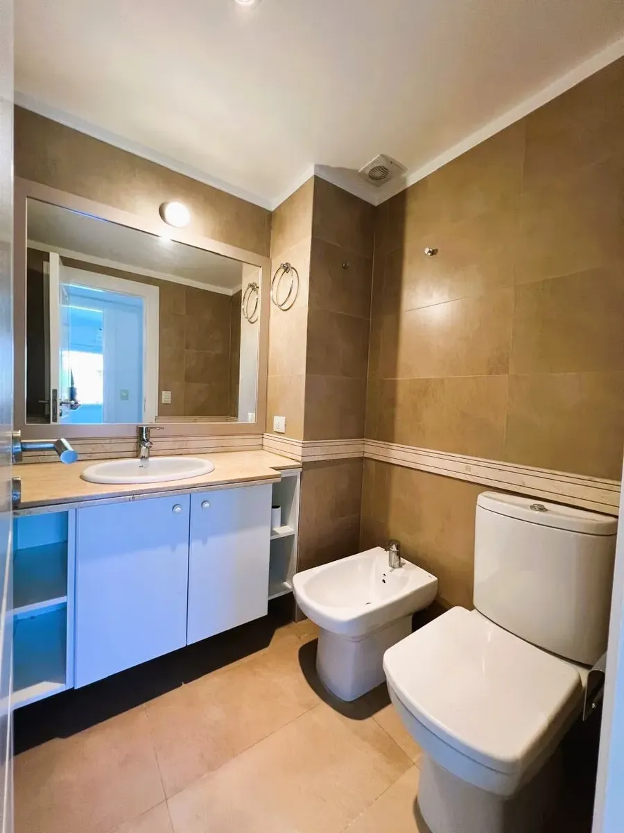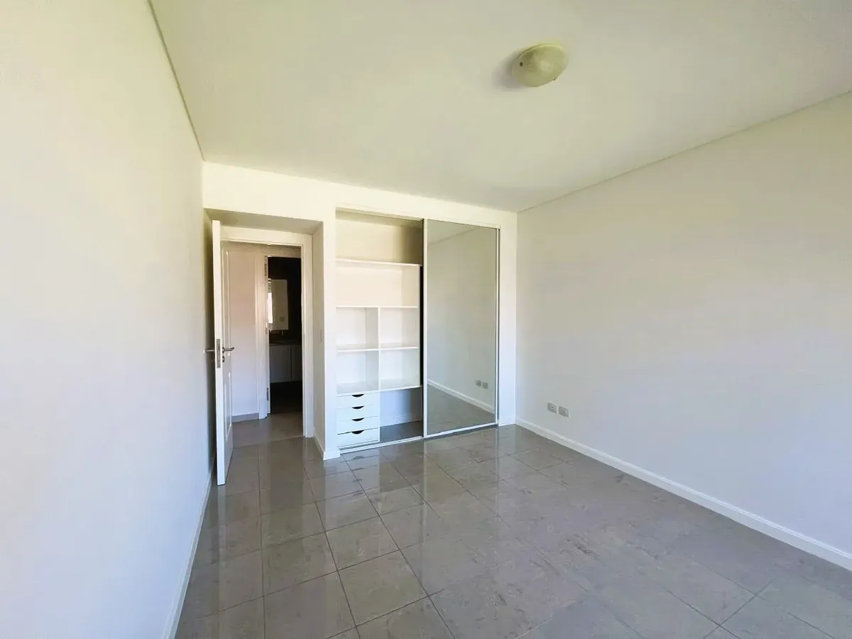 Apartamento de 2 ambientes, 1 quarto, com vista para o jardim central do complexo Beccar Plaza. Living e sala com saída para varanda (2,60 x 1,60 m) e cozinha semi-integrada com bancada, com móveis sob e sobre a pia e espaço para lavadora. O quarto tem armário completo com portas espelhadas e interiores novos; o banheiro completo inclui box e armário para roupa branca. O imóvel é alugado com 1 vaga de garagem coberta no primeiro subsolo, incluída no preço, e conta com 2 aparelhos de ar-condicion
