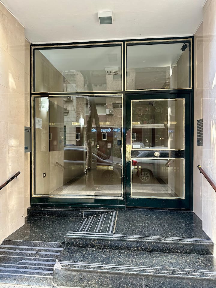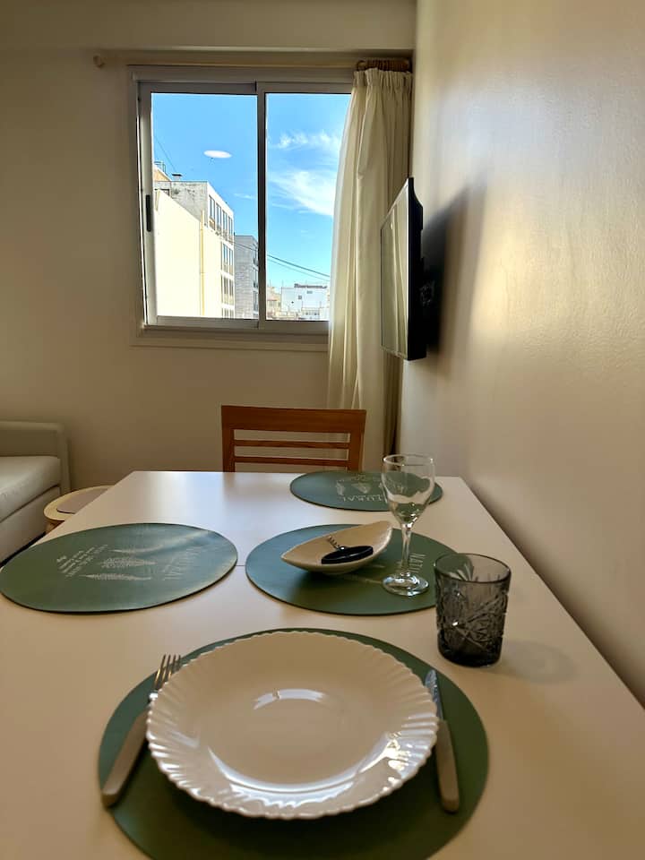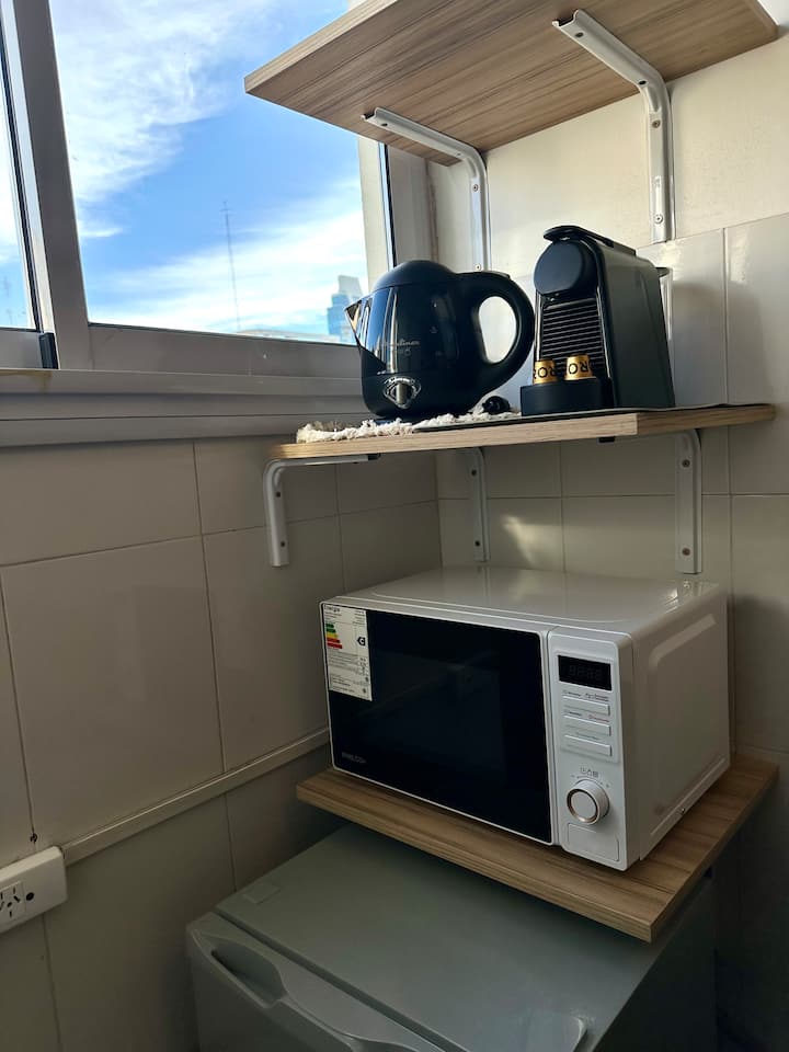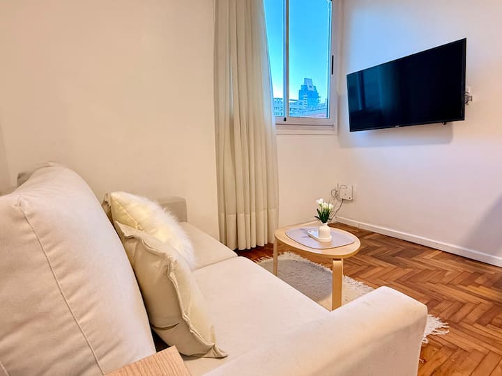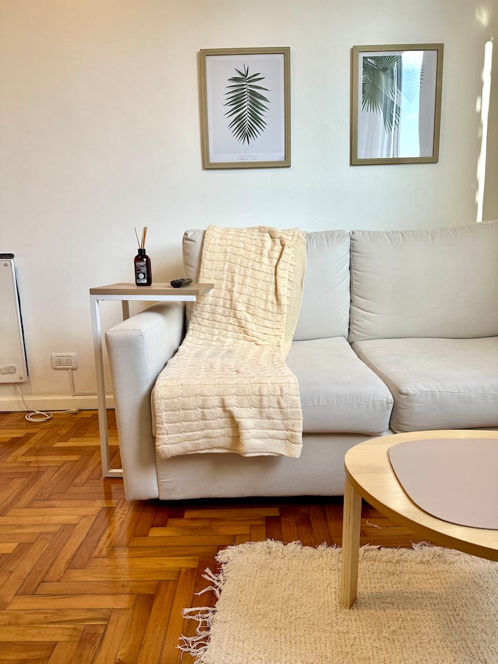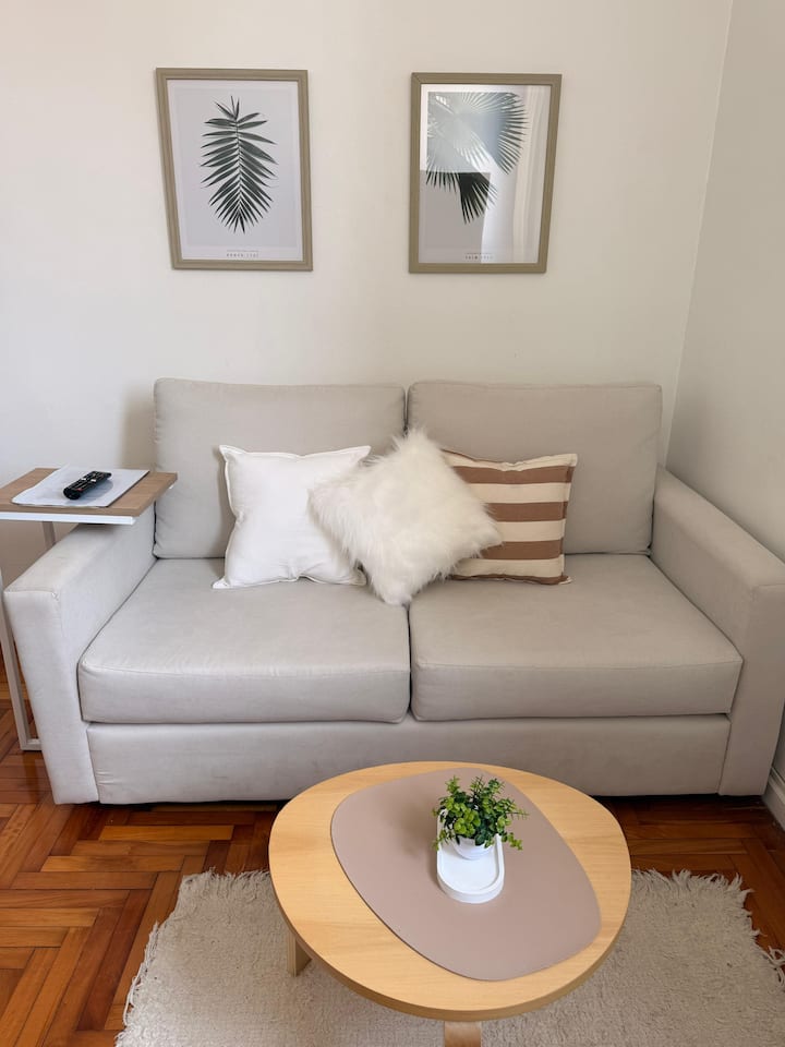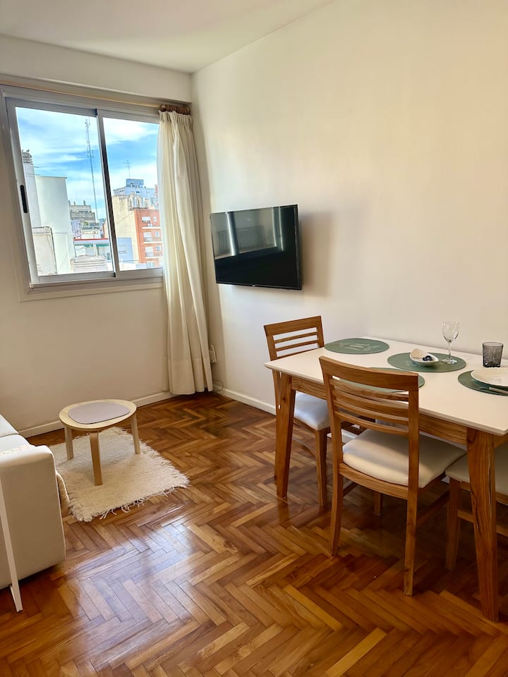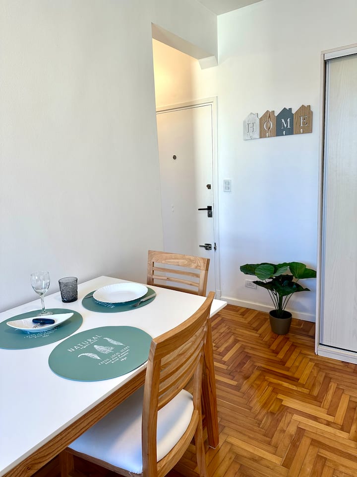 Apartamento de 2 ambientes reformado, com 1 quarto e 1 banheiro. Cozinha equipada com geladeira com freezer, forno e fogão a gás, micro-ondas, cafeteira e torradeira. Sala de estar com mesa e espaço para TV ou leitura. Localizado na interseção de O'Higgins e Juramento, em Belgrano, com estacionamento na rua e vaga privada a 100 metros; próximo à estação do metrô Linha D e a paradas de ônibus, além de comércios e supermercados.