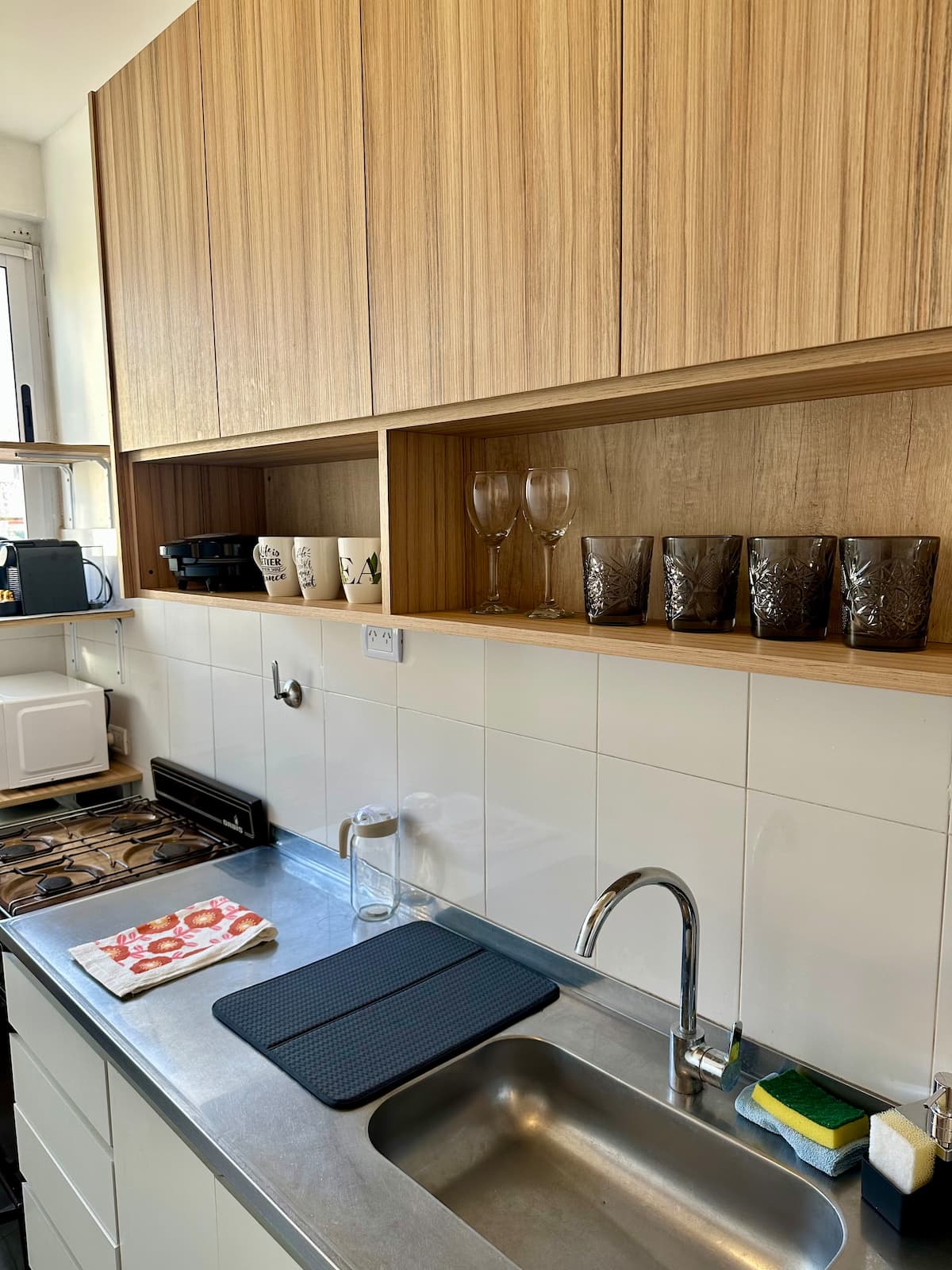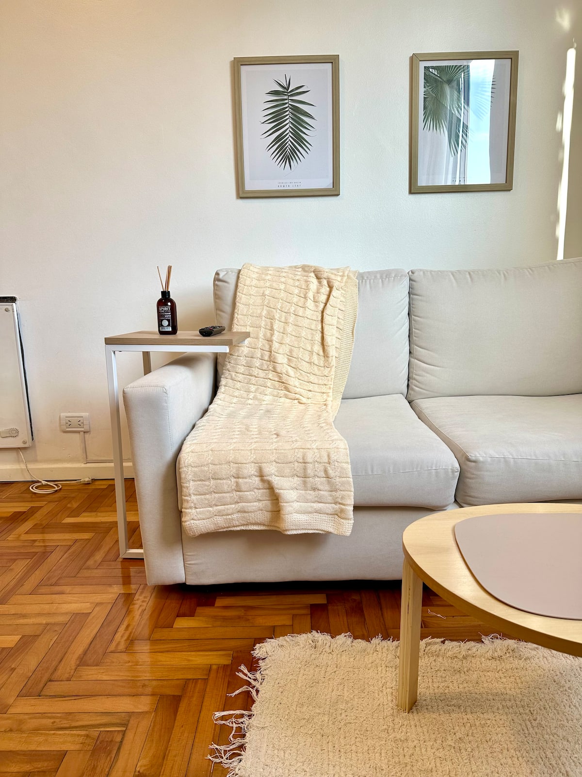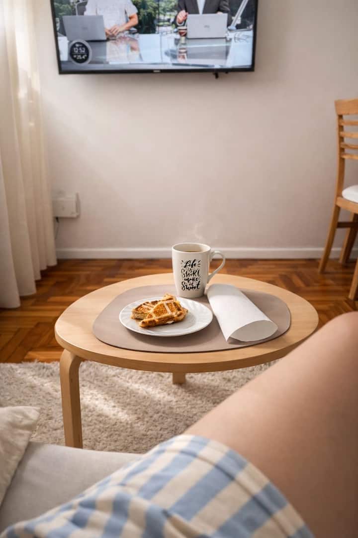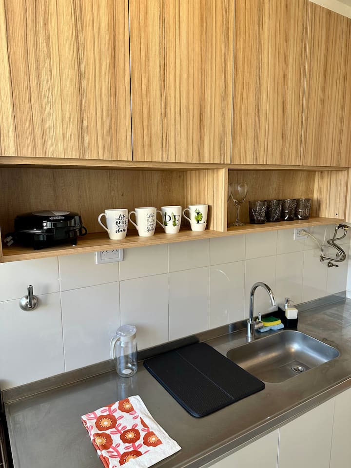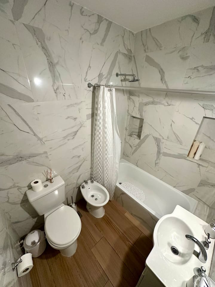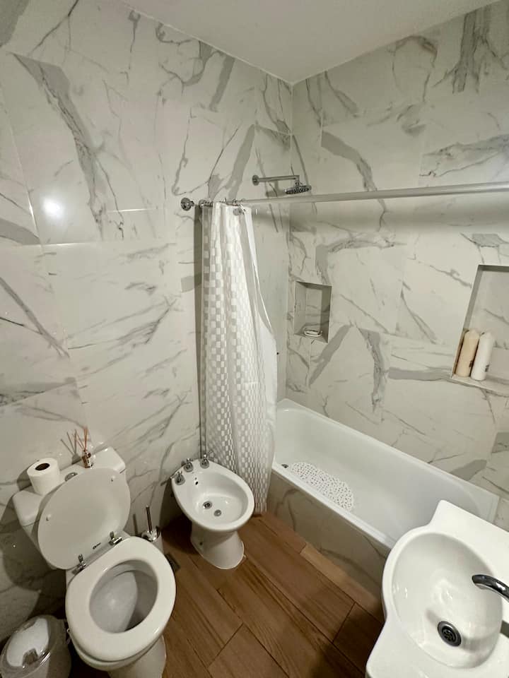 Apartamento de 2 ambientes reformado, com 1 quarto e 1 banheiro. Cozinha equipada com geladeira com freezer, forno e fogão a gás, micro-ondas, cafeteira e torradeira. Sala de estar com mesa e espaço para TV ou leitura. Localizado na interseção de O'Higgins e Juramento, em Belgrano, com estacionamento na rua e vaga privada a 100 metros; próximo à estação do metrô Linha D e a paradas de ônibus, além de comércios e supermercados.