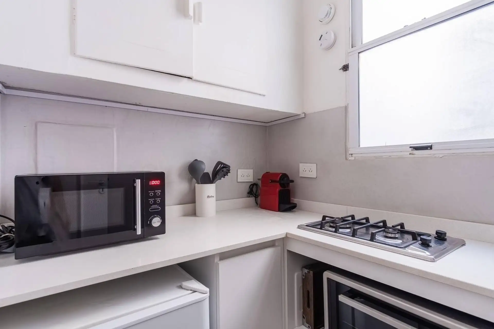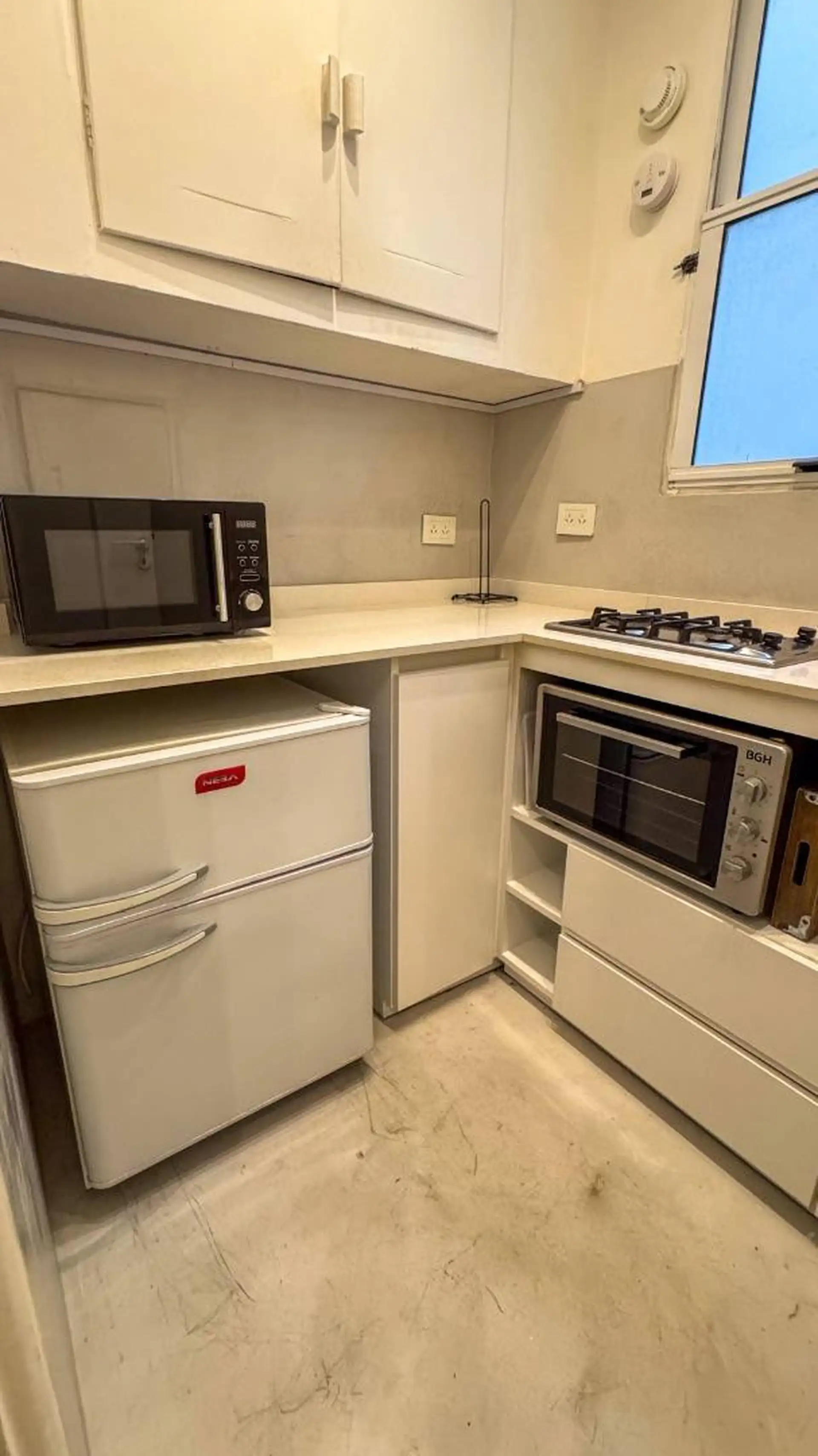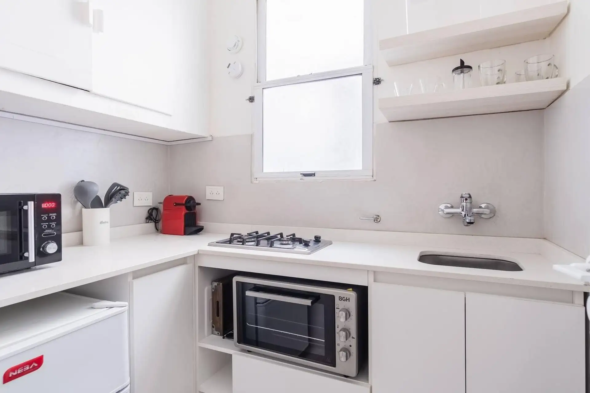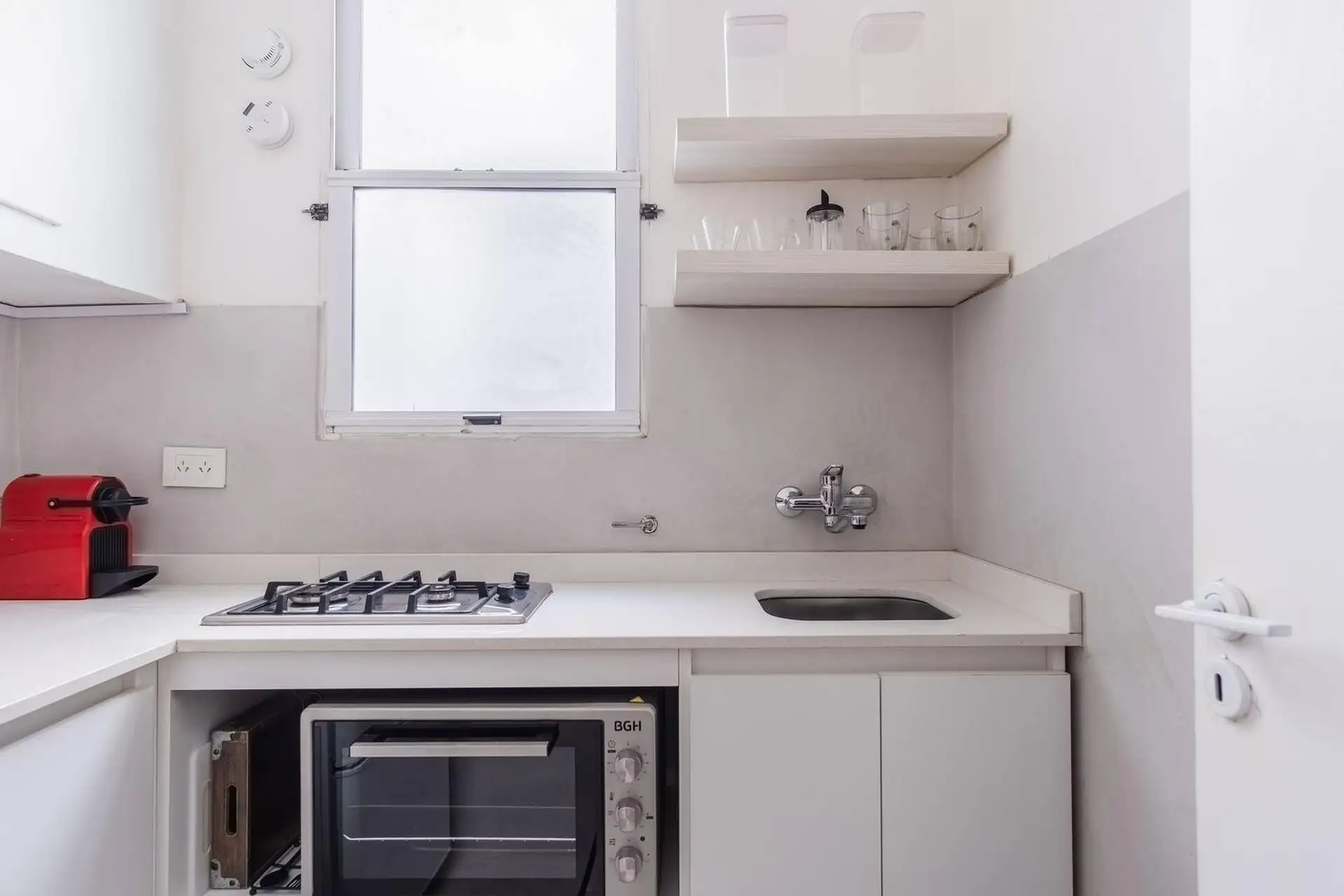 Kitnet em Belgrano, com cozinha equipada, 1 cama e 1 banheiro. Fica no primeiro andar, com acesso apenas por escada. Tem ar-condicionado, TV, Wi-Fi (114 Mbps), banheiro com banheira e secador de cabelo; geladeira Meba. Há estacionamento gratuito na rua. O imóvel é mobiliado e reformado, com serviços de esgoto cloacas e gás.
