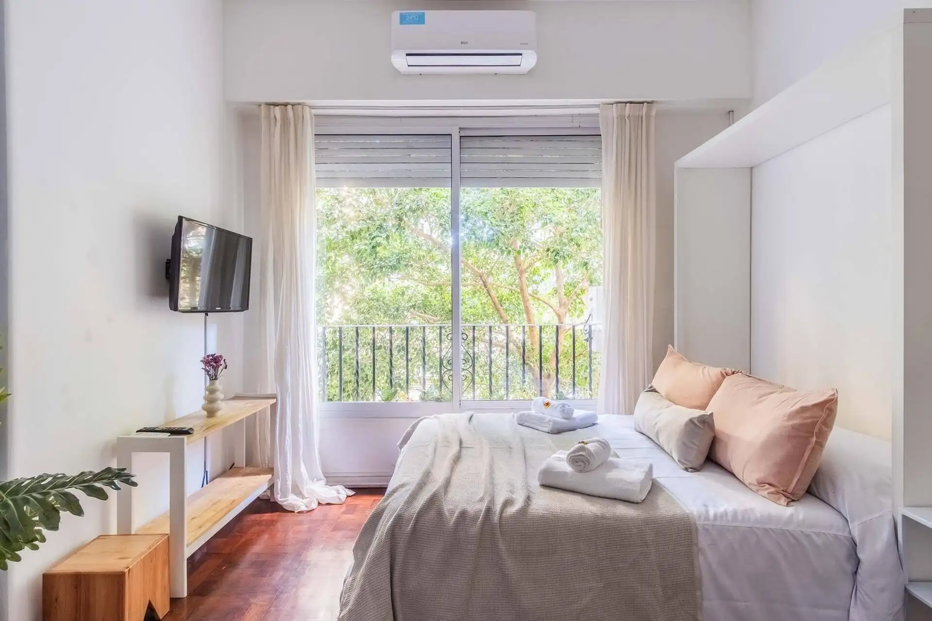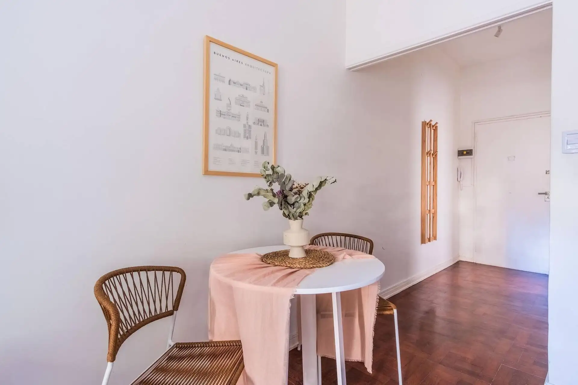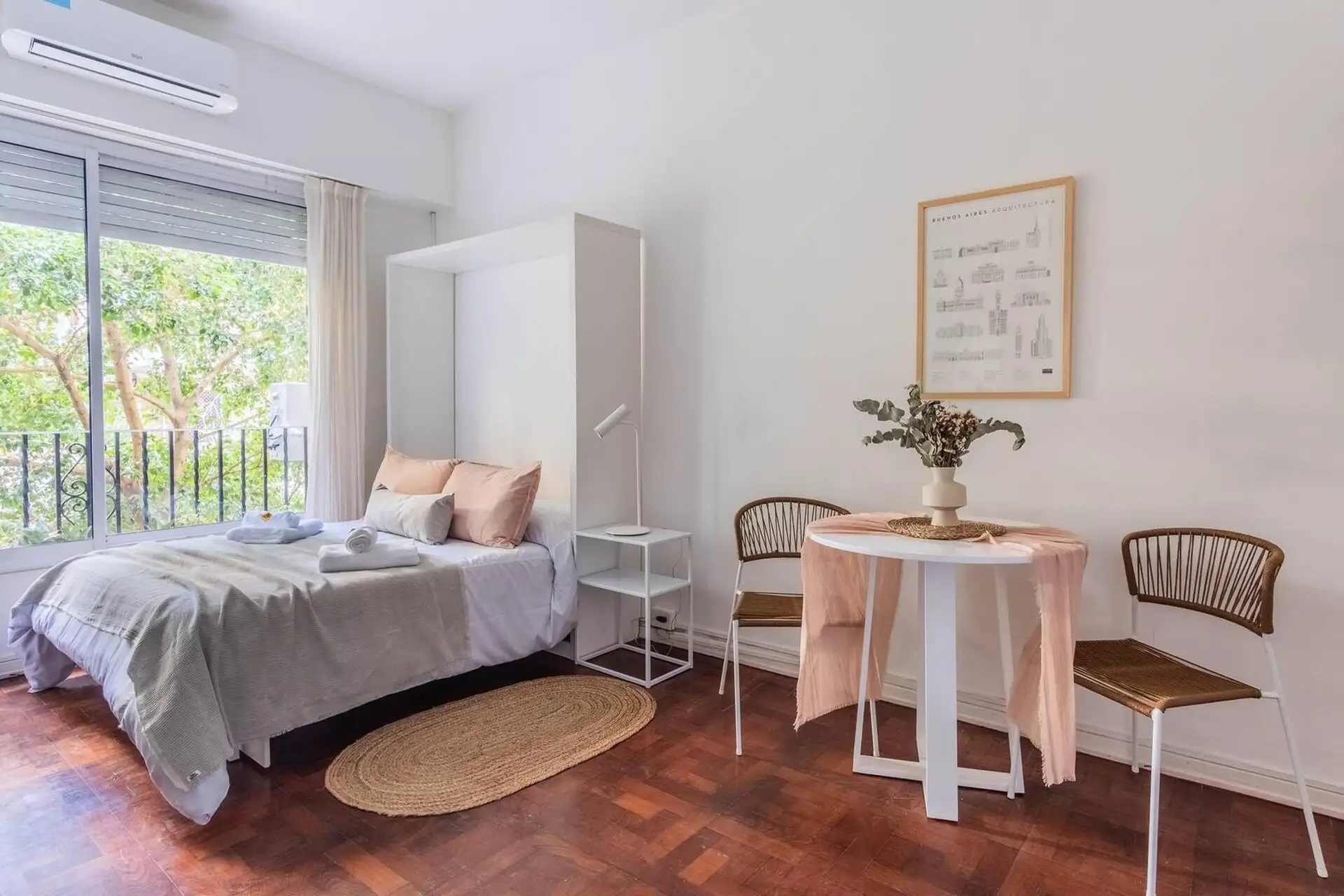 Kitnet em Belgrano, com cozinha equipada, 1 cama e 1 banheiro. Fica no primeiro andar, com acesso apenas por escada. Tem ar-condicionado, TV, Wi-Fi (114 Mbps), banheiro com banheira e secador de cabelo; geladeira Meba. Há estacionamento gratuito na rua. O imóvel é mobiliado e reformado, com serviços de esgoto cloacas e gás.