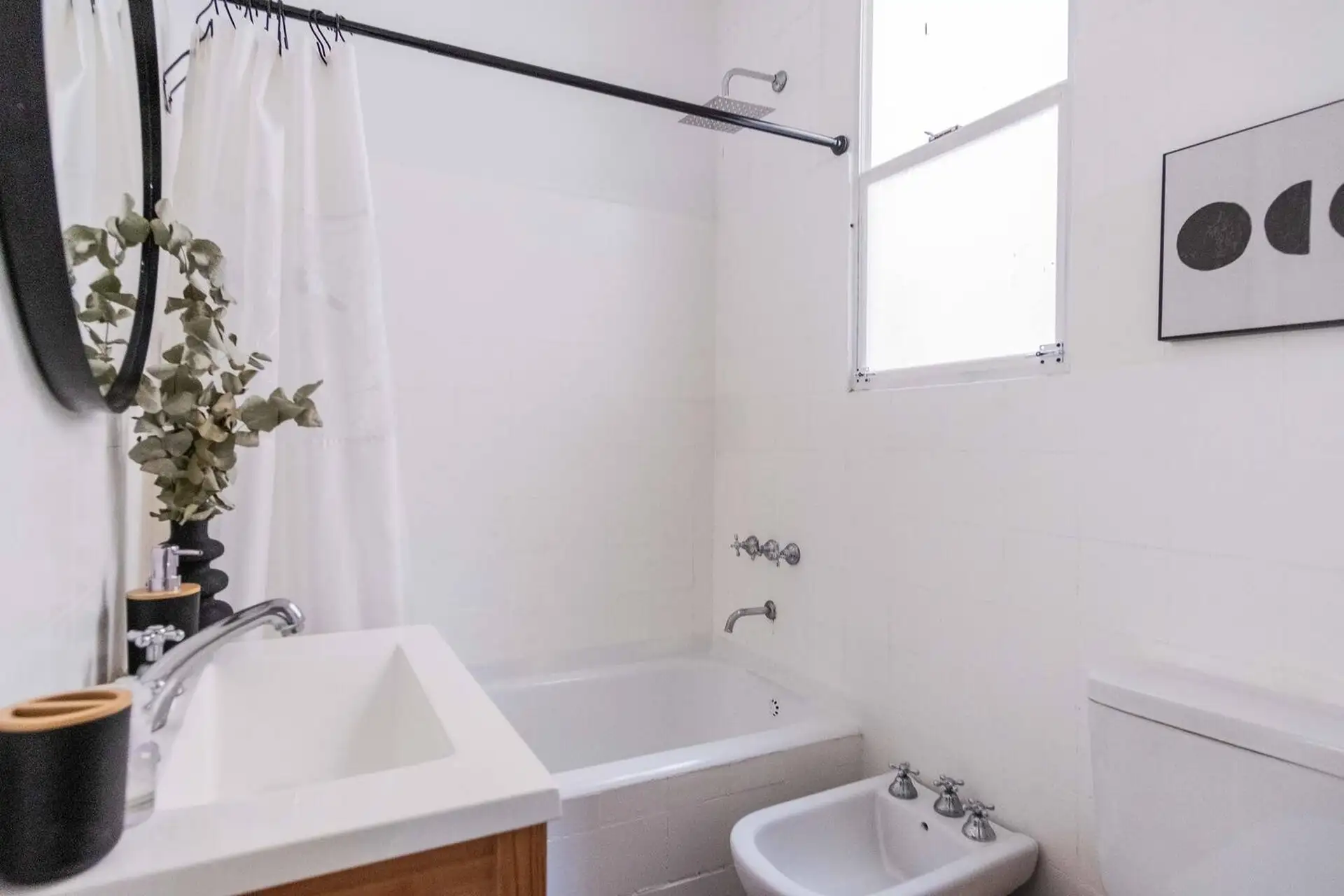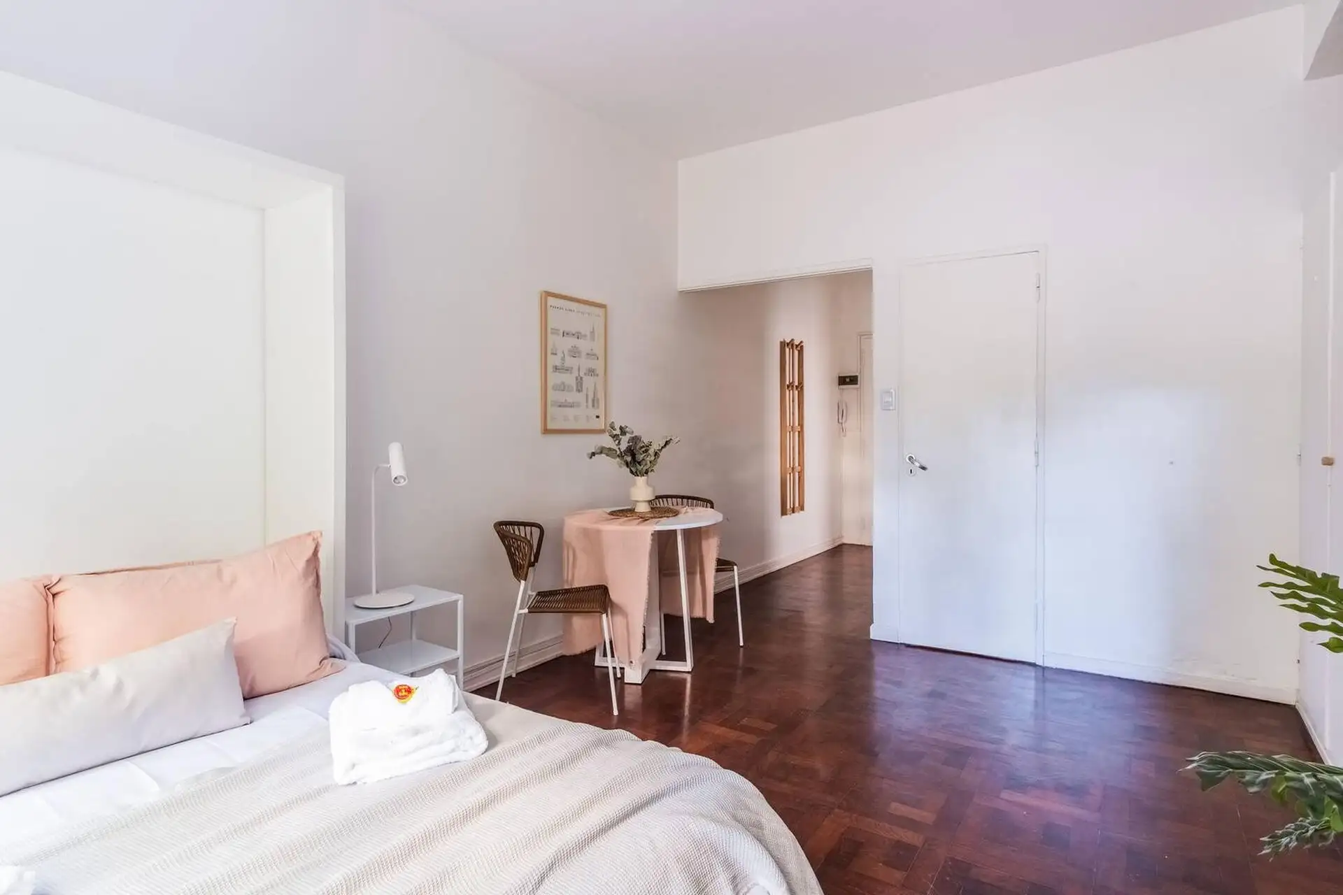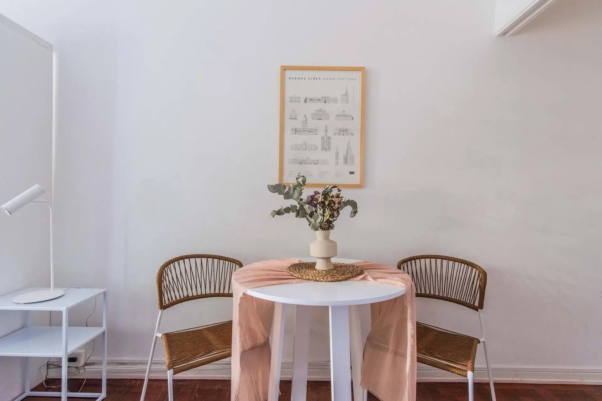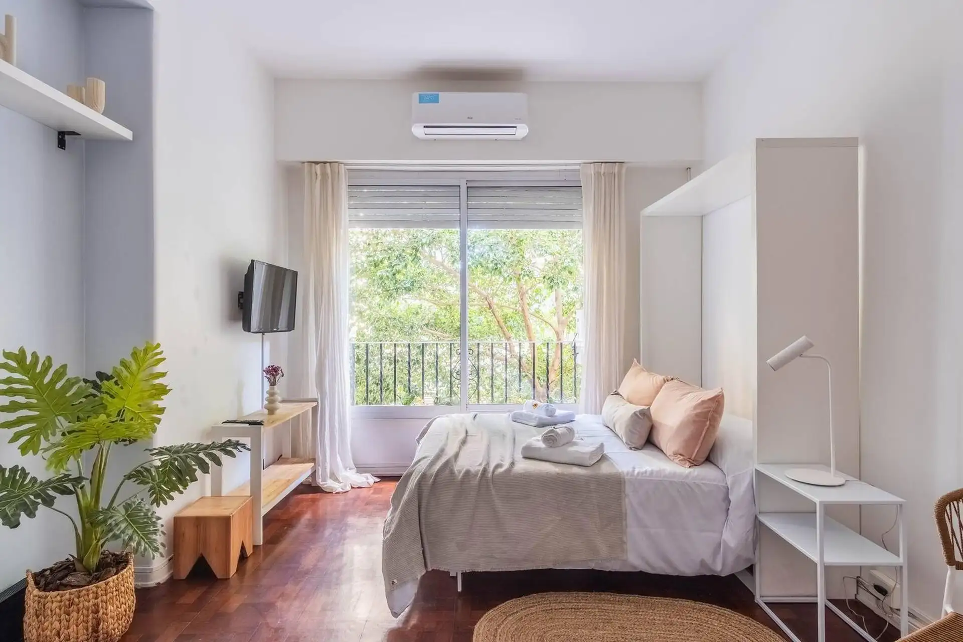 Kitnet em Belgrano, com cozinha equipada, 1 cama e 1 banheiro. Fica no primeiro andar, com acesso apenas por escada. Tem ar-condicionado, TV, Wi-Fi (114 Mbps), banheiro com banheira e secador de cabelo; geladeira Meba. Há estacionamento gratuito na rua. O imóvel é mobiliado e reformado, com serviços de esgoto cloacas e gás.