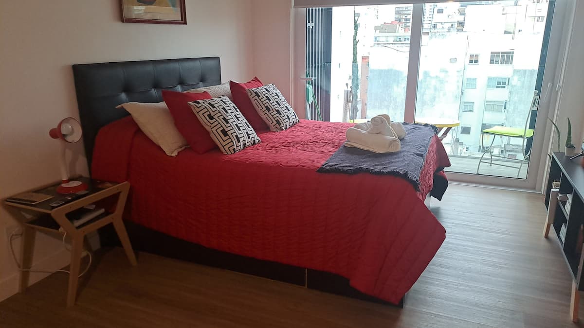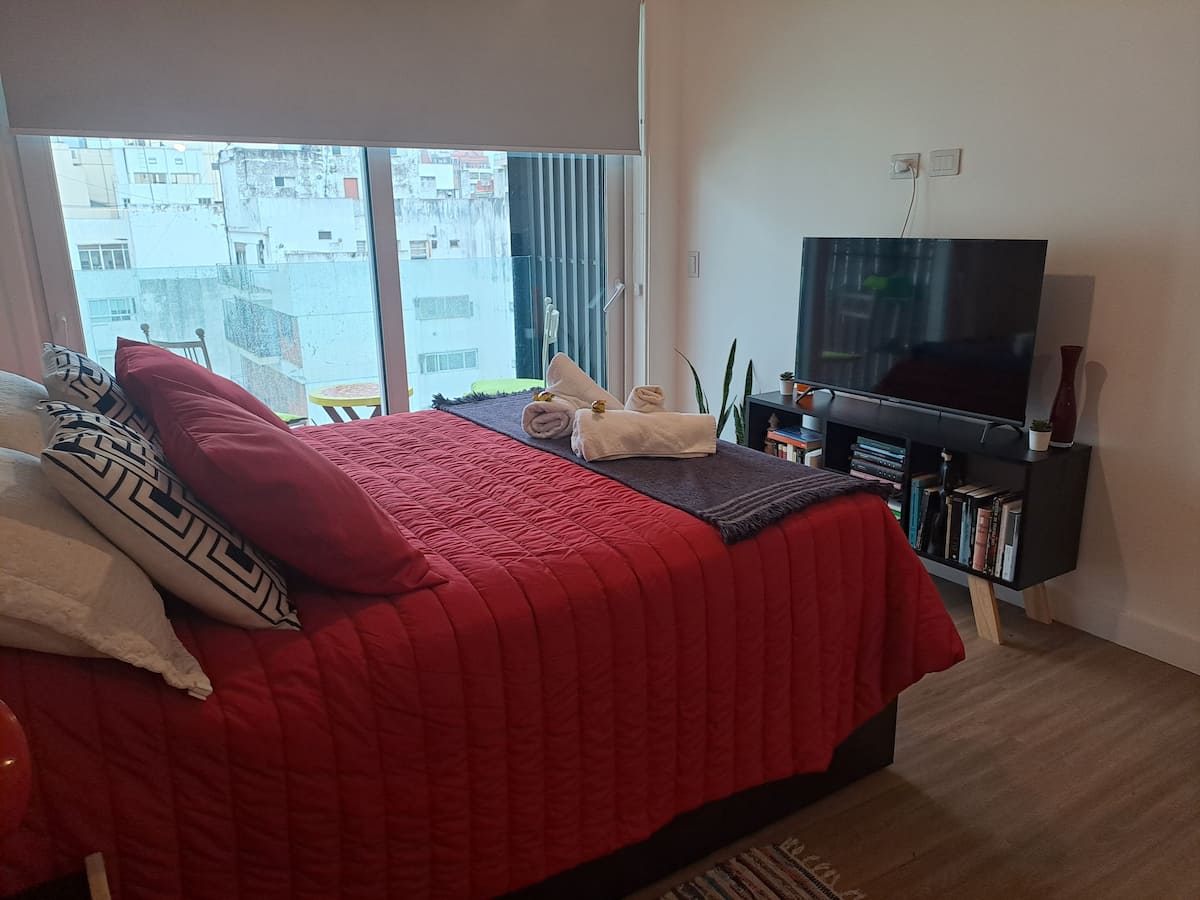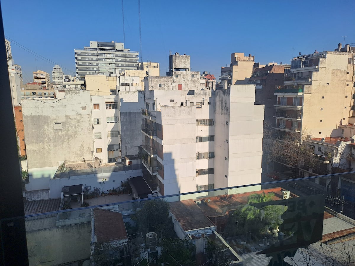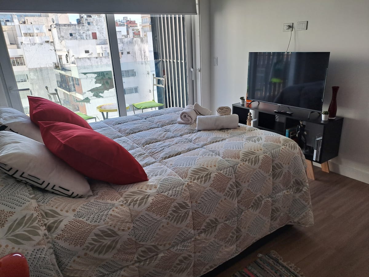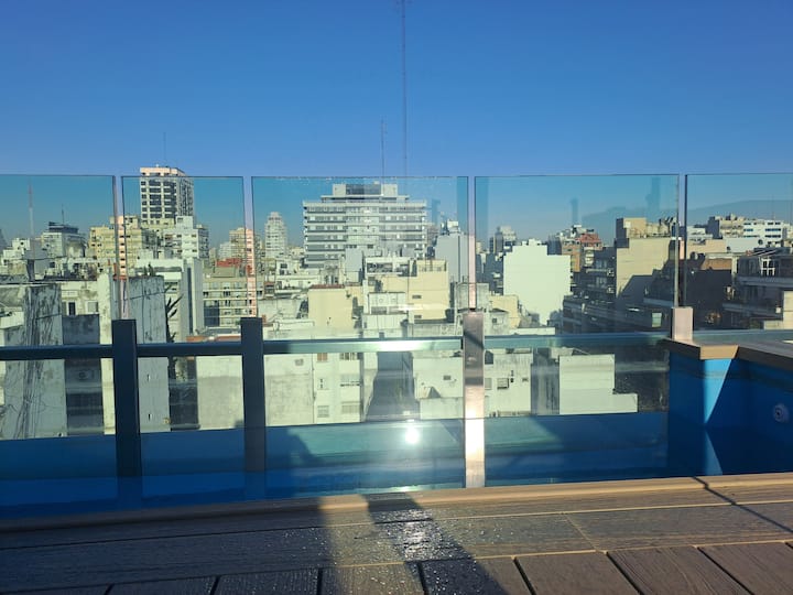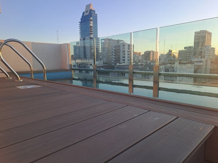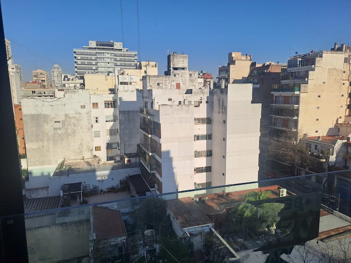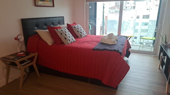 Apartamento de 1 quarto em Belgrano, com 30 m². Quarto integrado à sala. Possui ar-condicionado com controle remoto e aquecimento por piso radiante. O imóvel tem varanda com vista aberta e acesso a piscina no prédio.