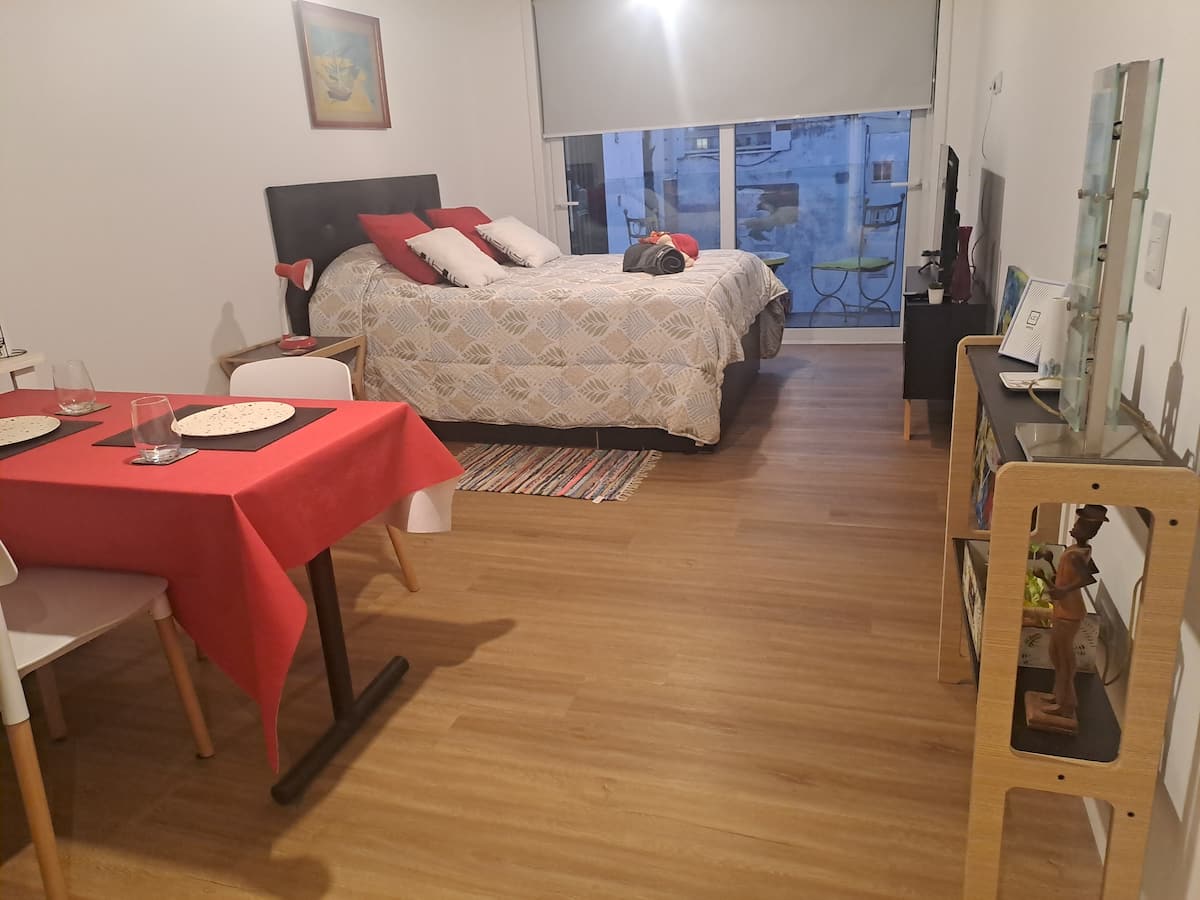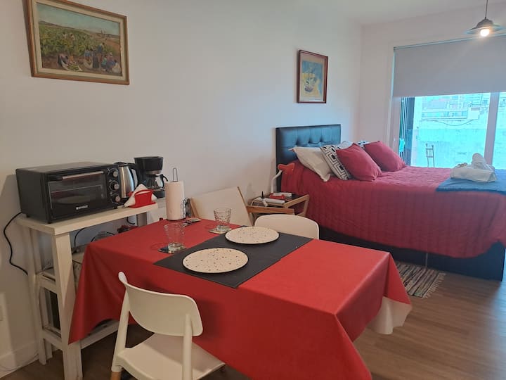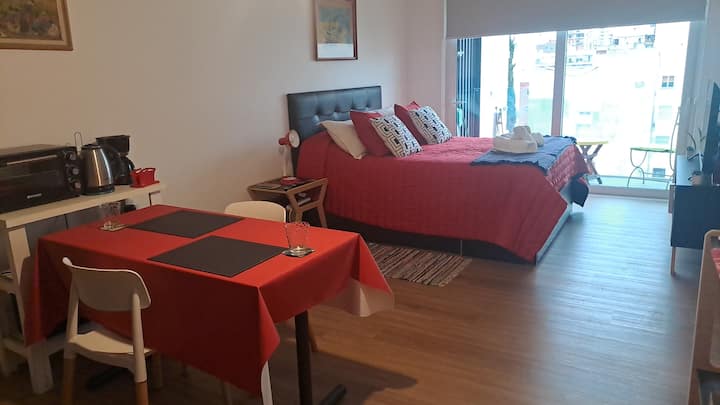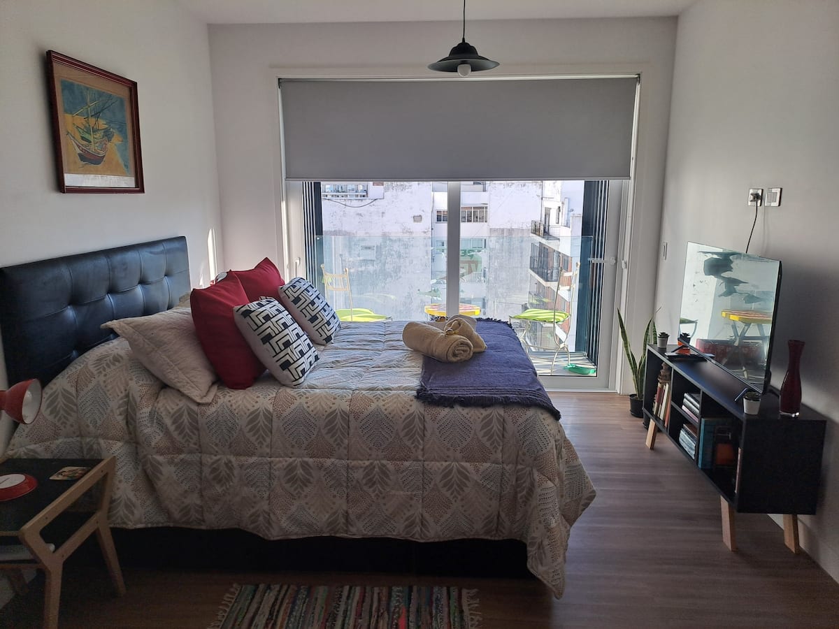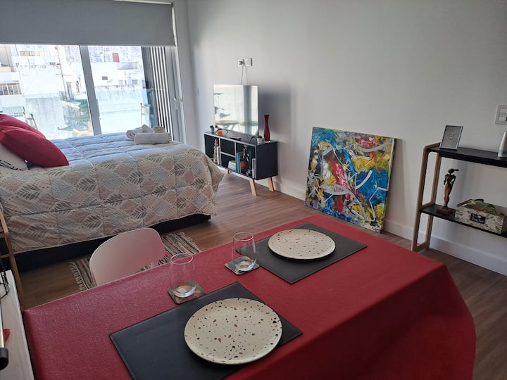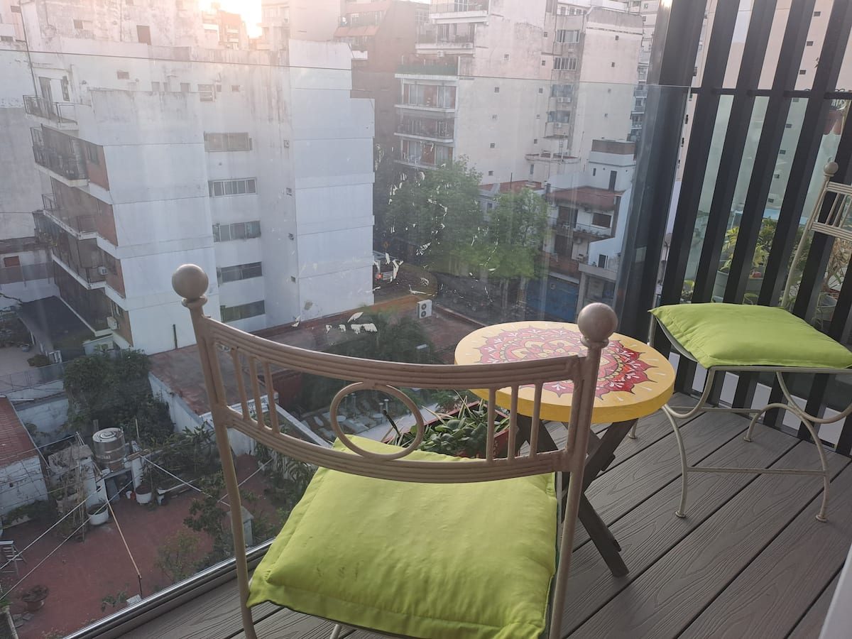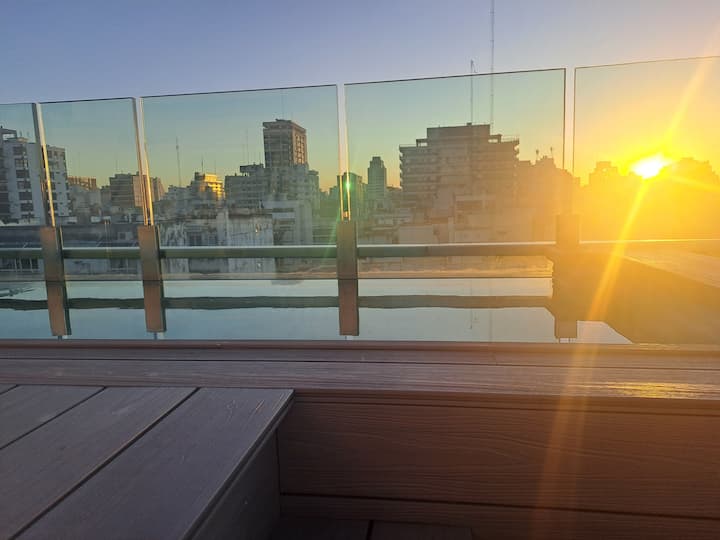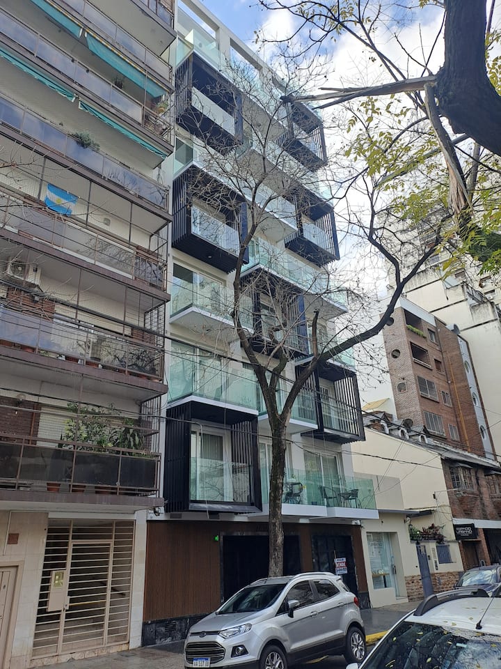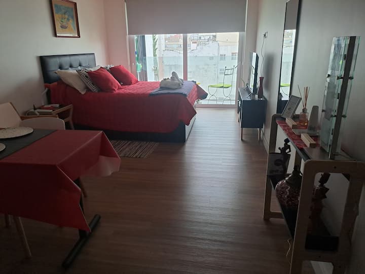 Apartamento de 1 quarto em Belgrano, com 30 m². Quarto integrado à sala. Possui ar-condicionado com controle remoto e aquecimento por piso radiante. O imóvel tem varanda com vista aberta e acesso a piscina no prédio.