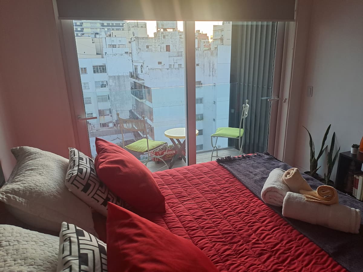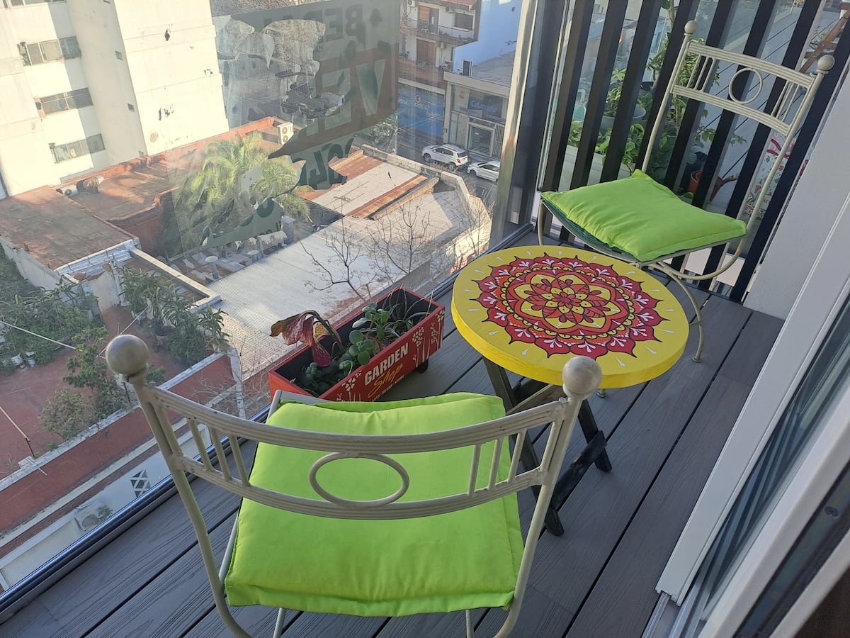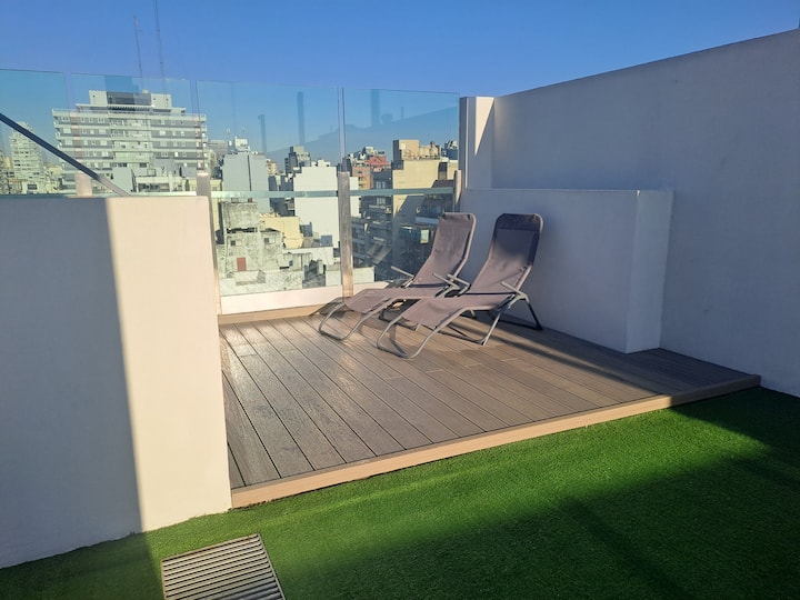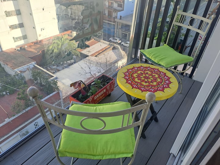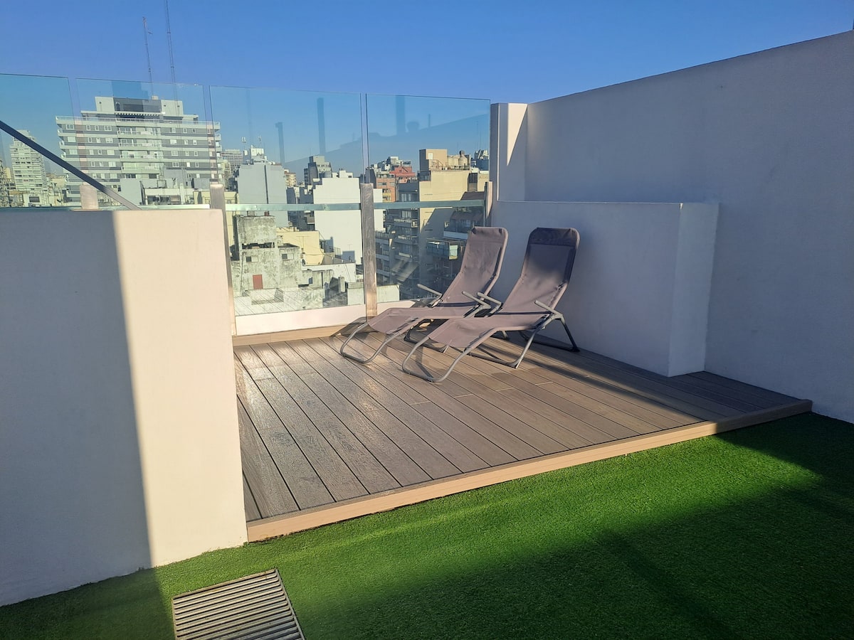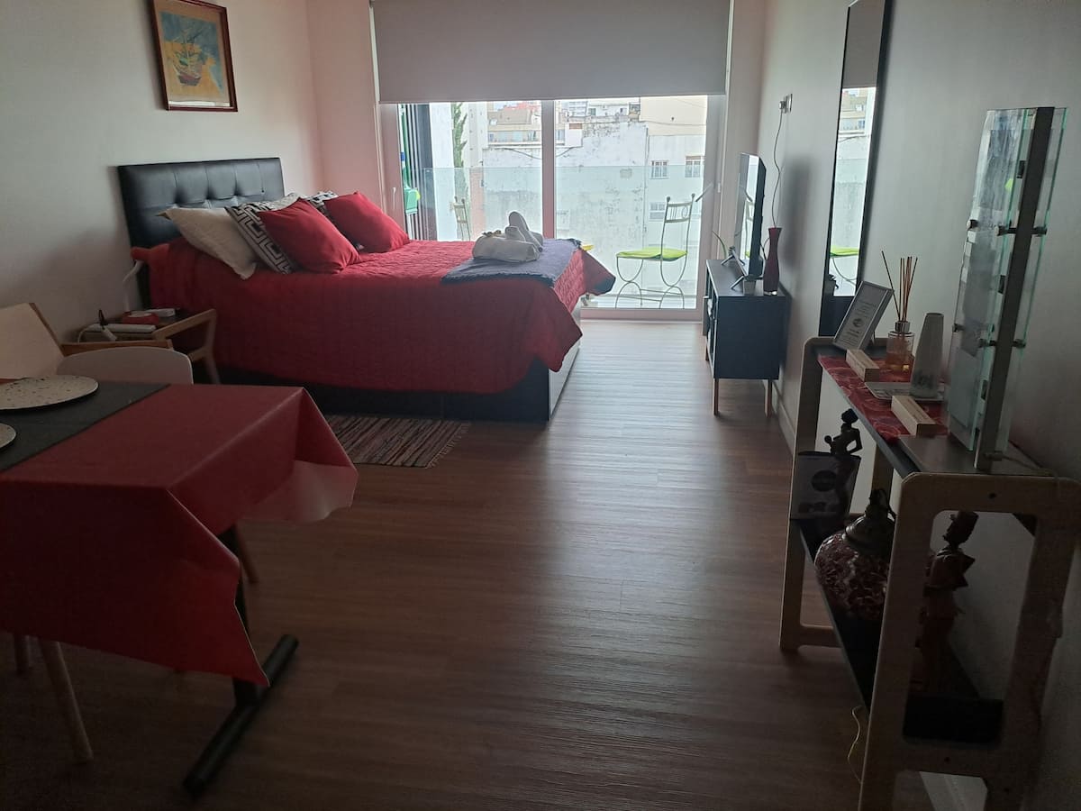 Apartamento de 1 quarto em Belgrano, com 30 m². Quarto integrado à sala. Possui ar-condicionado com controle remoto e aquecimento por piso radiante. O imóvel tem varanda com vista aberta e acesso a piscina no prédio.