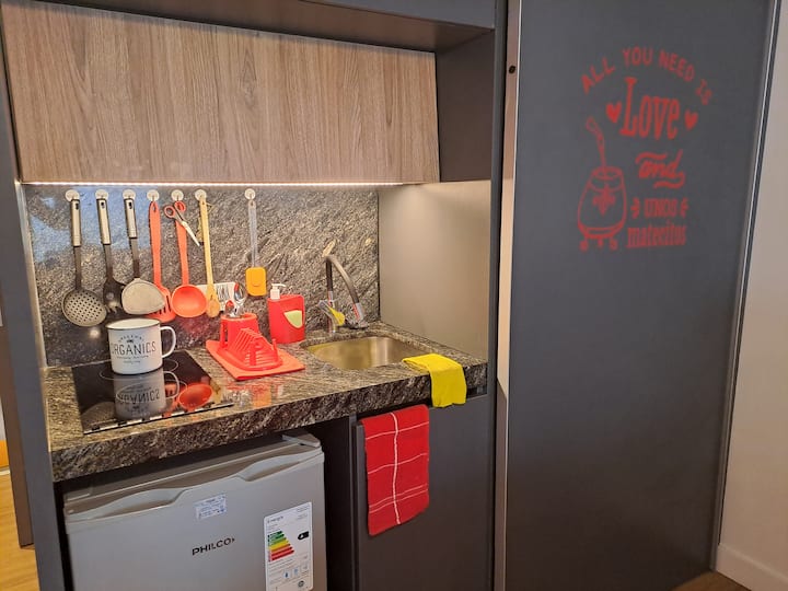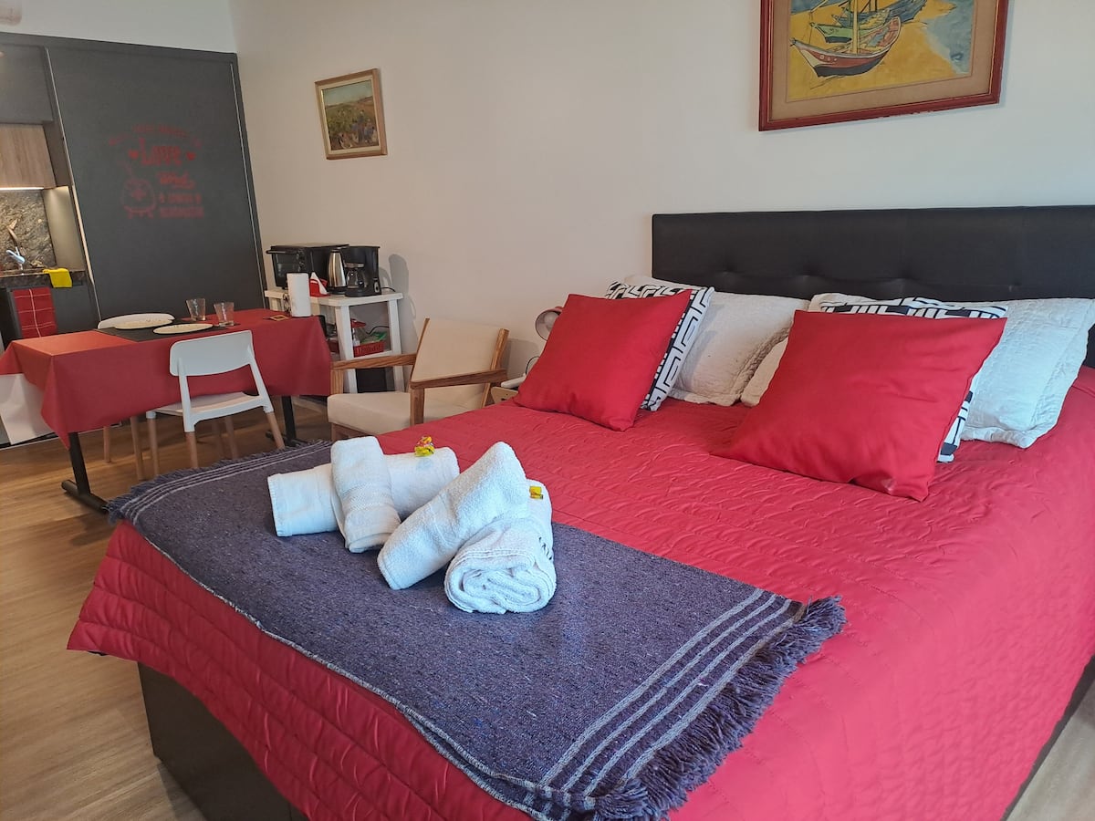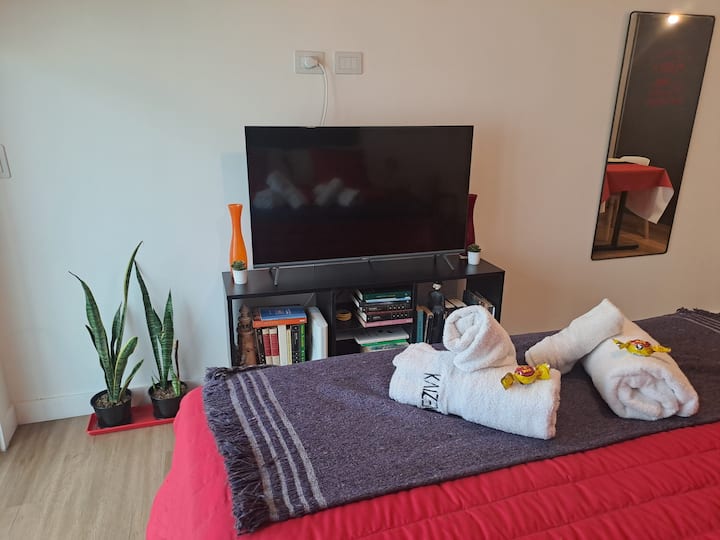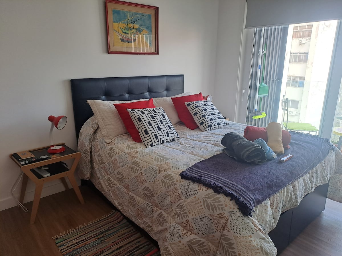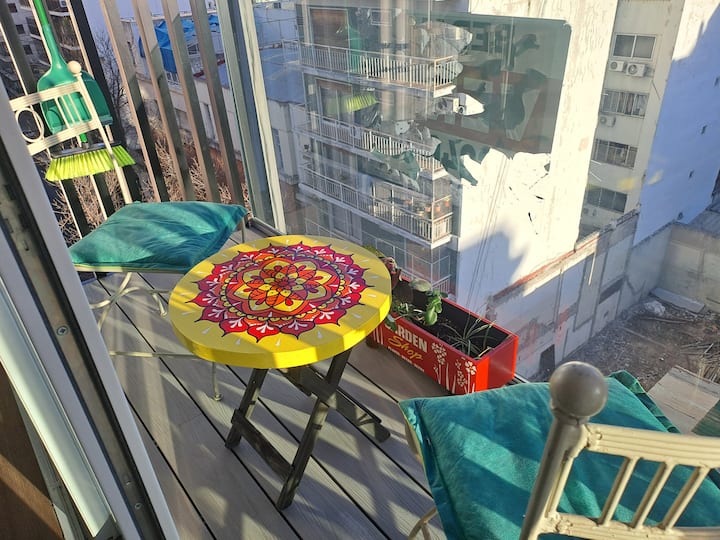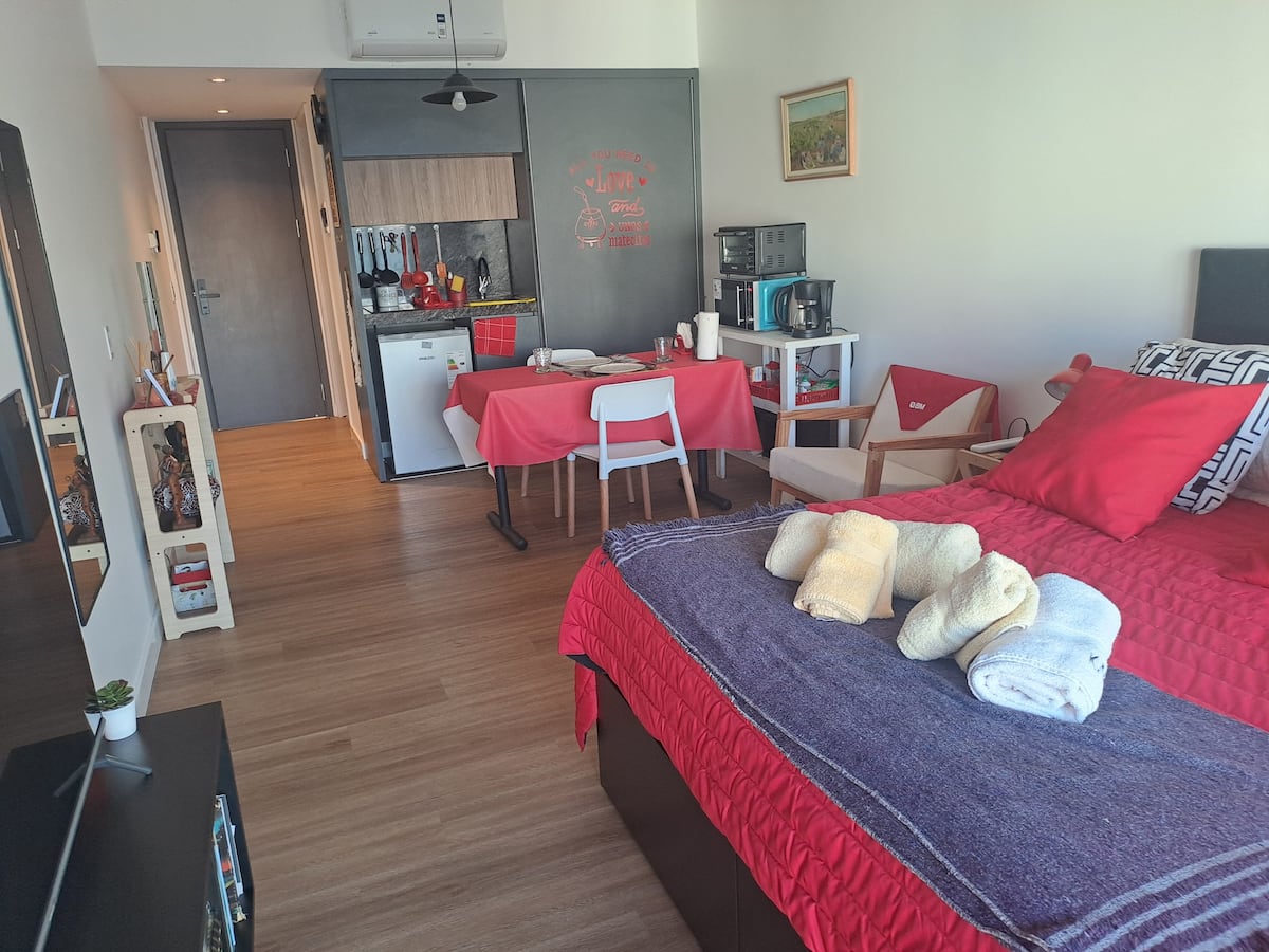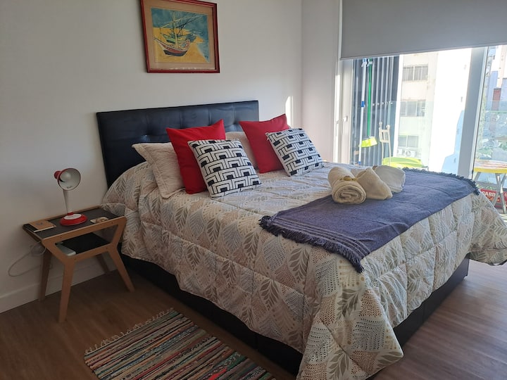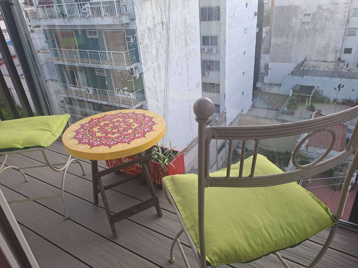 Apartamento de 1 quarto em Belgrano, com 30 m². Quarto integrado à sala. Possui ar-condicionado com controle remoto e aquecimento por piso radiante. O imóvel tem varanda com vista aberta e acesso a piscina no prédio.
