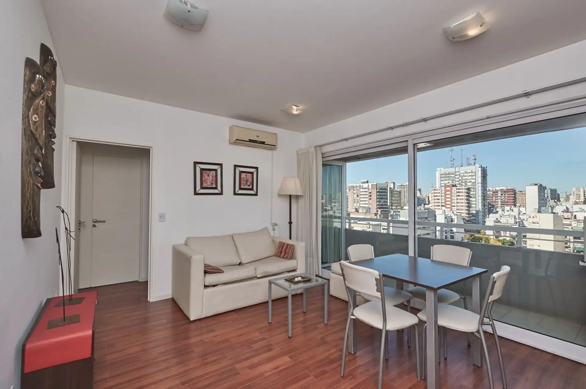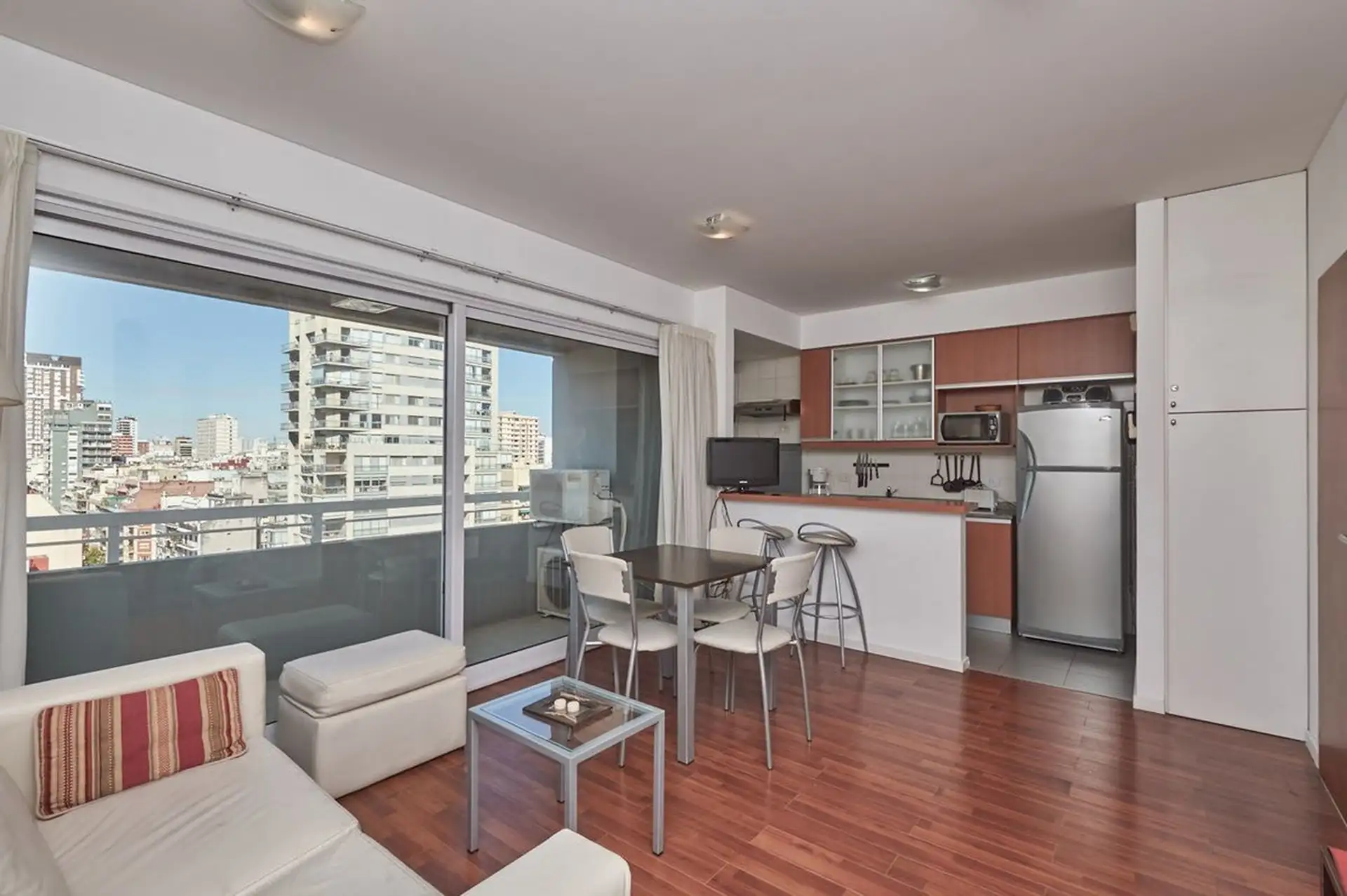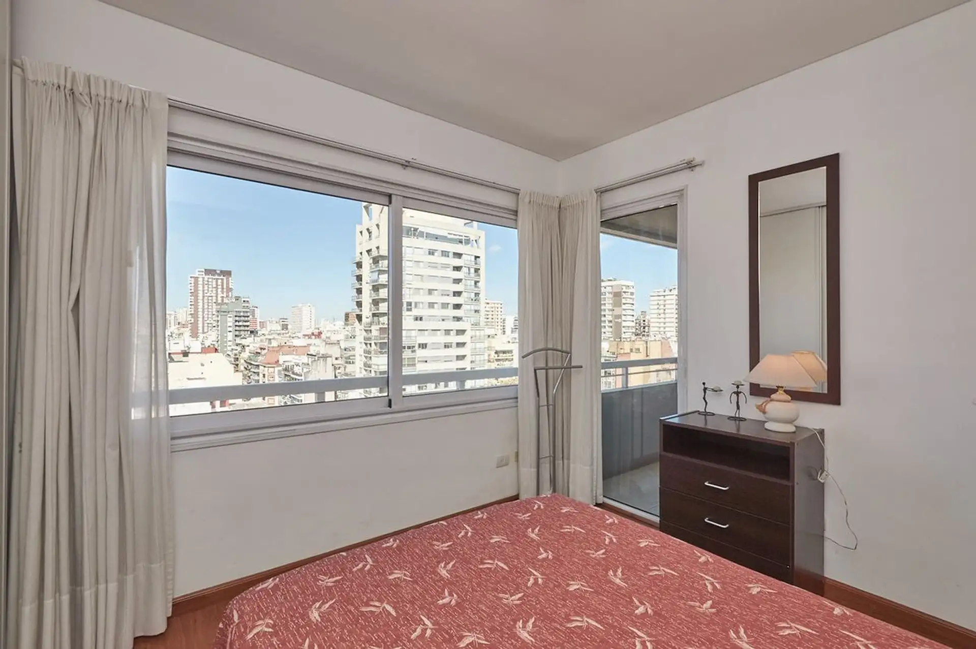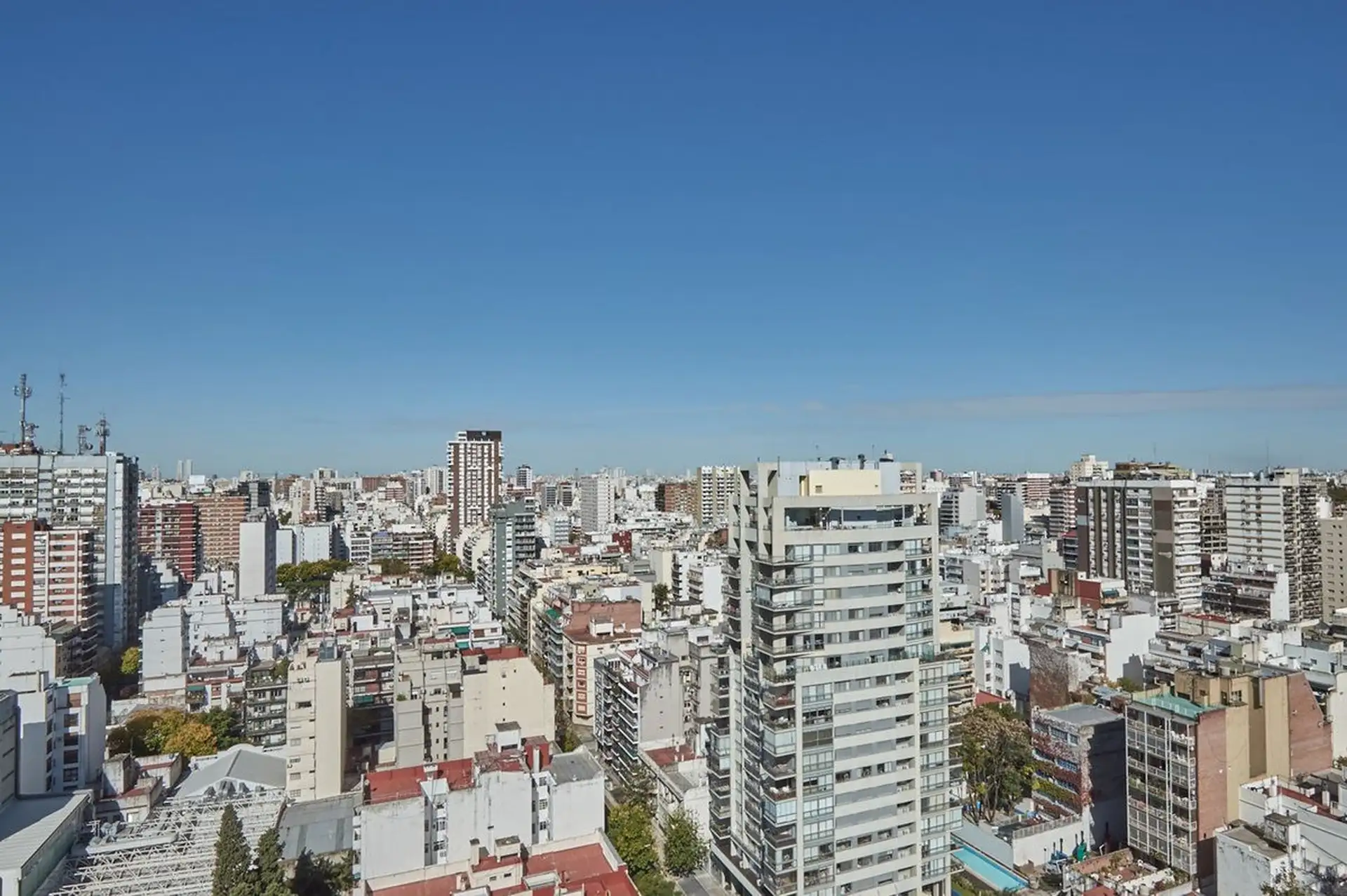 Apartamento de 2 ambientes em Belgrano, no andar alto, com vista panorâmica e sem mobília. Cozinha com área de lavanderia (gás natural), aquecimento por piso radiante com caldeira dual Ipeisa, living com 4,20 x 3,50 m e dormitório com 3 x 3 m. Conta com varanda de 1,05 x 4,25 m e 2 banheiros, com dimensões 2 x 1,7 m. O prédio tem 4 elevadores, gerador de energia e segurança 24 horas, além de piscina aquecida, jacuzzi, solarium, 2 spas com sauna, sala de relax e chuveiro, salão de usos múltiplos