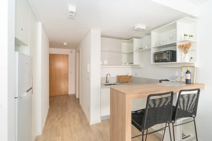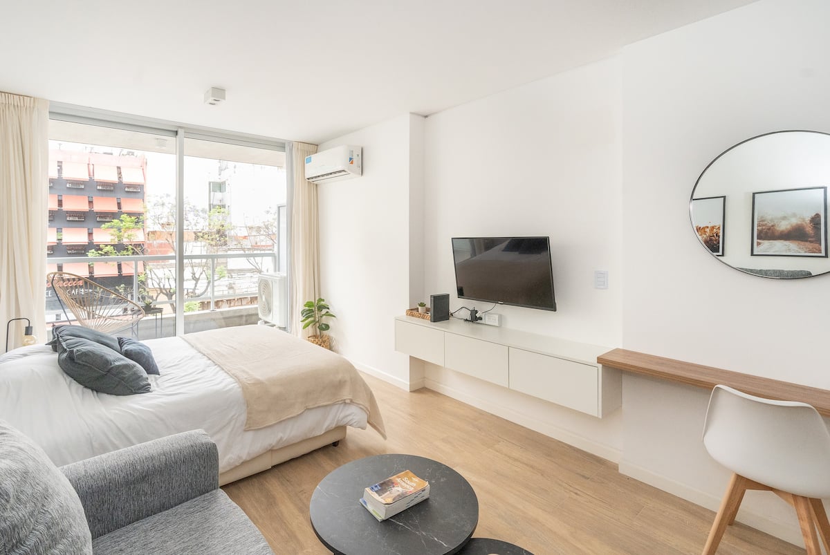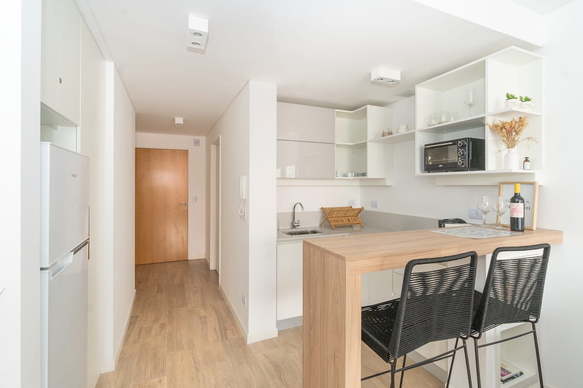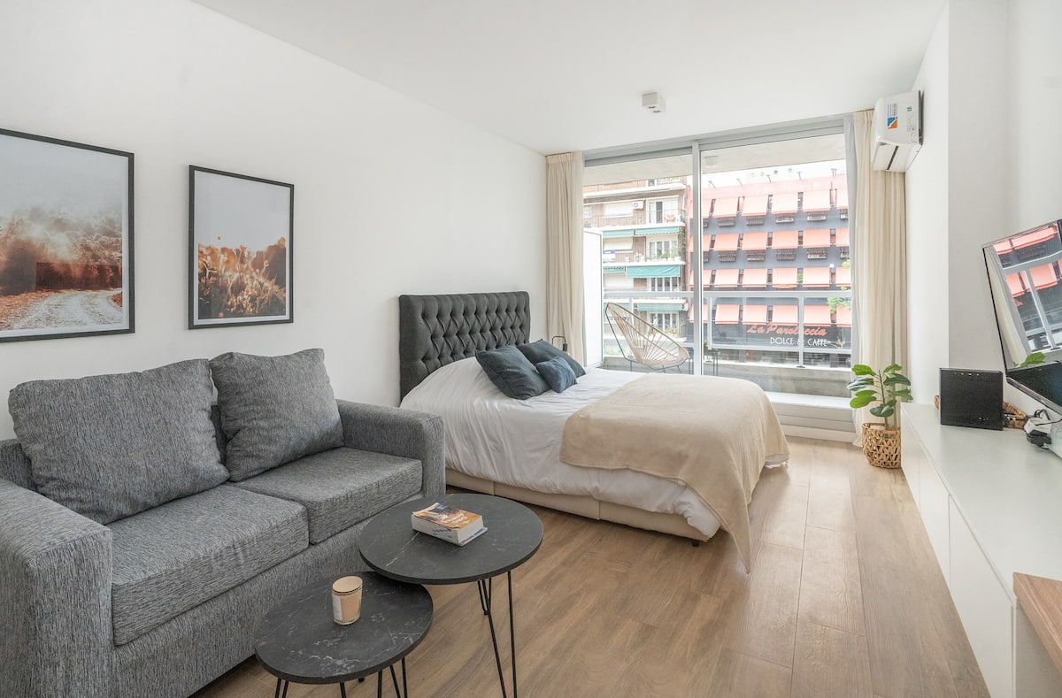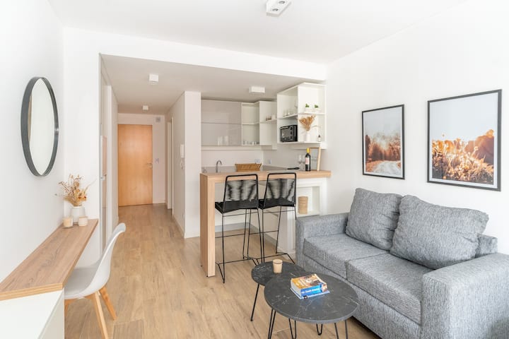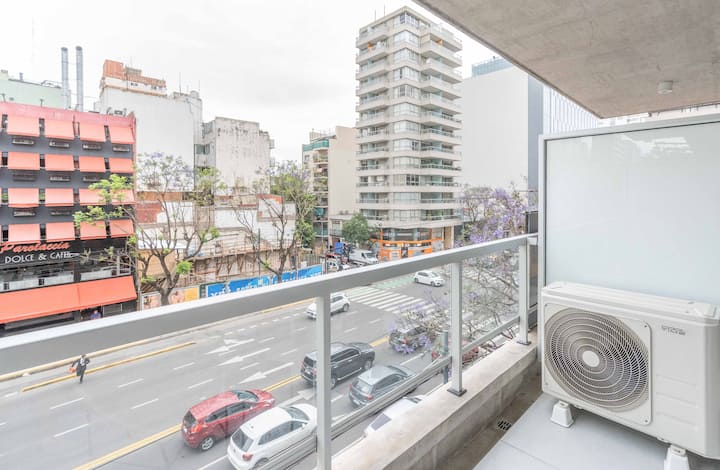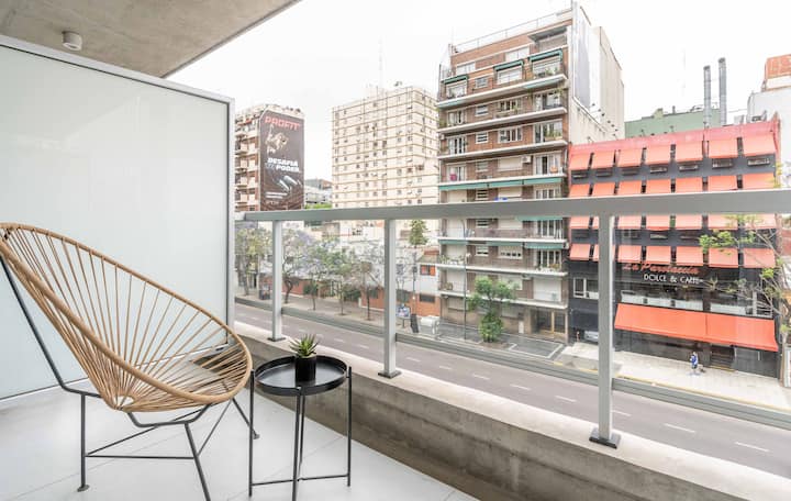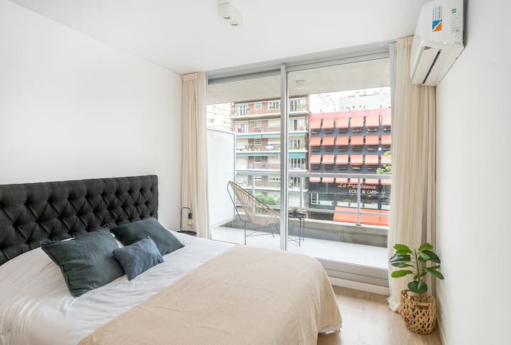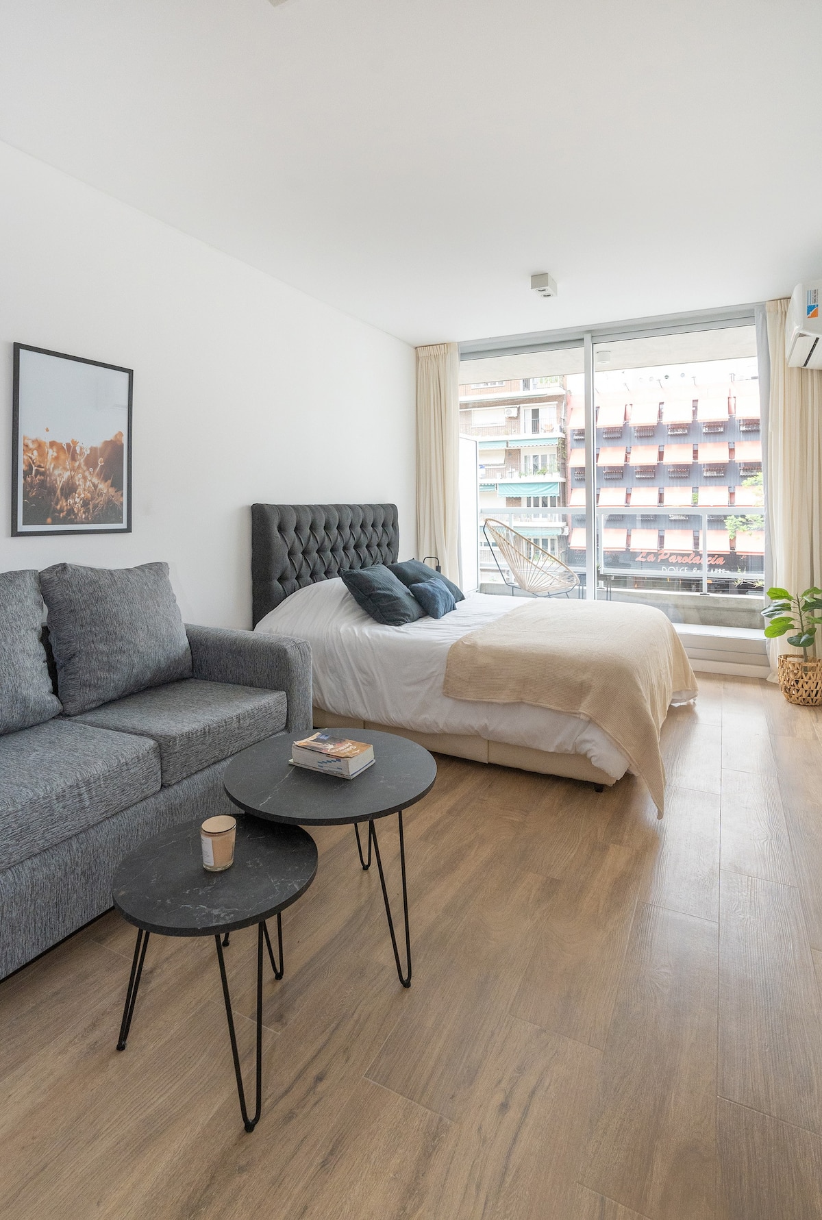 Kitnet (estúdio) com cozinha integrada e varanda privativa no 3º andar, em prédio novo em Belgrano. Unidade mobiliada e totalmente equipada, com cama queen, TV inteligente, Wi-Fi de alta velocidade, Nespresso, micro-ondas, chaleira e torradeira, além de banheiro completo. O prédio conta com piscina, academia e área de lavanderia.