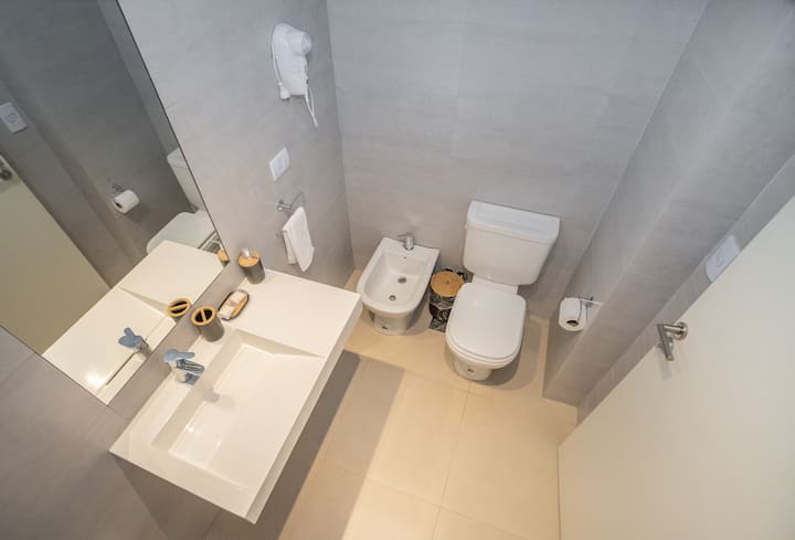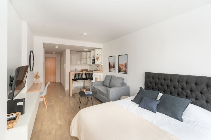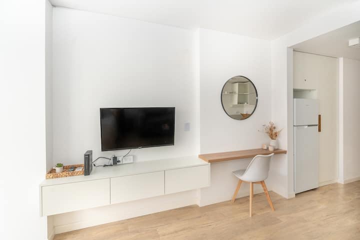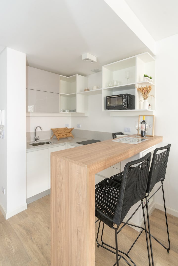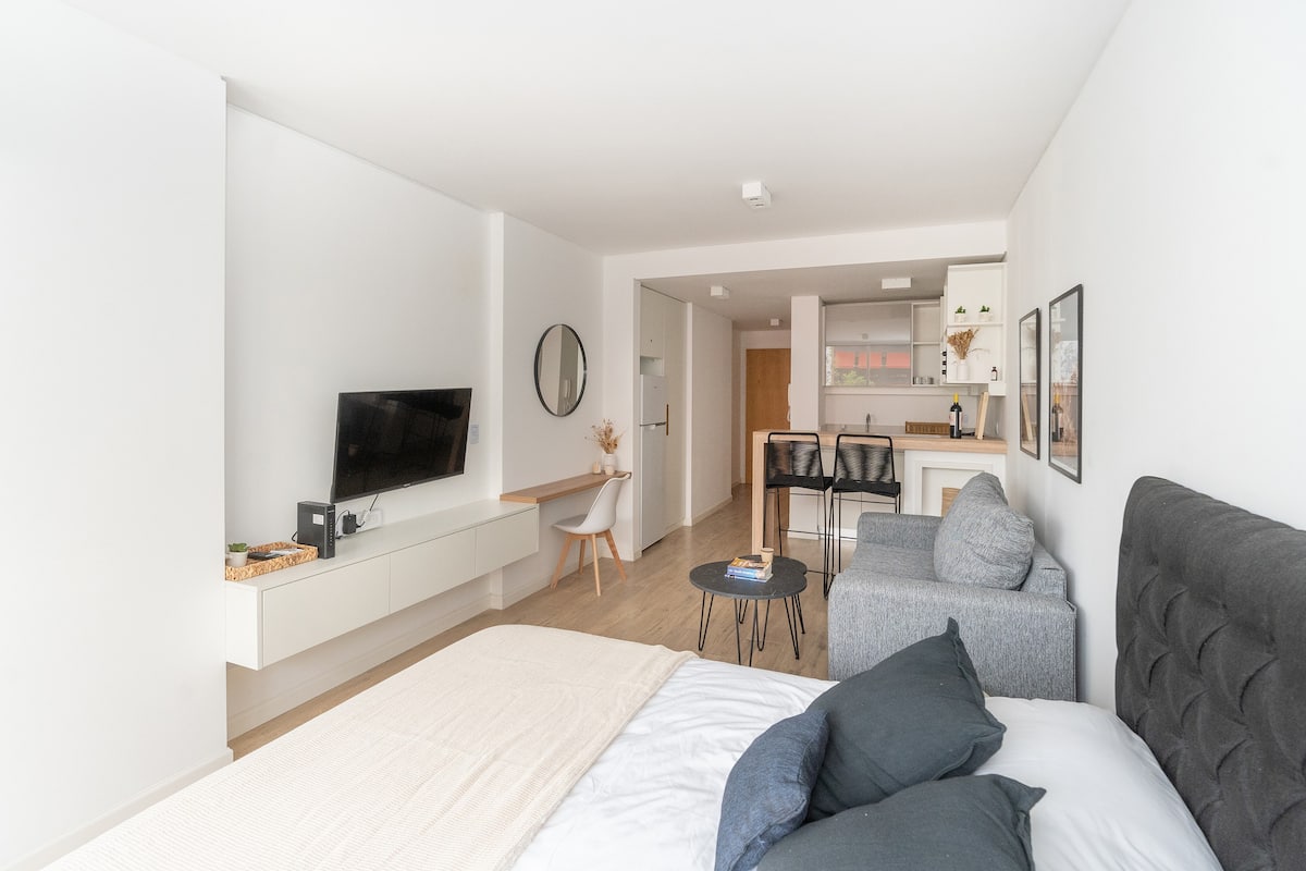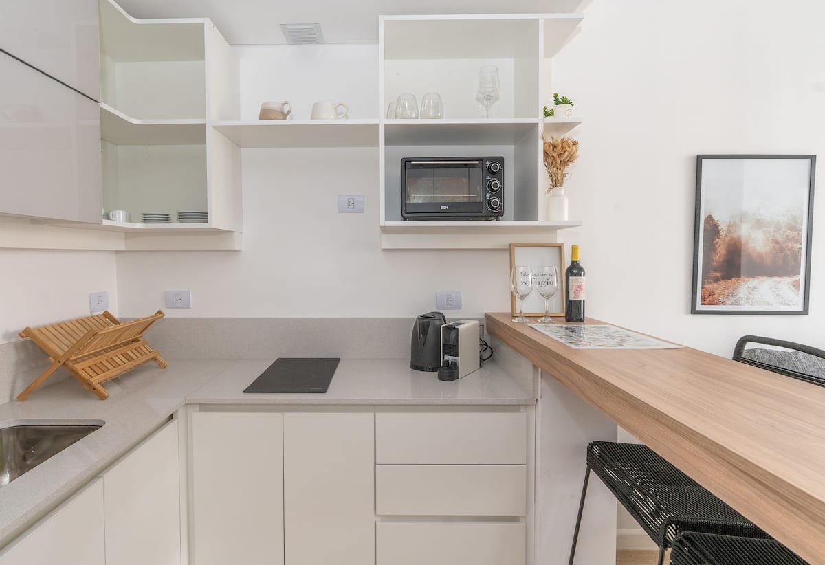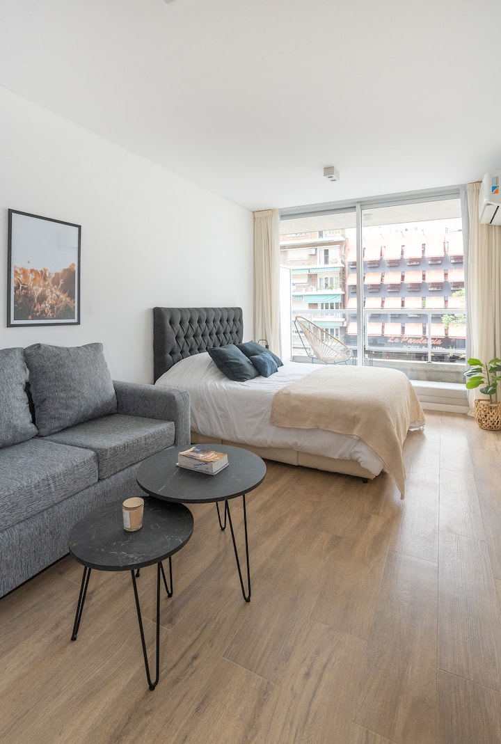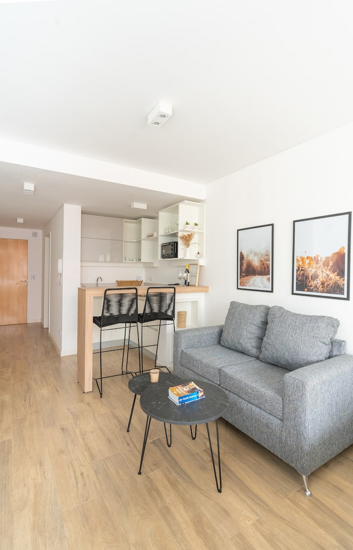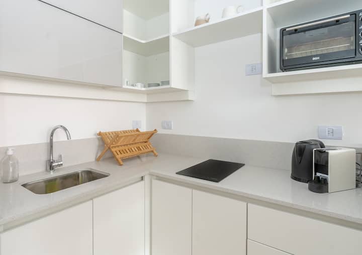 Kitnet (estúdio) com cozinha integrada e varanda privativa no 3º andar, em prédio novo em Belgrano. Unidade mobiliada e totalmente equipada, com cama queen, TV inteligente, Wi-Fi de alta velocidade, Nespresso, micro-ondas, chaleira e torradeira, além de banheiro completo. O prédio conta com piscina, academia e área de lavanderia.
