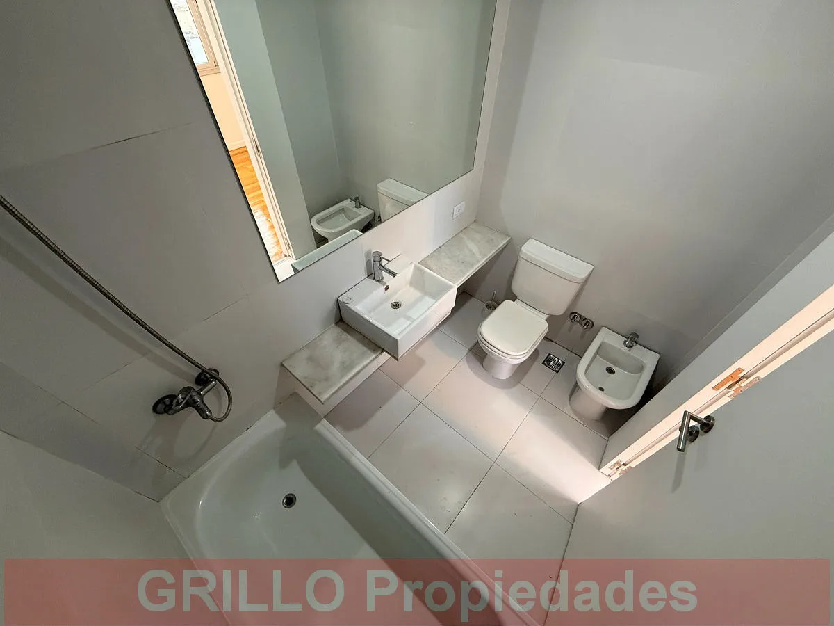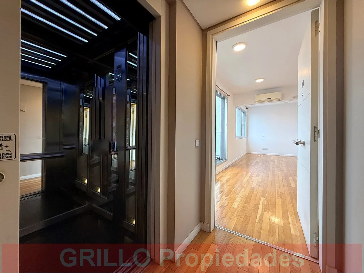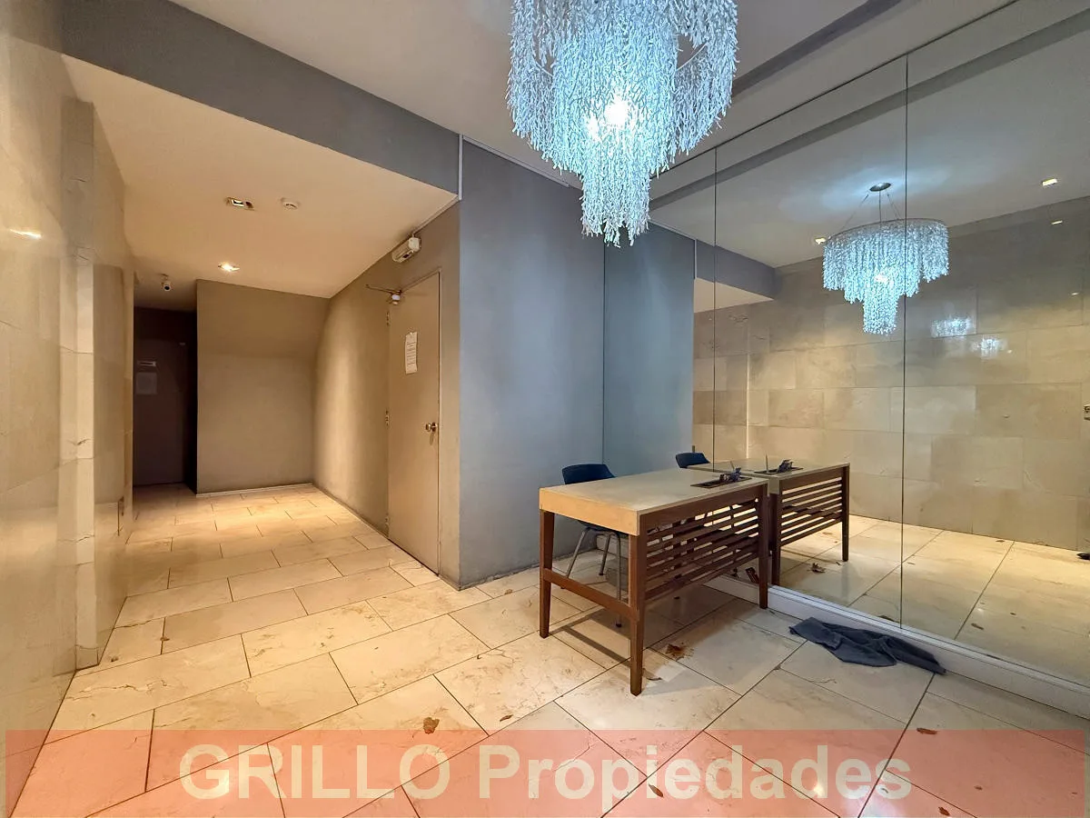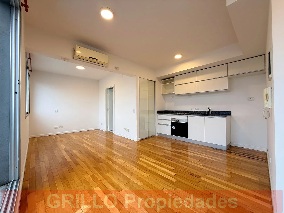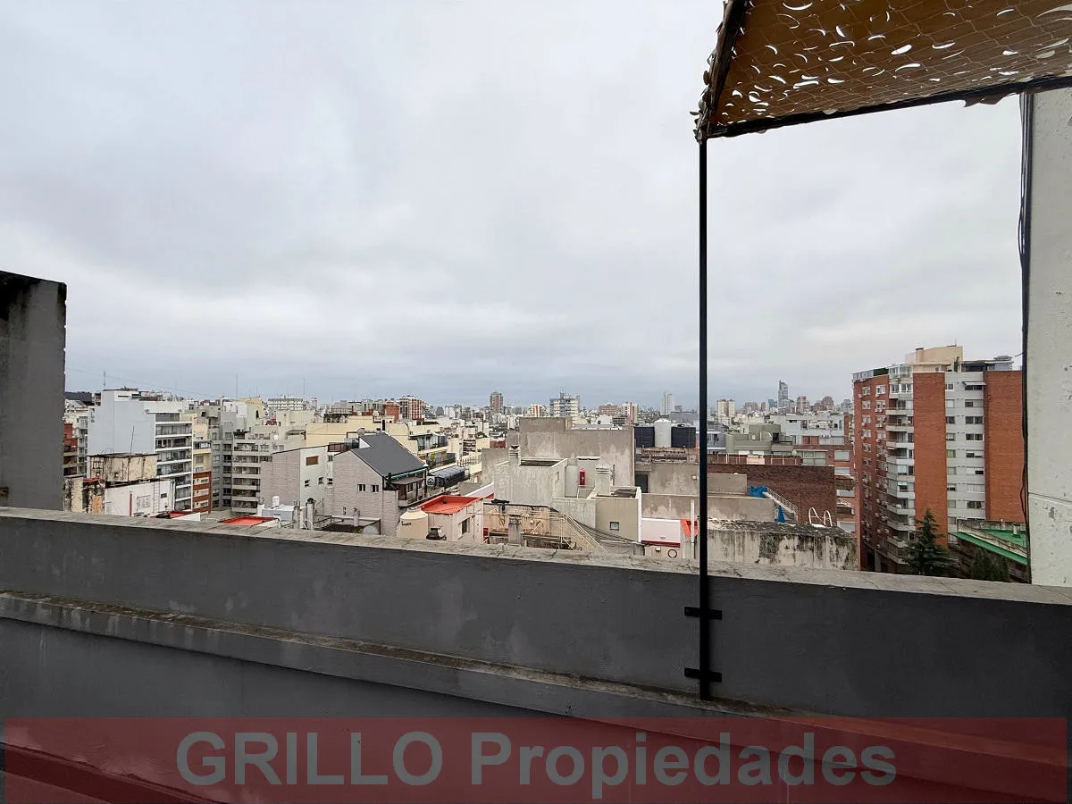 Kitnet dividível de 61 m² com 31 m² cobertos, 3 m² de varanda e 27 m² de terraço, no 10º andar de frente para o miolo de quadra (contrafrente). Cozinha integrada ao living com fogão (anafe) elétrico e forno elétrico, armário embutido e ar-condicionado tipo split frio/calor instalado. Banheiro completo com banheira; varanda no contrafrente com acesso ao terraço por escada própria e área de churrasco (parrilla) no terraço. O condomínio tem piscina e SUM. As expensas incluem AySA (água) e MetroGas