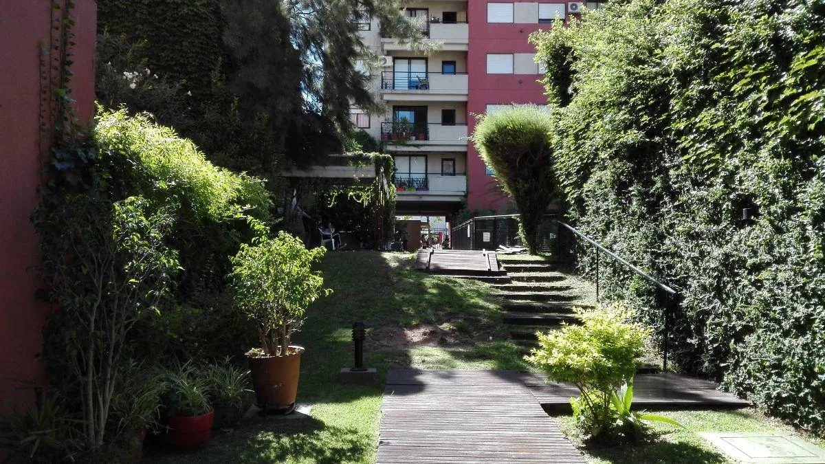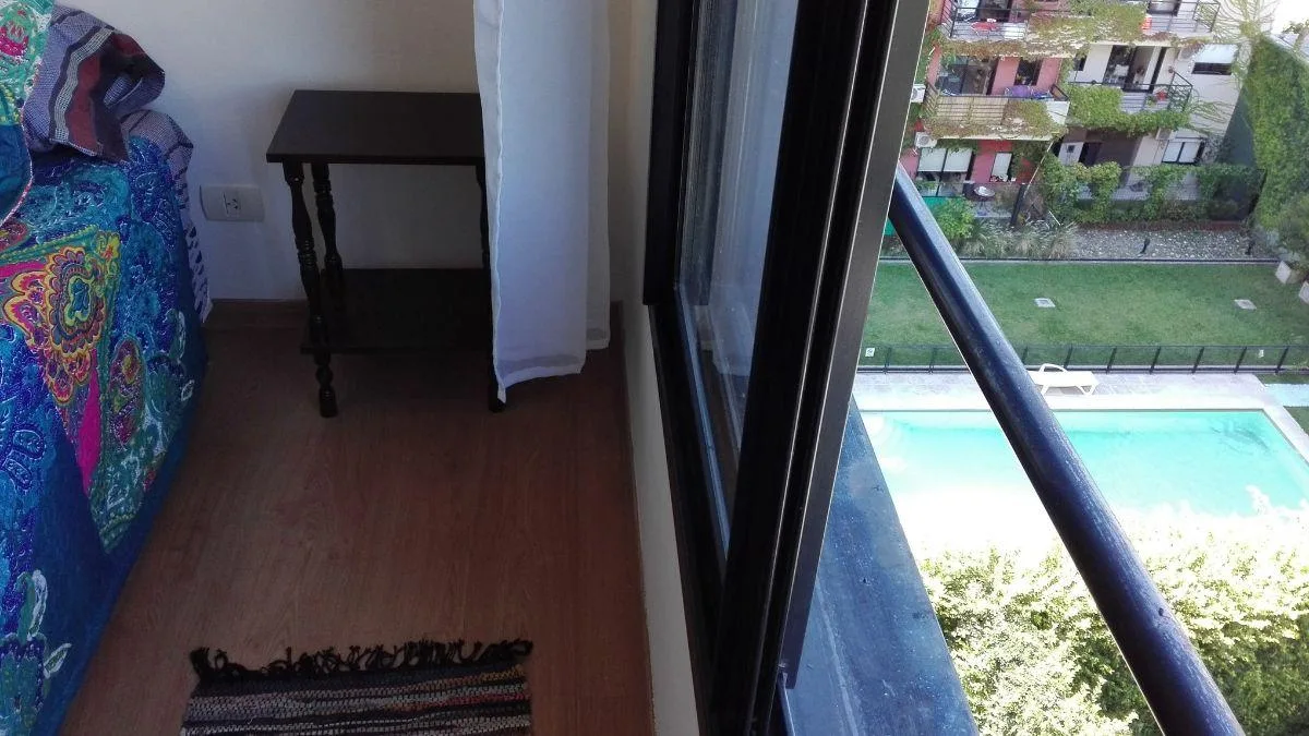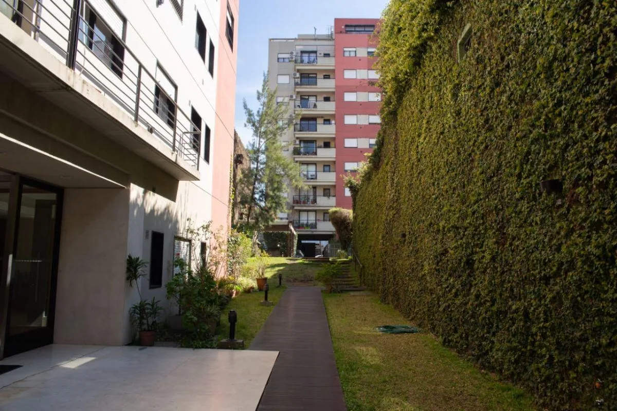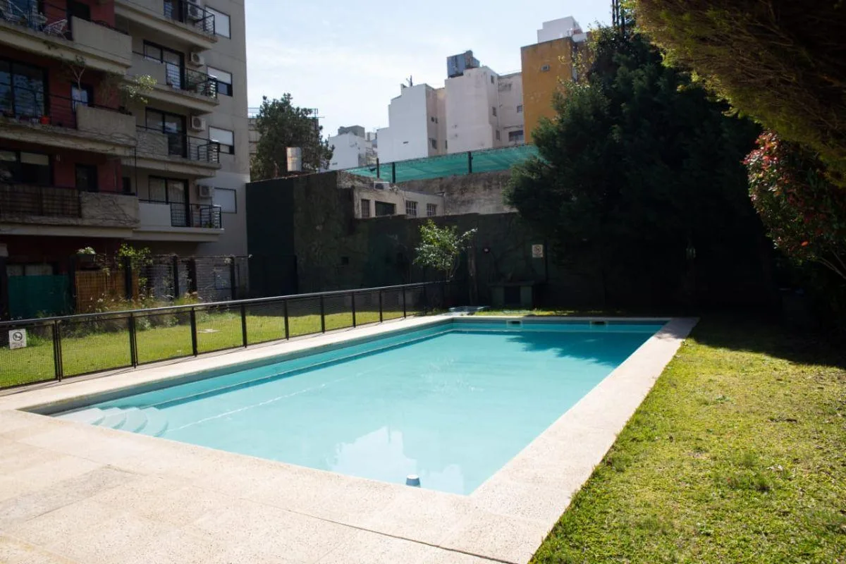 Apartamento de 2 ambientes no 4º andar em Belgrano R, com varanda e vista para os jardins do complexo e a piscina. Conta com living-comedor, cozinha completa com espaço de armazenamento, banheiro completo e dormitório com vista para os jardins. O prédio tem 2 halls de distribuição com bibliotecas embutidas, além de terraço, lavanderia, salão de festas (SUM), jardins, piscina e área de churrasco. O valor inclui aluguel, condomínio, ABL, AYSA, cabo e Wi-Fi; o inquilino paga luz e gás.