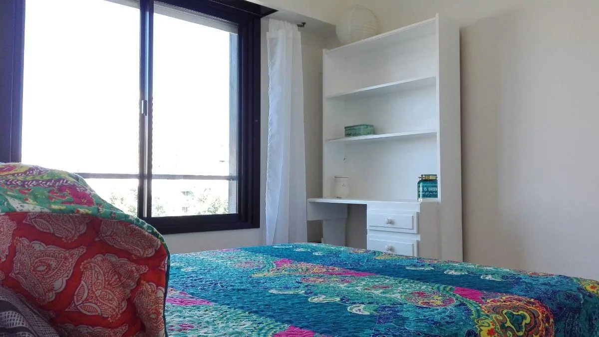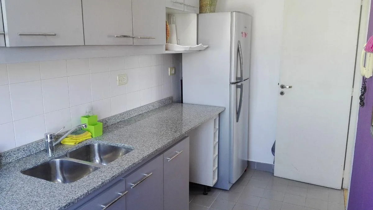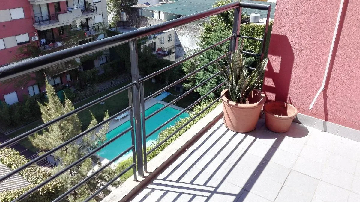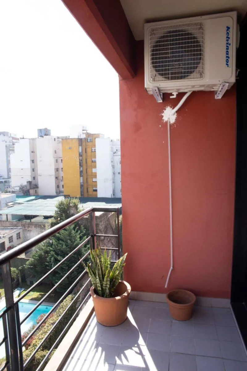 Apartamento de 2 ambientes no 4º andar em Belgrano R, com varanda e vista para os jardins do complexo e a piscina. Conta com living-comedor, cozinha completa com espaço de armazenamento, banheiro completo e dormitório com vista para os jardins. O prédio tem 2 halls de distribuição com bibliotecas embutidas, além de terraço, lavanderia, salão de festas (SUM), jardins, piscina e área de churrasco. O valor inclui aluguel, condomínio, ABL, AYSA, cabo e Wi-Fi; o inquilino paga luz e gás.