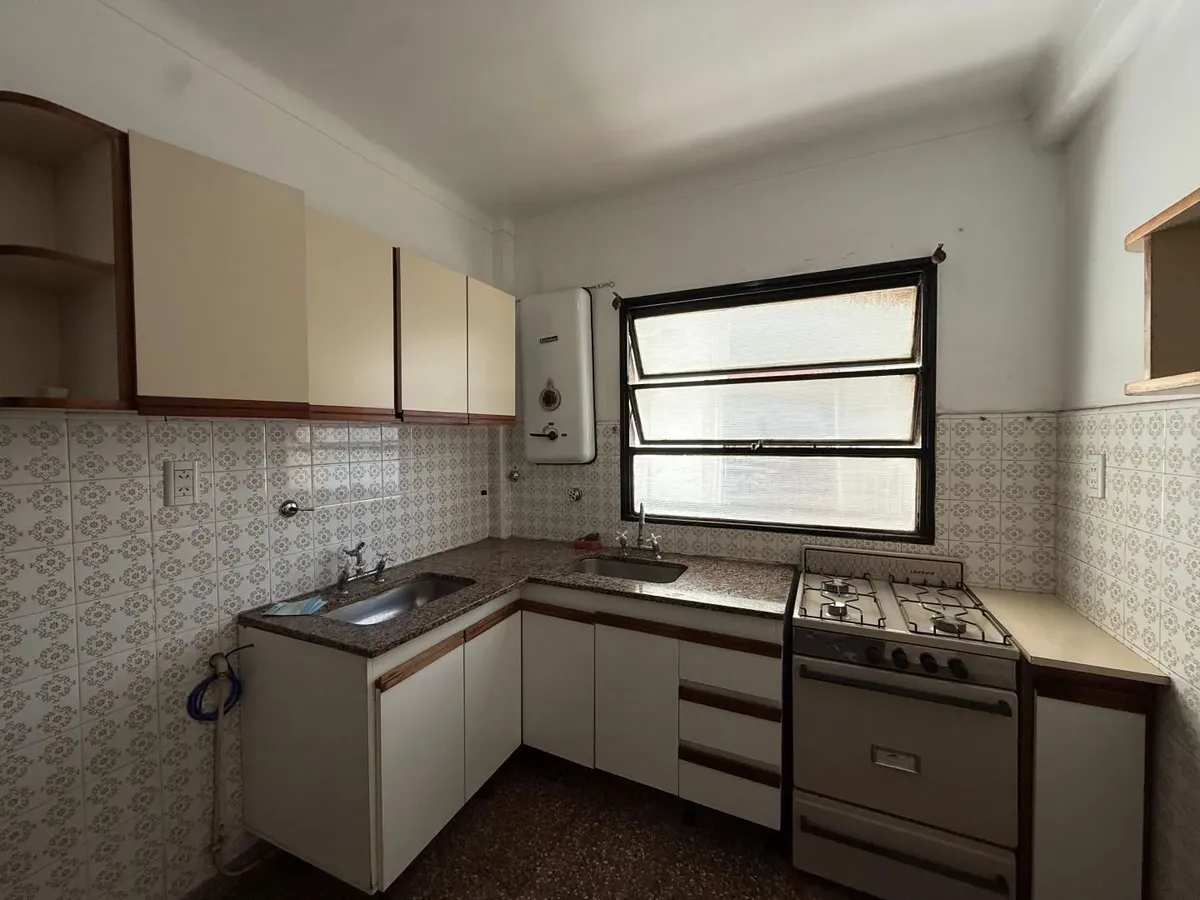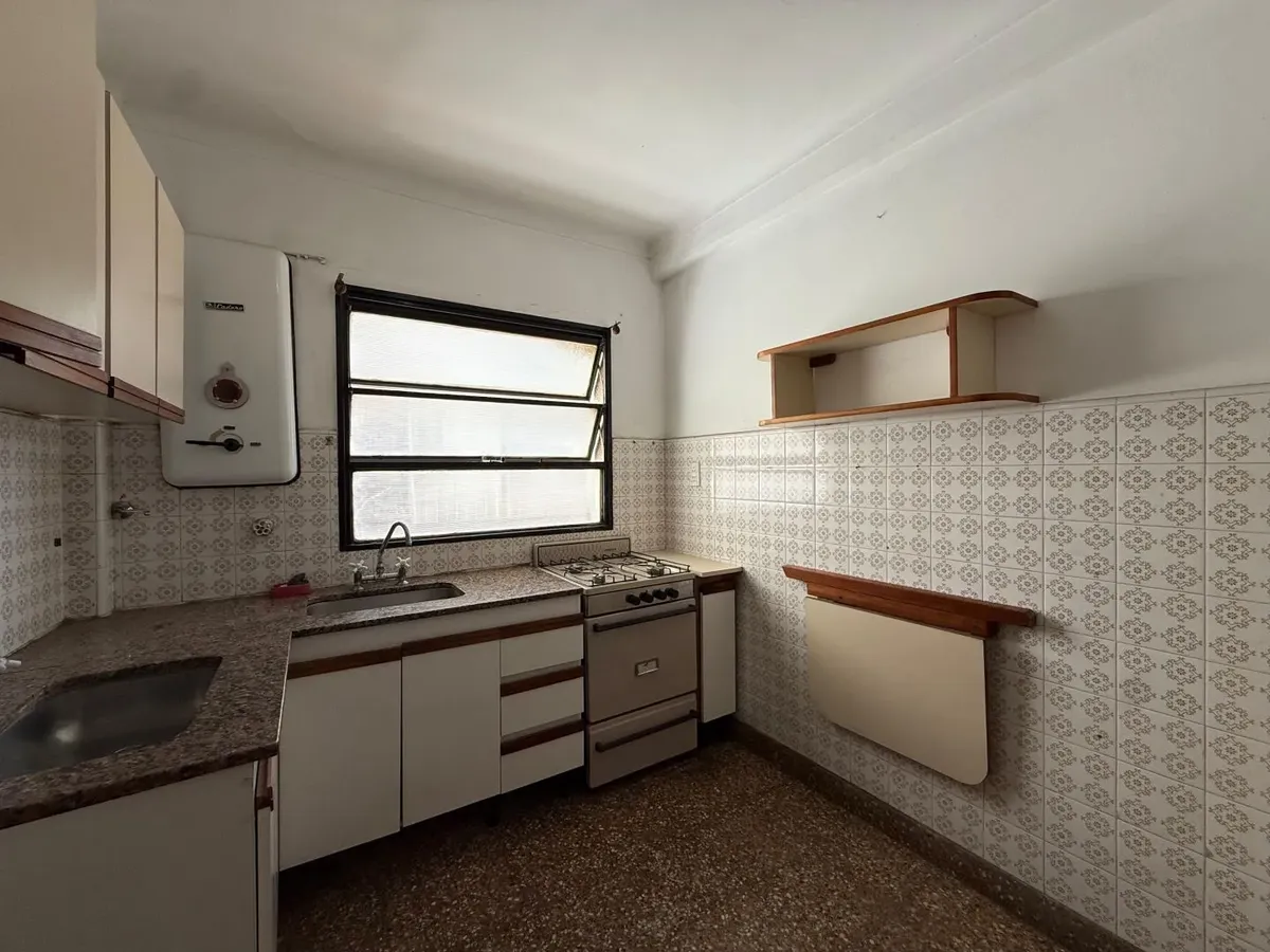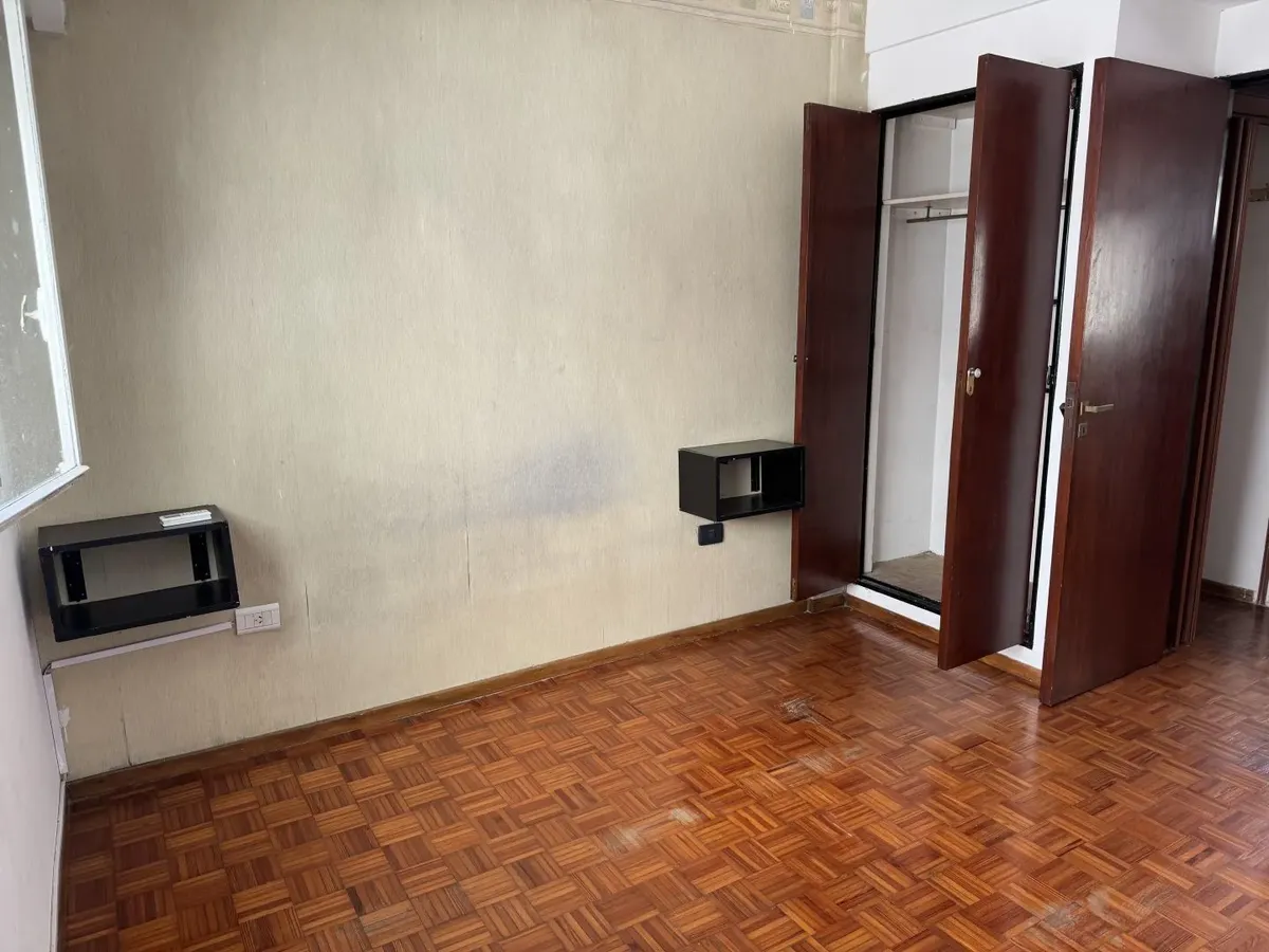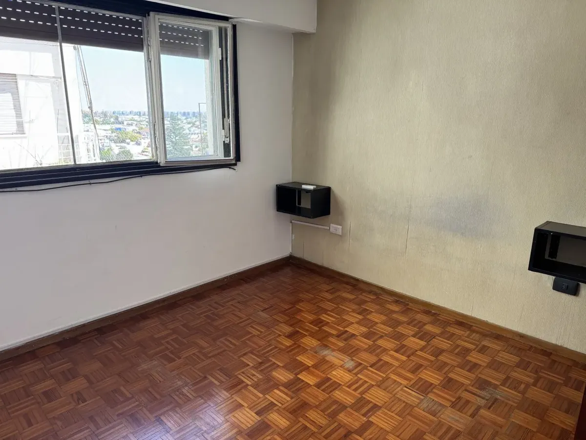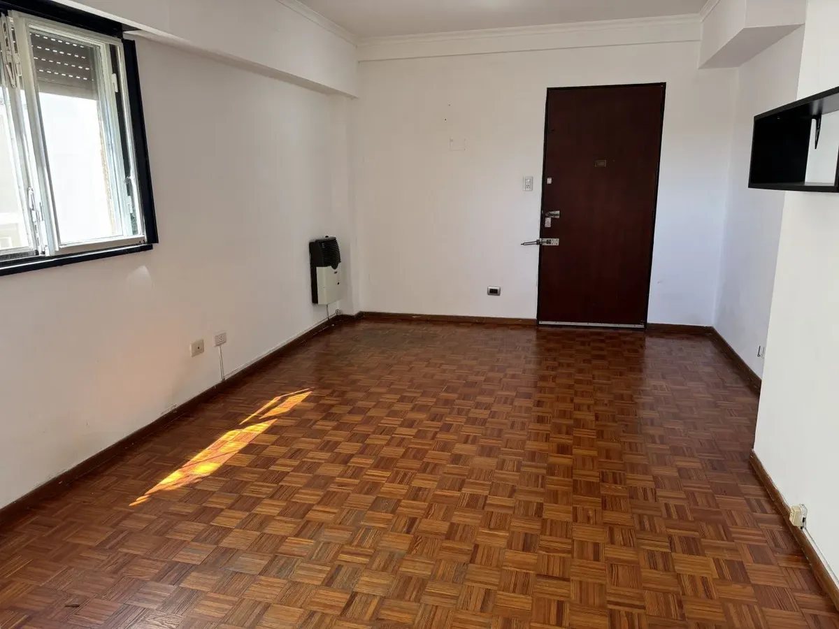 Apartamento de dois ambientes em Wilde, Avellaneda. Possui 1 quarto com armário embutido, cozinha ampla com espaço de armazenamento e mesa rebatível, e banheiro completo com banheira. Sala de estar e jantar com piso de madeira. Fica em andar alto, com vista para o rio e muita luz natural durante o dia; contrato de 2 anos.