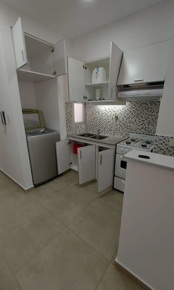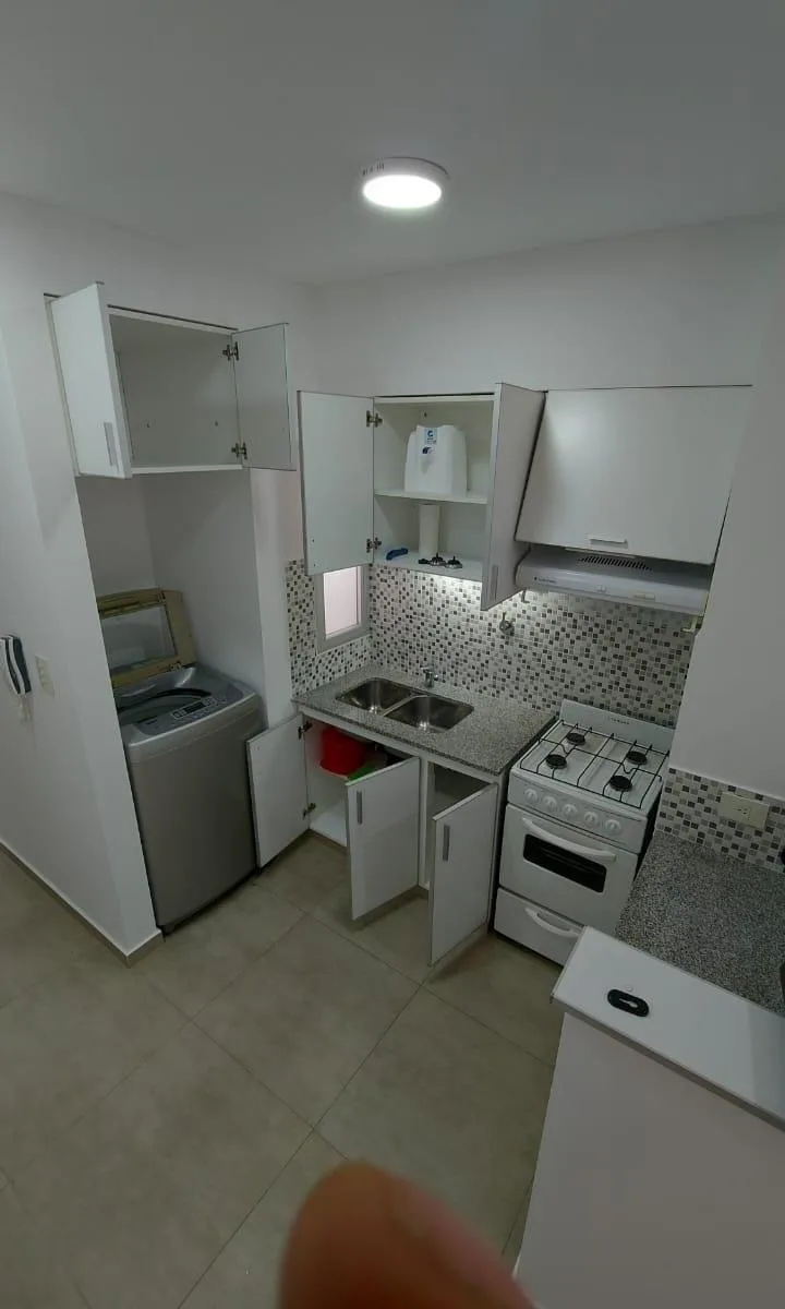 Apartamento de 1 quarto para alugar em Berisso, na zona da Faculdade de Medicina (Av. 60 entre 123 e 124). Cozinha separada com barra para refeições, móveis sob a pia e armário, espaço para geladeira e fogão a gás (Spar). Quarto com armário embutido, banheiro completo com bidê e banheira, e área de lavanderia ampla com conexão para máquina de lavar. Aluguel: USD 400; condomínio: ARS 85.000 (aprox). Exige-se depósito e custos legais; sem garantia nem contracheque.