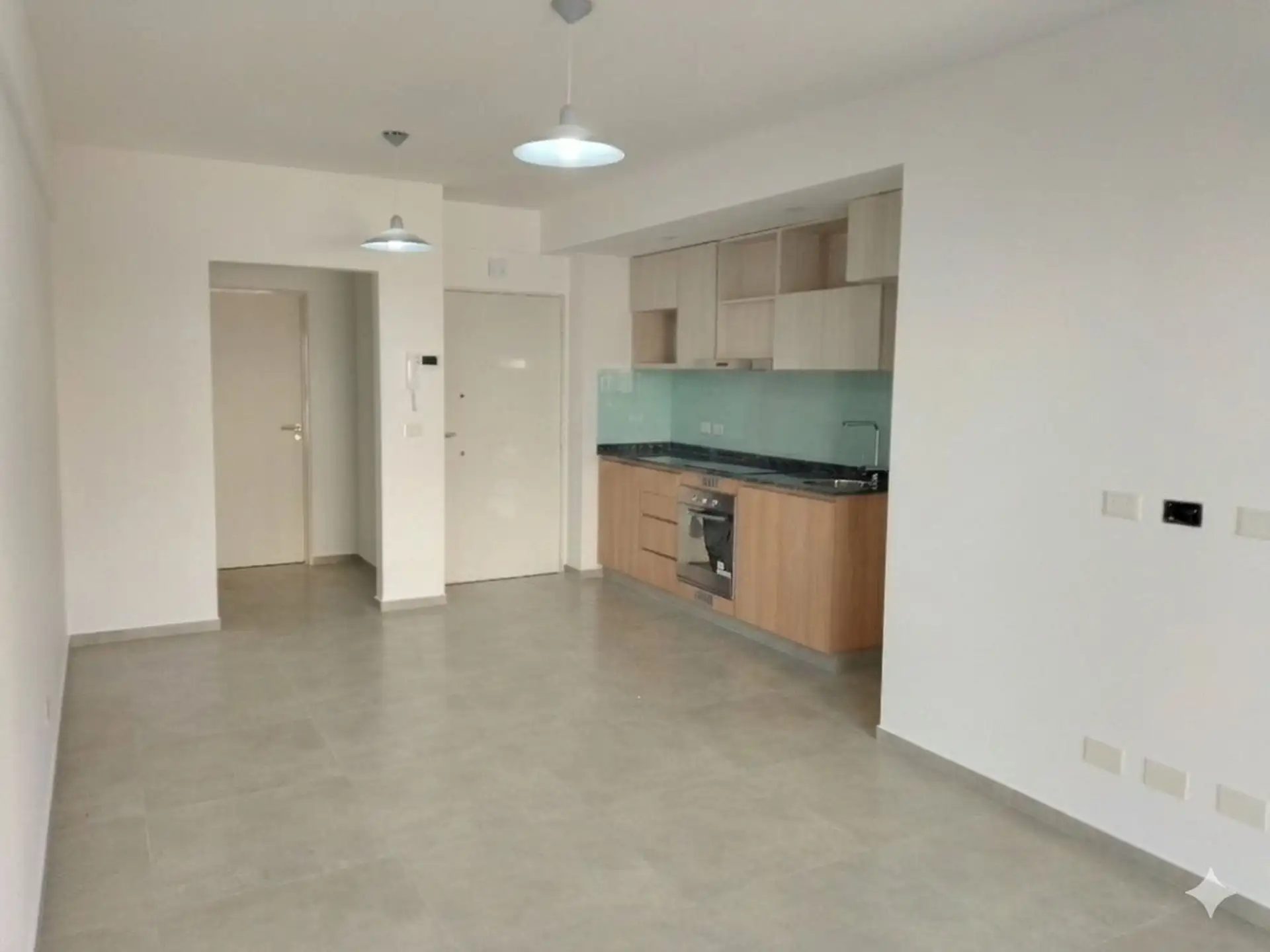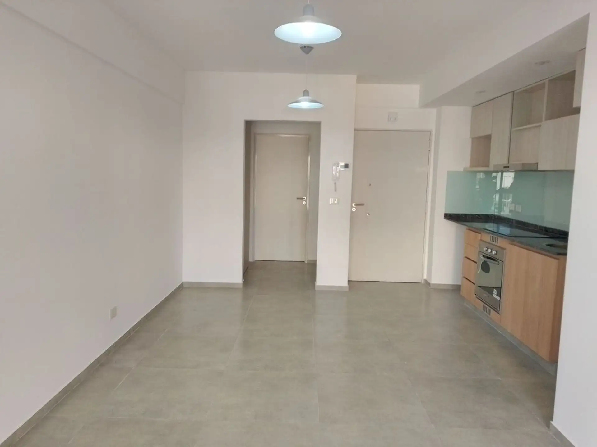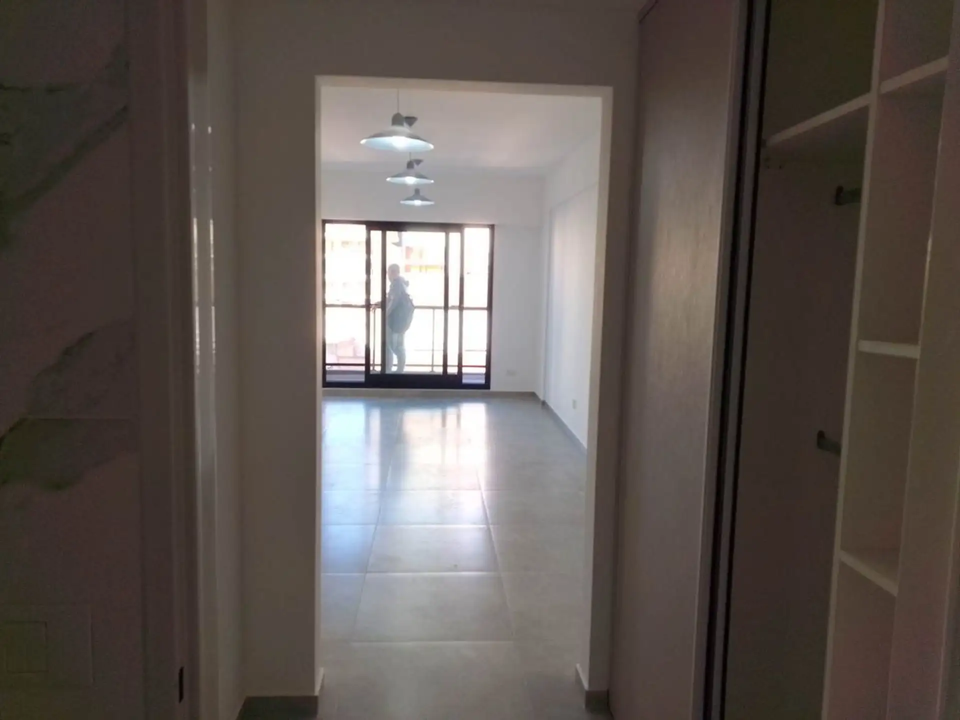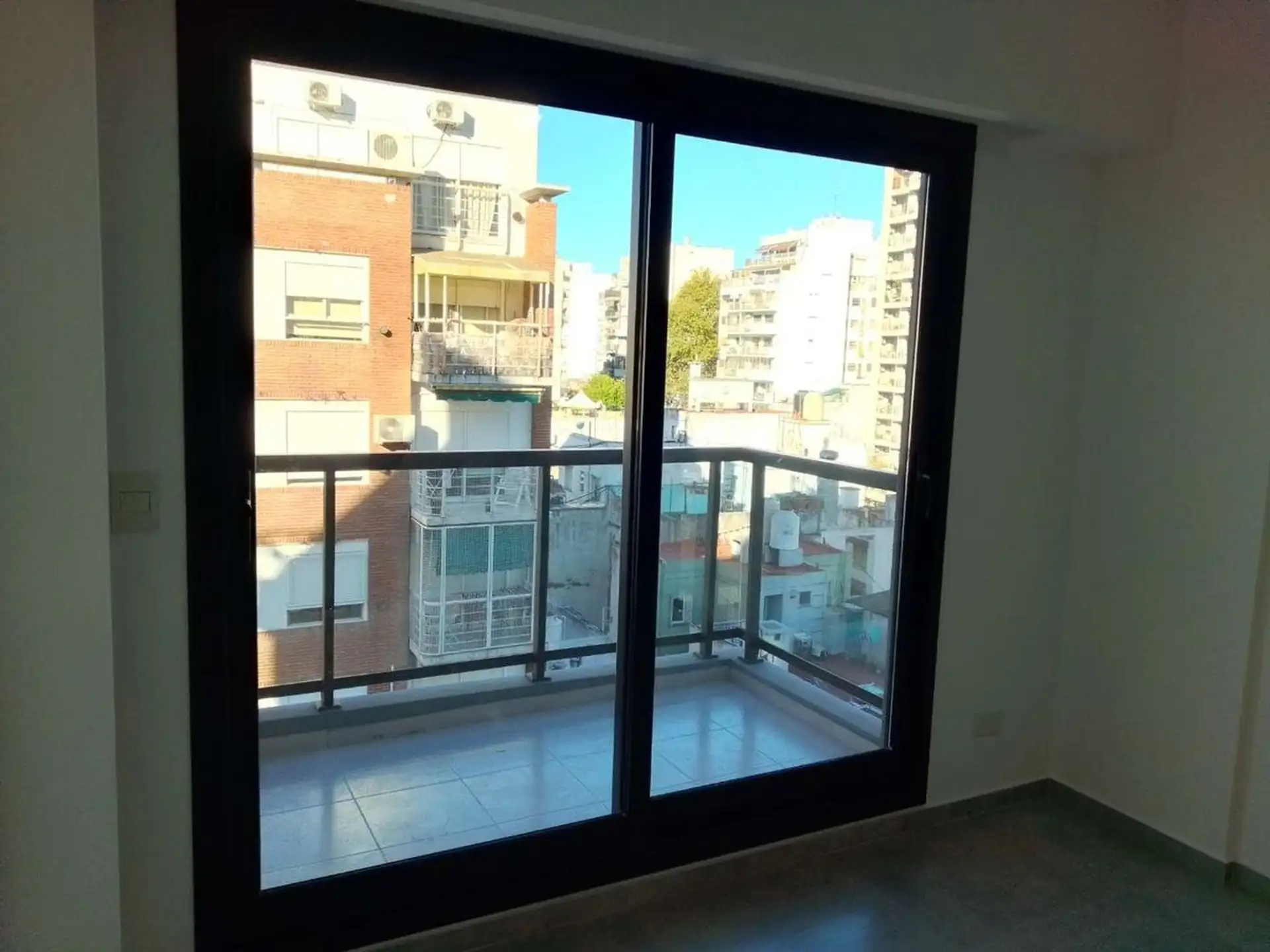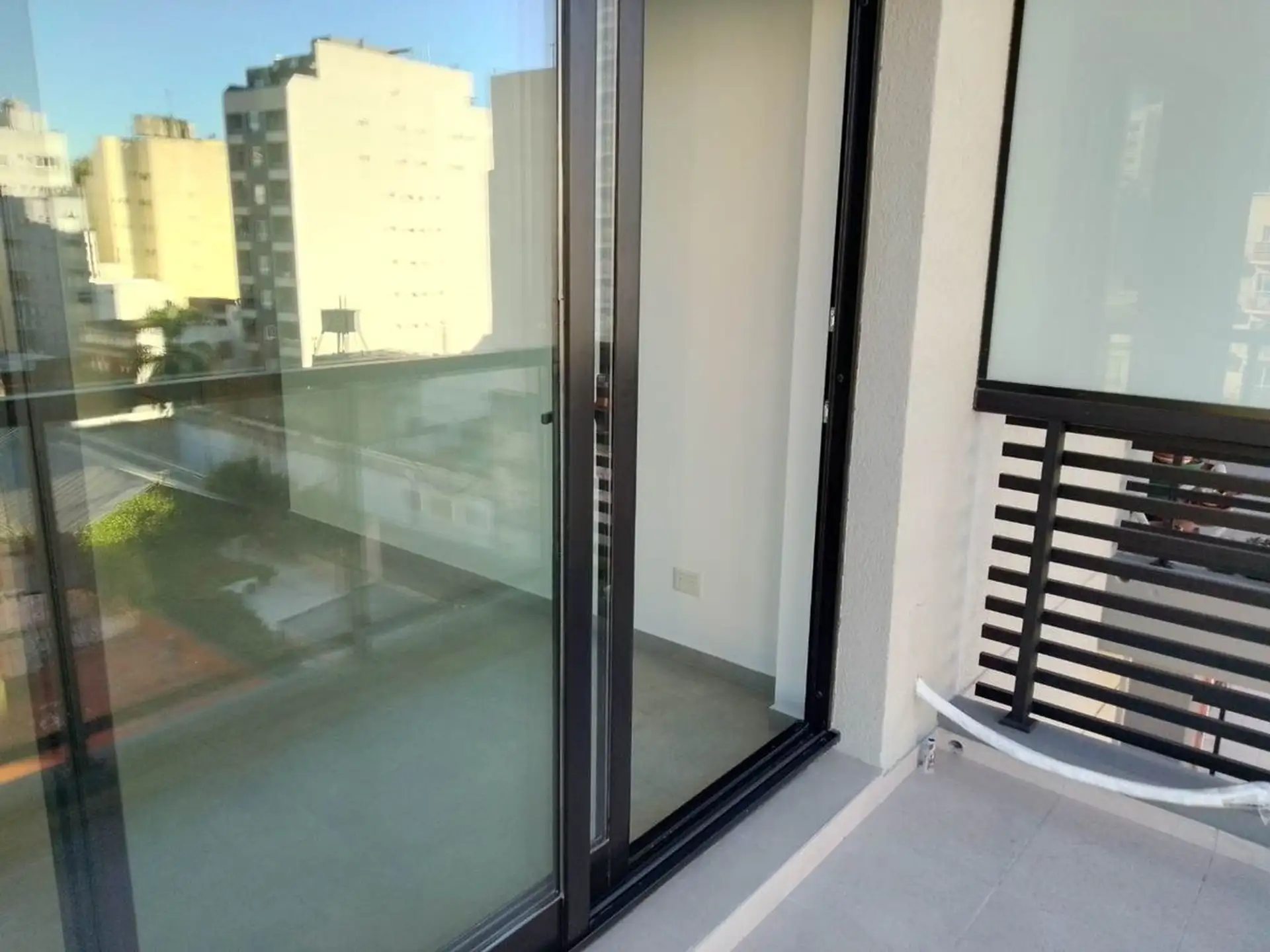 Kitnet (apartamento de um único ambiente) novo, 6º andar, de frente para a rua, com orientação leste, 1 banheiro e amplo balcão com janelas de vidro duplo (DVH). Cozinha com conexão para lavarropas e espaço para geladeira. O prédio tem salão de usos múltiplos para 40 pessoas, com 2 banheiros e pátio externo. O aluguel é por 24 meses, com mês antecipado, depósito de 2 meses e fiança por seguro de fiança; a comissão imobiliária fica a cargo do proprietário, conforme a legislação vigente.