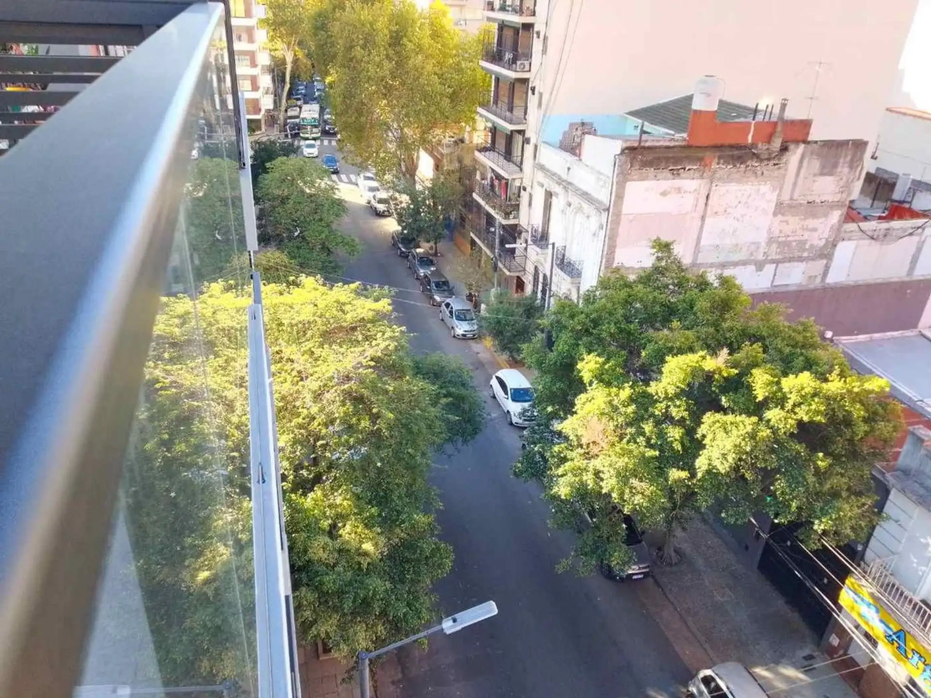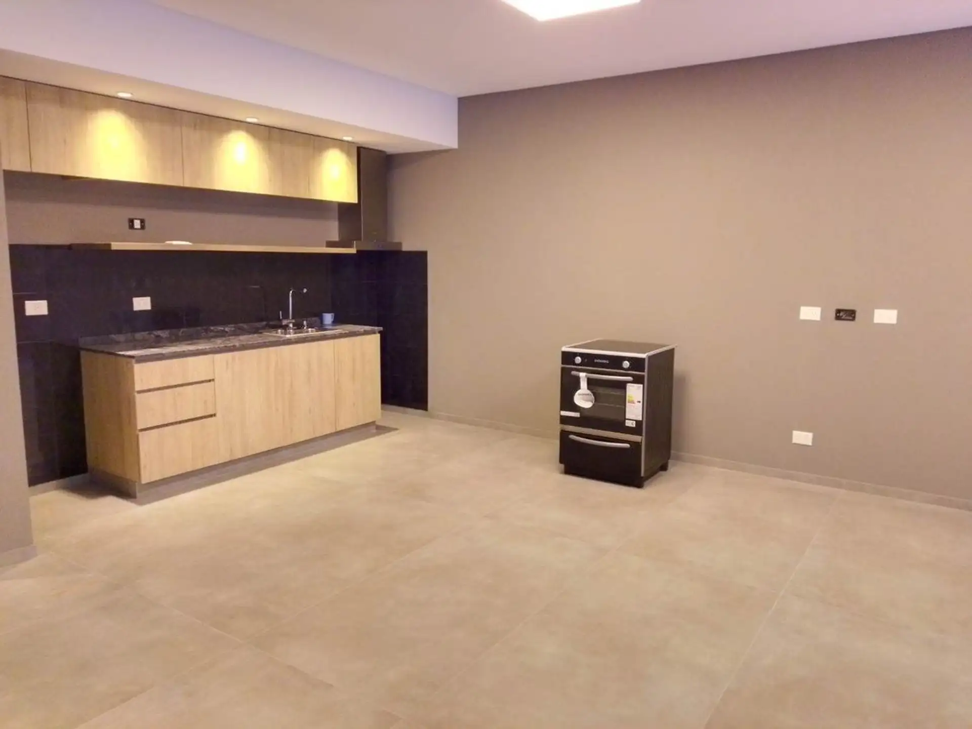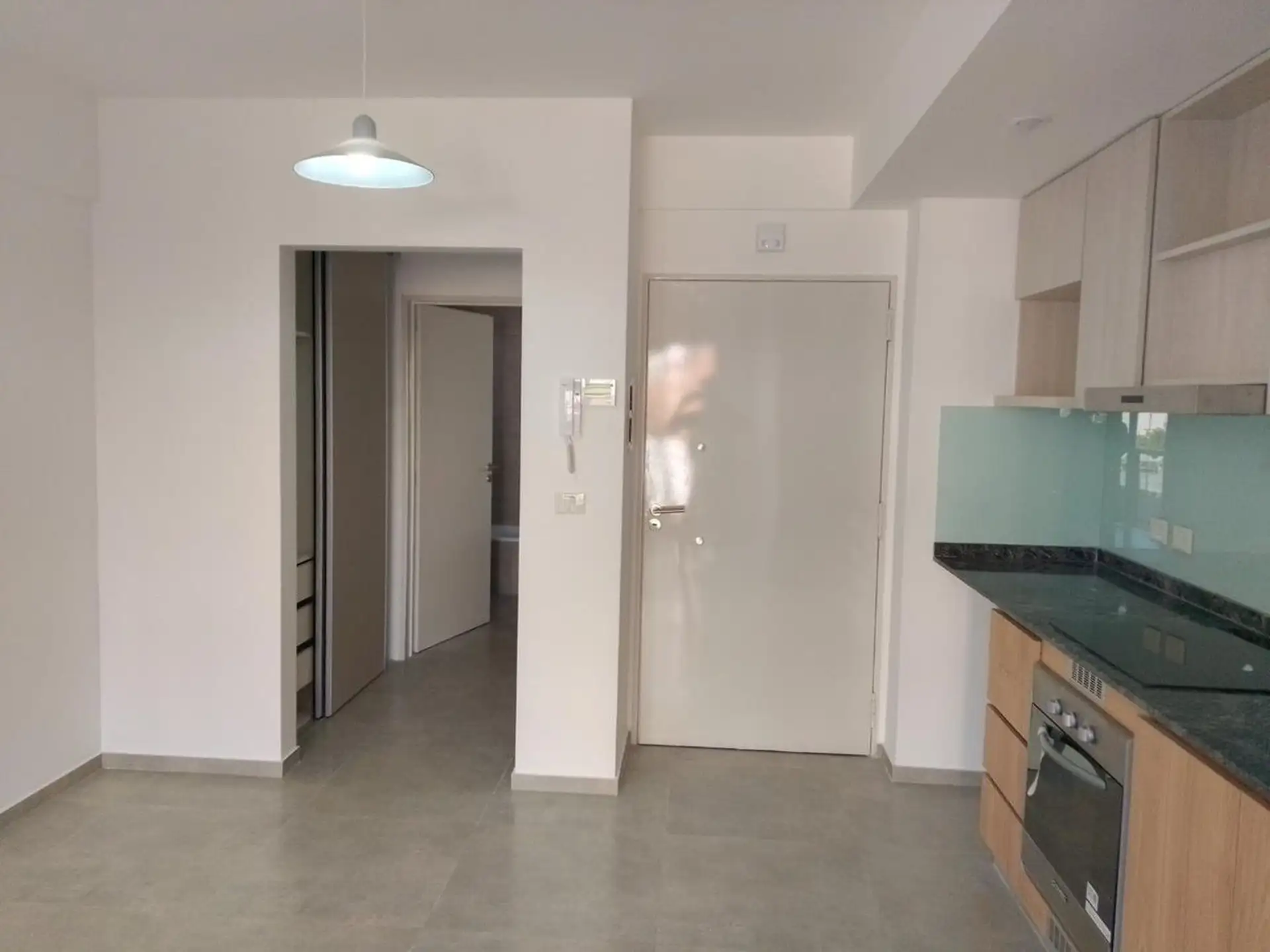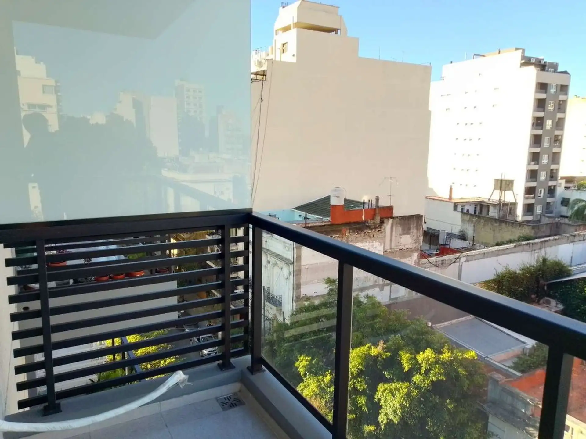 Kitnet (apartamento de um único ambiente) novo, 6º andar, de frente para a rua, com orientação leste, 1 banheiro e amplo balcão com janelas de vidro duplo (DVH). Cozinha com conexão para lavarropas e espaço para geladeira. O prédio tem salão de usos múltiplos para 40 pessoas, com 2 banheiros e pátio externo. O aluguel é por 24 meses, com mês antecipado, depósito de 2 meses e fiança por seguro de fiança; a comissão imobiliária fica a cargo do proprietário, conforme a legislação vigente.