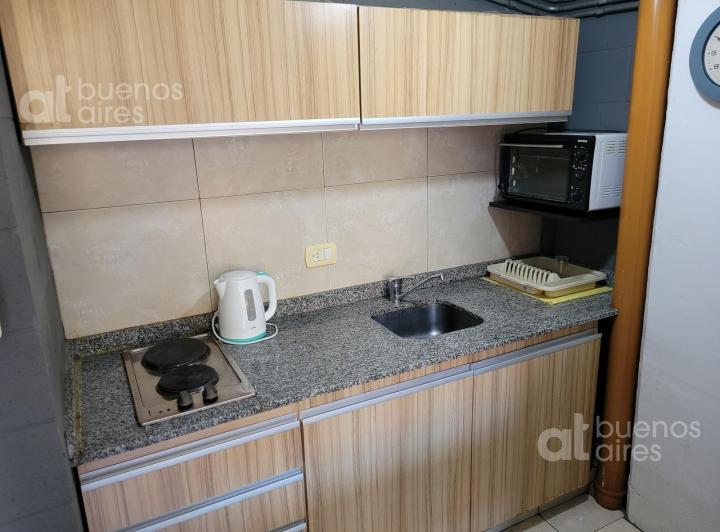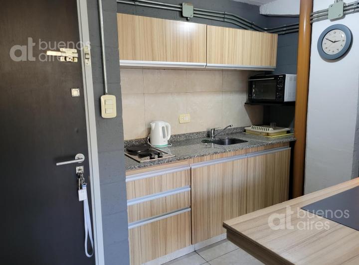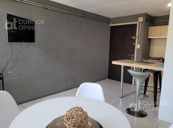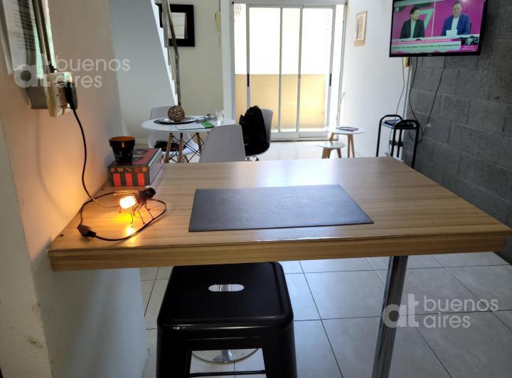 Apartamento duplex mobiliado em Boedo, com 1 dormitório e varanda. No térreo, sala de estar e jantar com mesa e cadeiras, sofá e ar-condicionado frio e quente; cozinha integrada com forno elétrico, geladeira com freezer, chaleira elétrica e utensílios. No andar superior, dormitório com cama de casal, armário com vários compartimentos e banheiro completo. O prédio tem piscina e área de lavanderia (laundry). Disponível a partir de 08/04/2026. Valor anunciado inclui tudo, com a luz a cargo do inqui