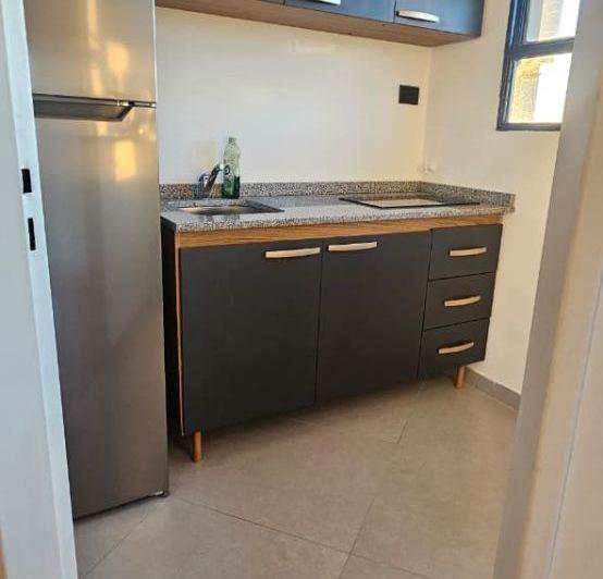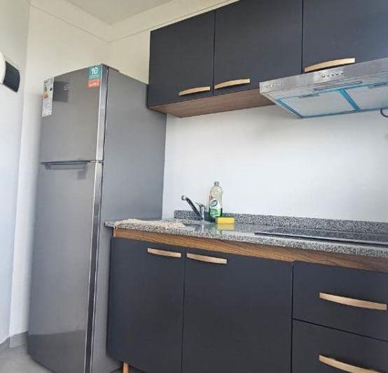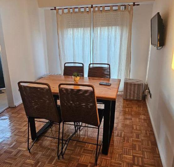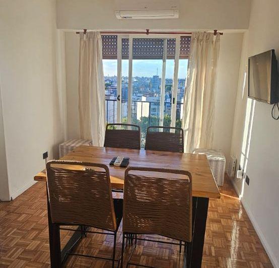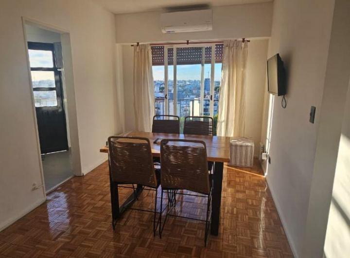Apartamento mobiliado de 2 ambientes com 31 m² no 14º andar, de frente para a rua, com vista aberta. Possui living-comedor com piso de parquet, mesa e conjunto de 4 cadeiras, além de cozinha com armário sob a bancada, armário aére o, geladeira e forno elétrico. O dormitório tem janela ampla, cama e 2 mesas de cabeceira. Há varanda com lavadora (lavarropas). O condomínio é de $220.000.