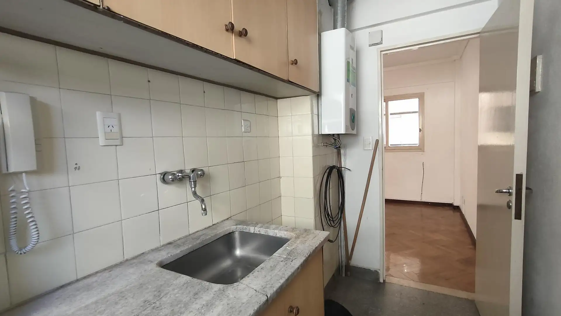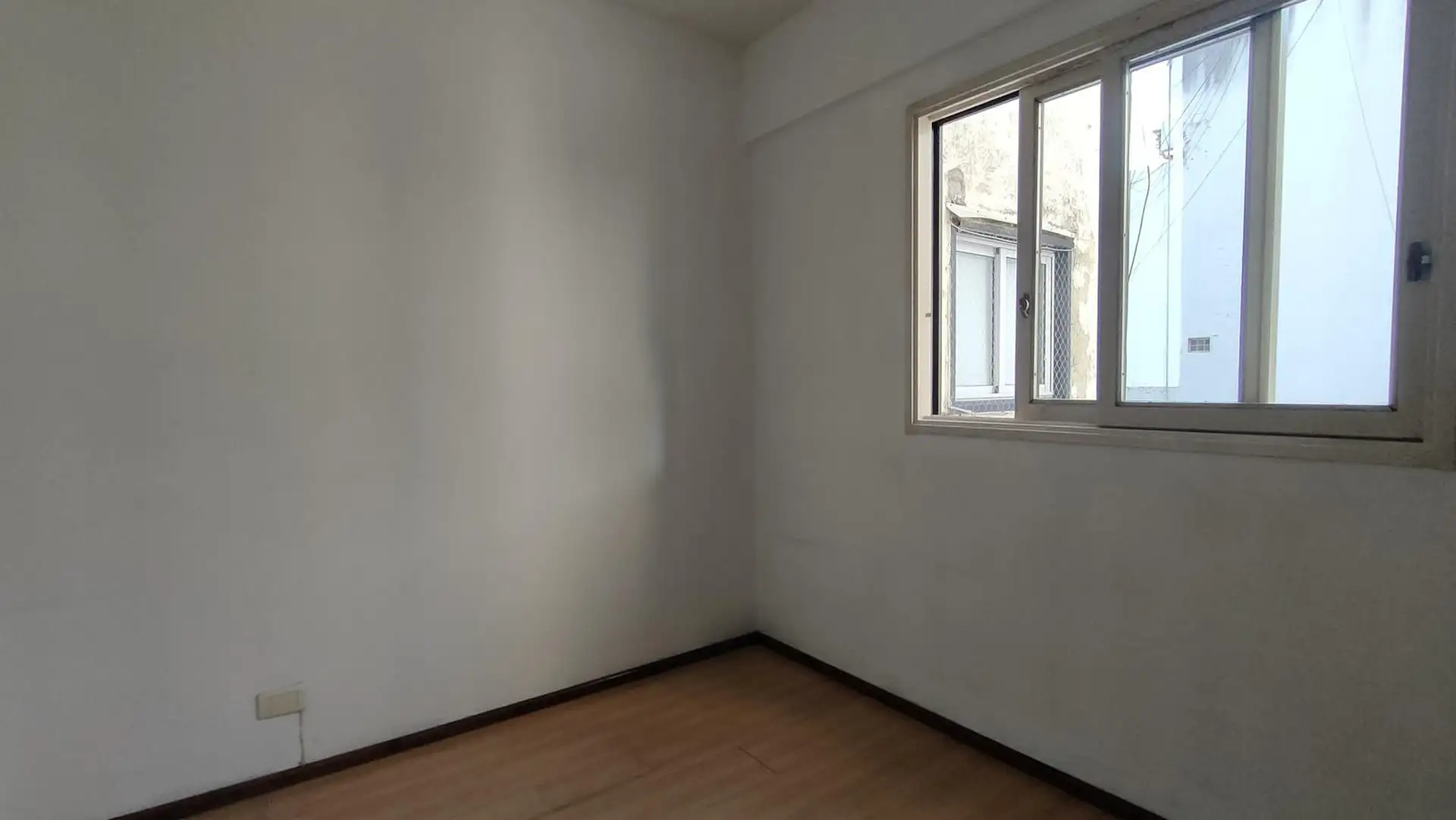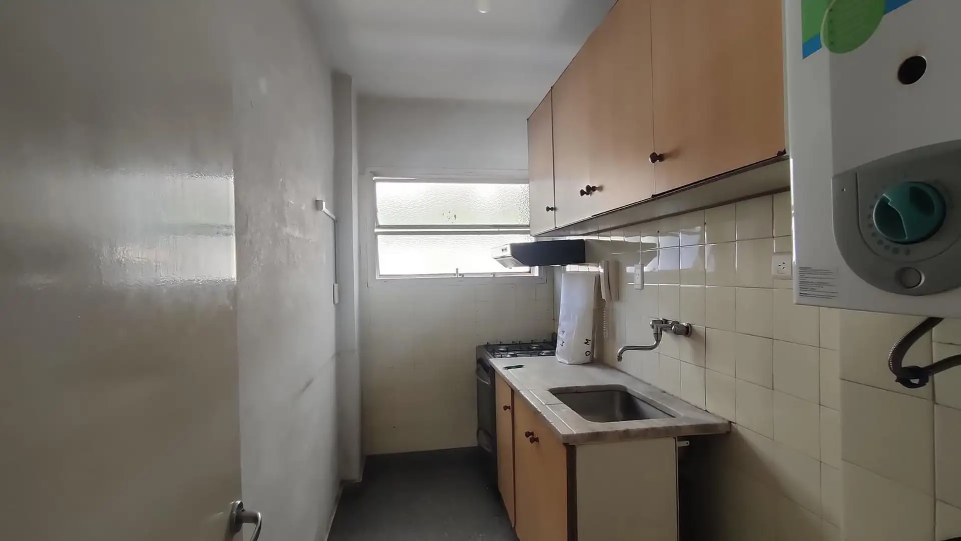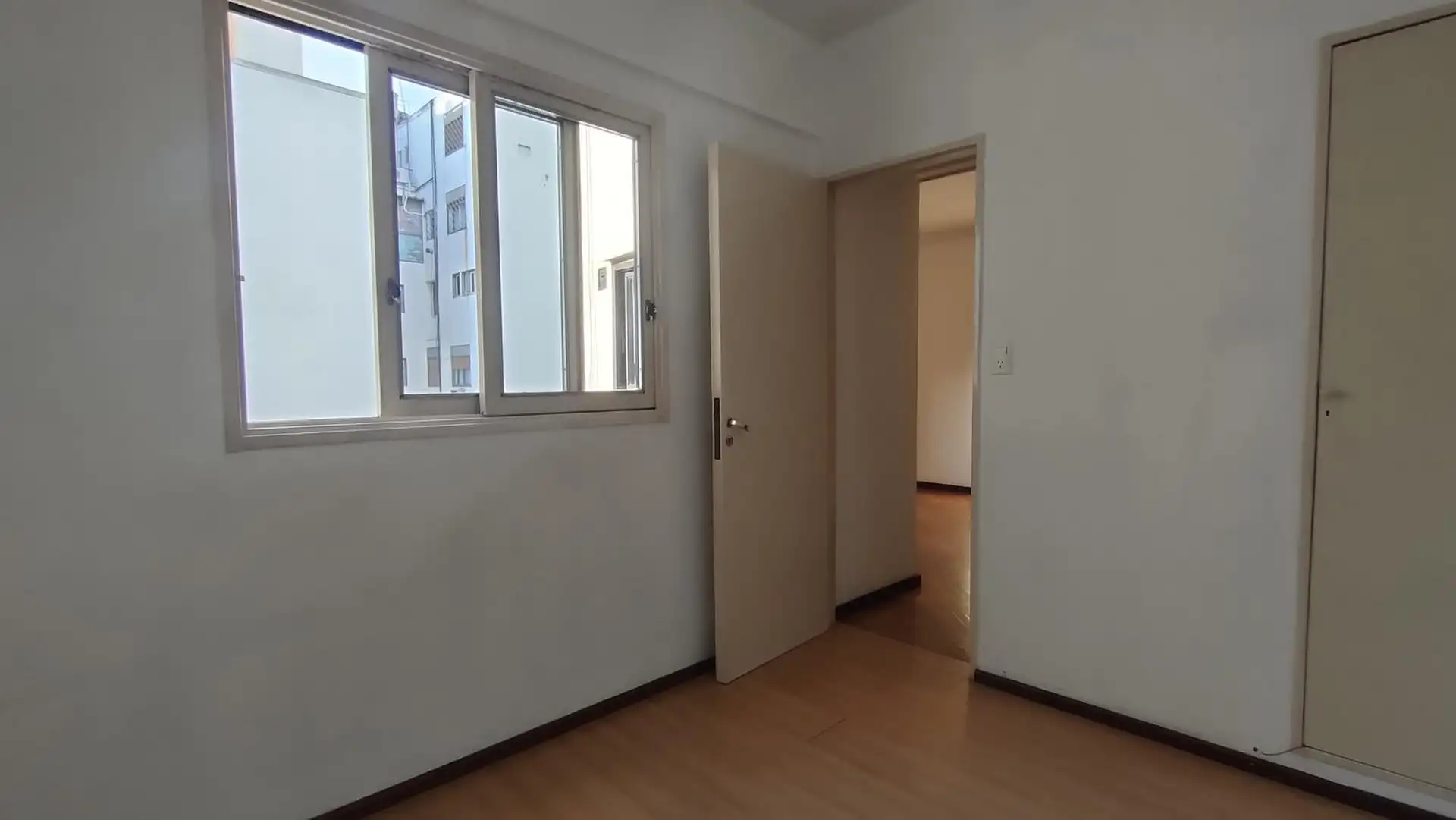 Apartamento de dois ambientes com 1 quarto, com orientação lateral para sul. A unidade tem living e sala de jantar (5,70 x 3,30), cozinha independente (3,30 x 1,60), banheiro (2,30 x 1,55) e dormitório com pequeno armário (3,30 x 2,50). Não aceita animais. Contrato de 2 anos, com reajuste trimestral pelo IPC; fiança locatícia com seguro caución e comprovação de renda. Ley 5115, Art. 1: imóvel não acessível para pessoas com mobilidade reduzida.