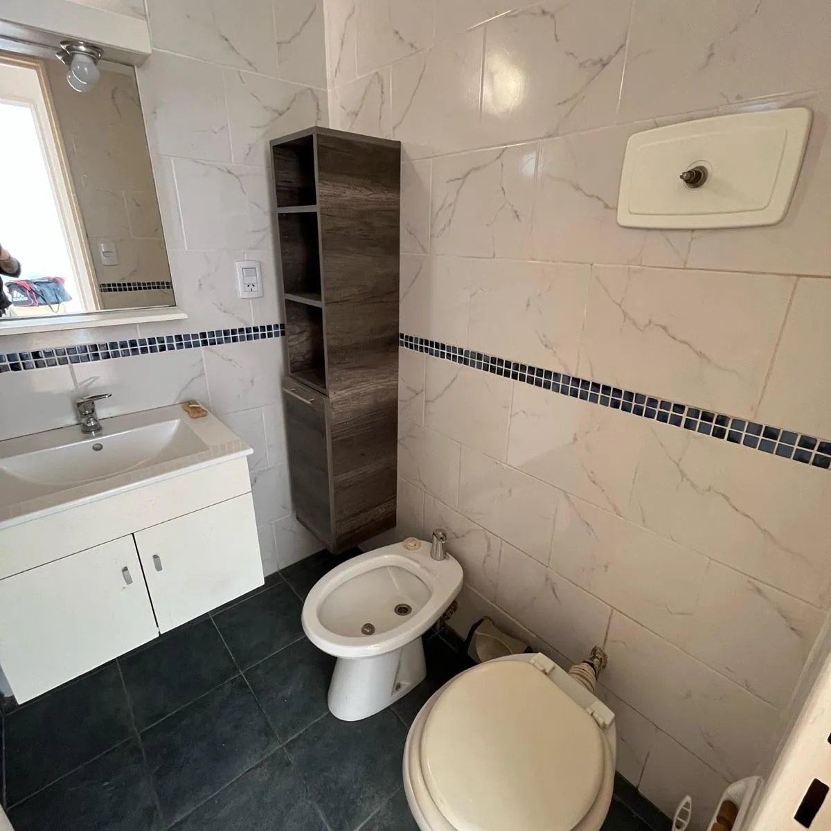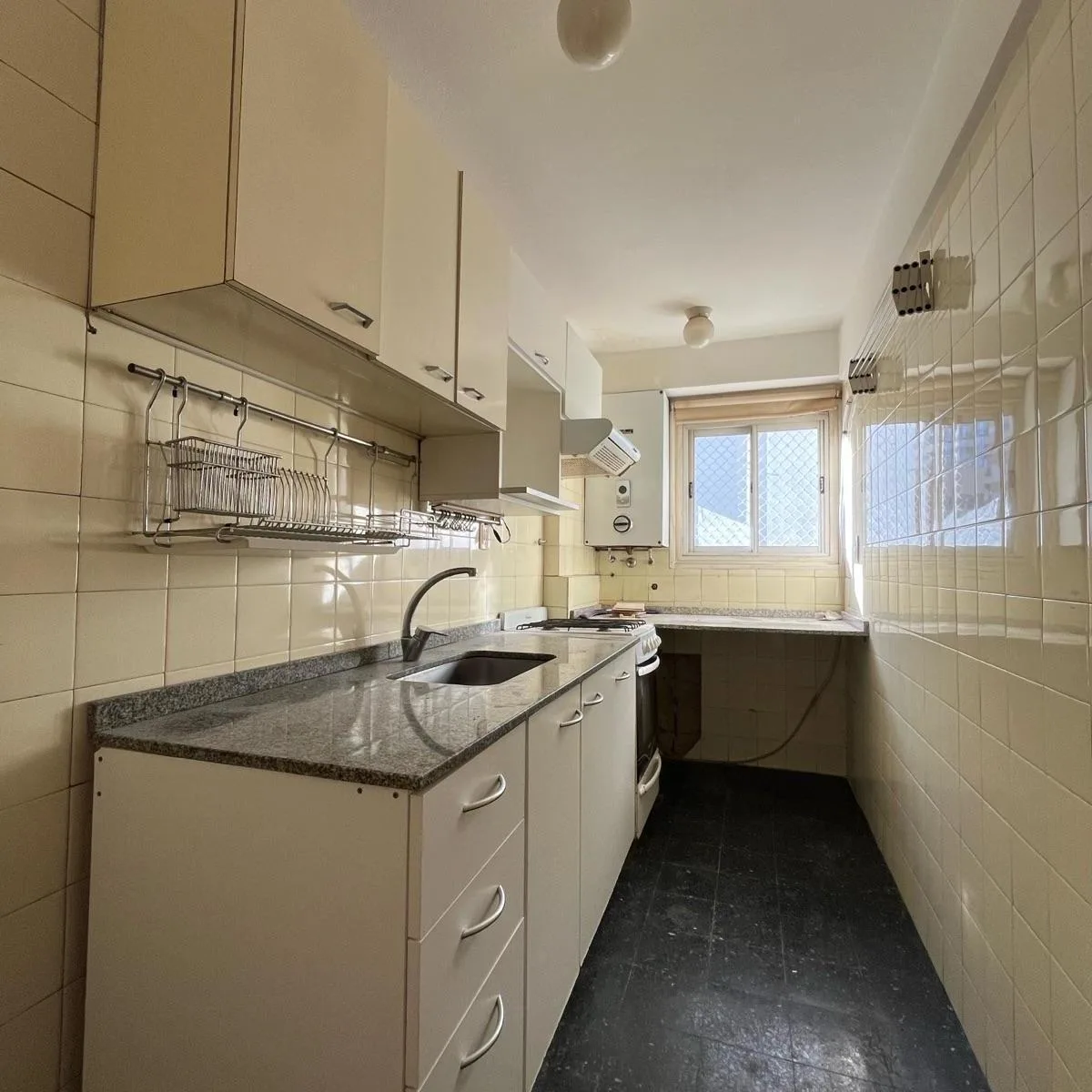 Apartamento de dois ambientes para alugar em Caballito. Possui living com ar-condicionado e aquecimento por tiro balanceado, e cozinha completa com armários inferiores e superiores, espaço para geladeira e para máquina de lavar, exaustor, fogão a gás e ventilação para o exterior. O dormitório tem piso do teto ao chão e ar-condicionado instalado; banheiro com banheira e gabinete (vanitory). Pisos em parquet e azulejos. Medidas indicadas: hall 1,10x2,30; living 4,70x3; cozinha 3,50x1,50; dormitóri