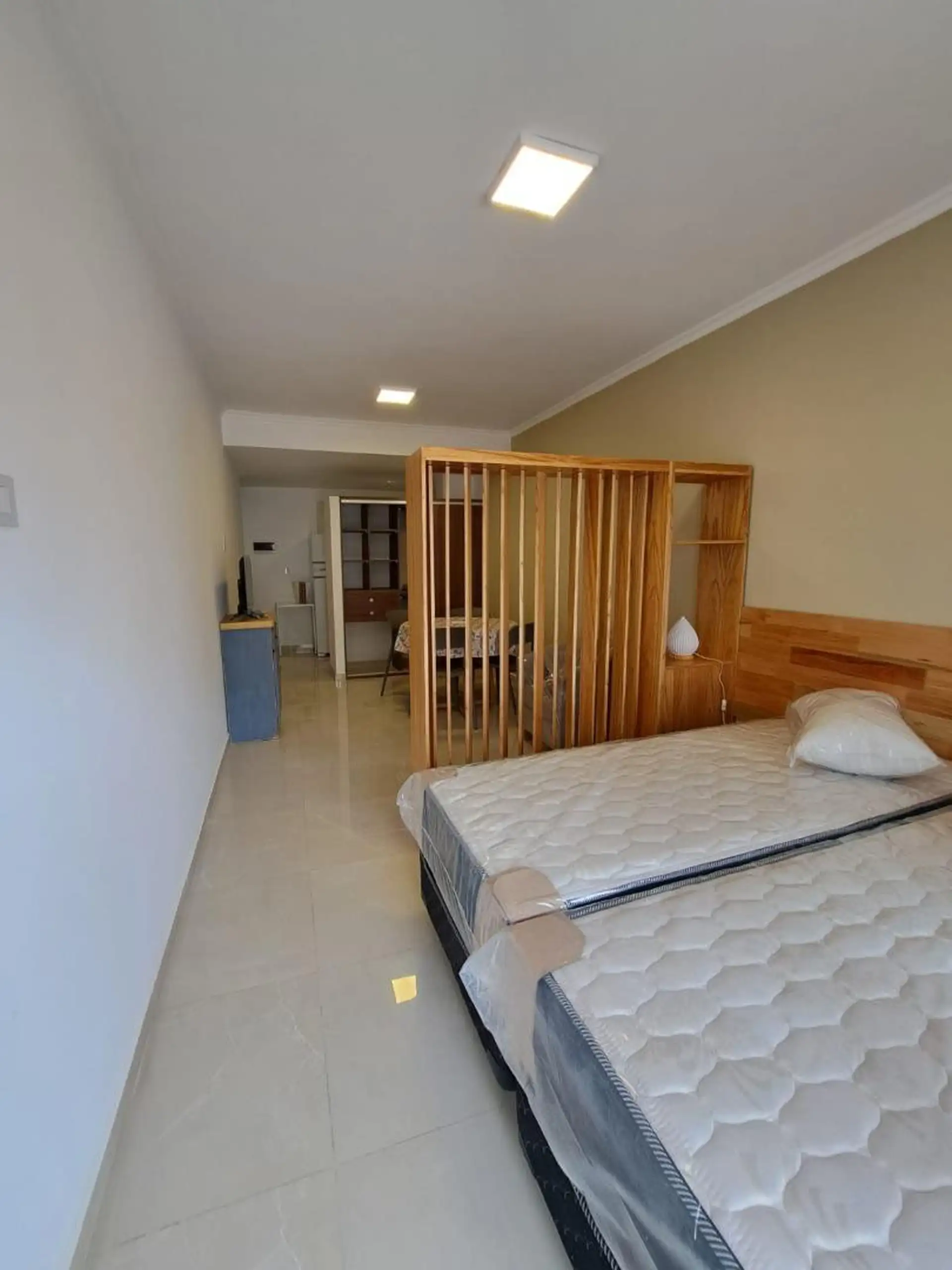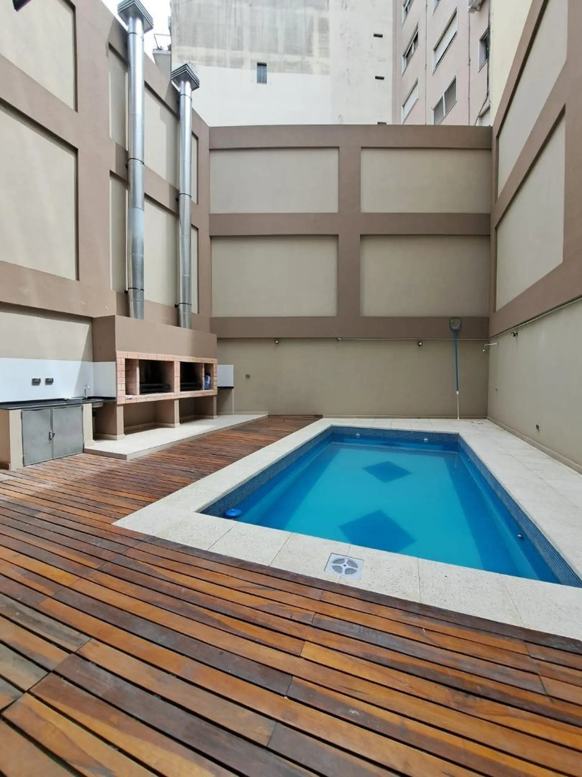 Kitnet mobiliada em Caballito, com cozinha independente e banheiro completo, cerca de 35 m². Possui cama de casal, TV e ar-condicionado frio/quente. A cozinha tem forno, geladeira e micro-ondas, além de chaleira elétrica e torradeira. Há varanda nos fundos com vista para a piscina; o prédio tem piscina, área de churrasco, salão comunitário, academia e bicicletário. A partir de 8 de junho de 2026; limpeza, consumo de eletricidade e condomínio são cobrados à parte.