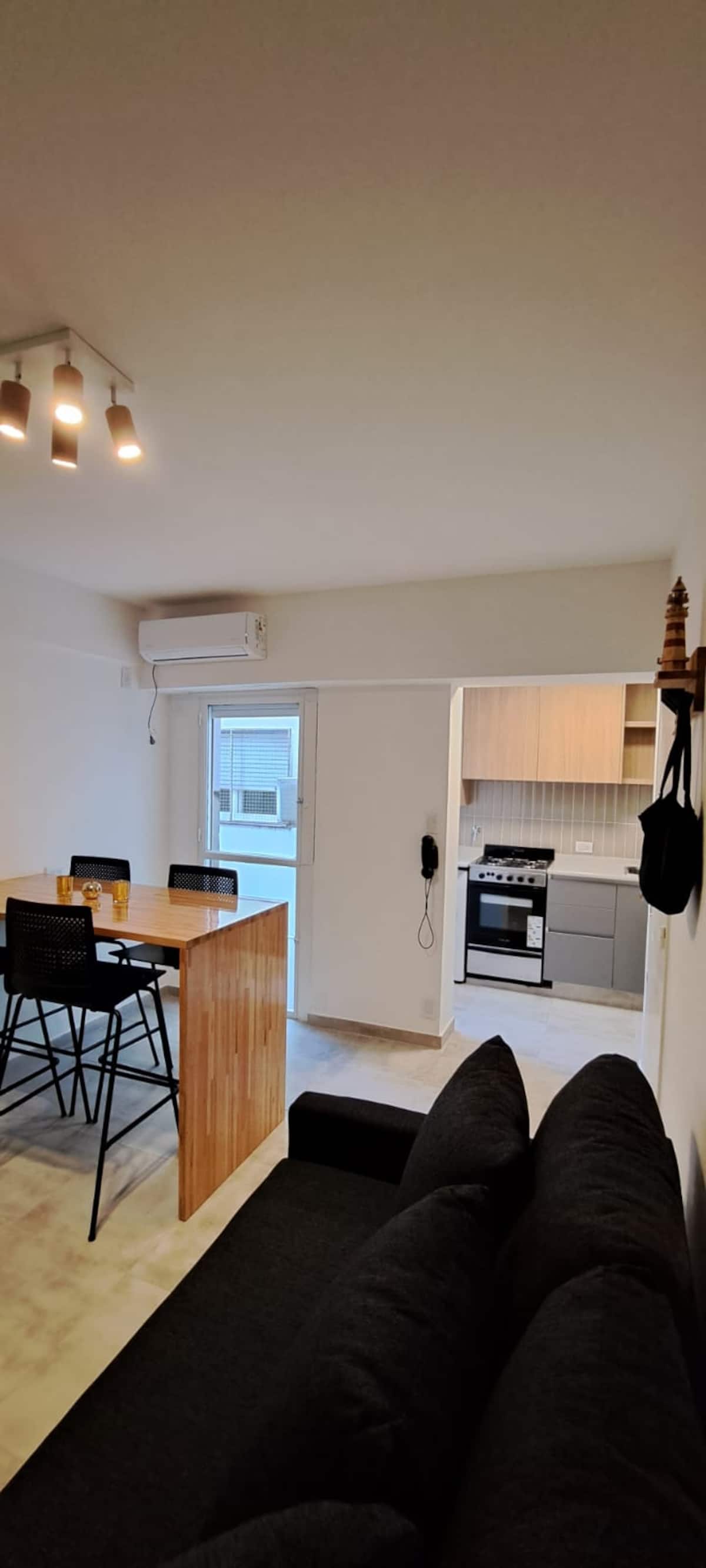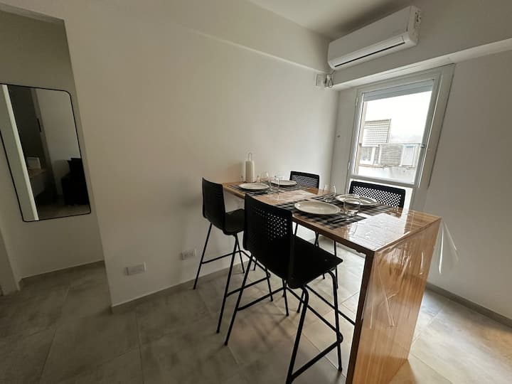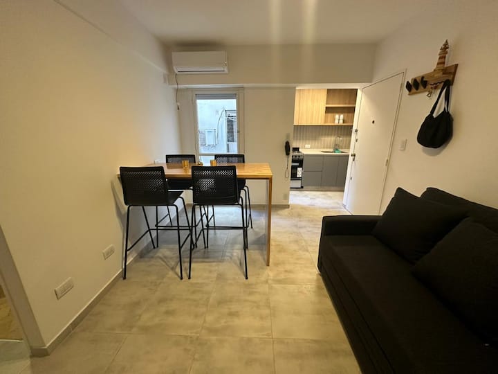 Apartamento em Chacarita com 2 ambientes, reformado, para até 4 pessoas. A unidade se destina a estadias com possibilidade de trabalho ou estudo, com serviço de internet. O prédio não tem garagem; o entorno permite estacionar. Fica a 3 quadras da Movistar Arena e a 2 quadras da estação Dorrego do metrô (Linha B), na interseção das Av Corrientes e Dorrego.