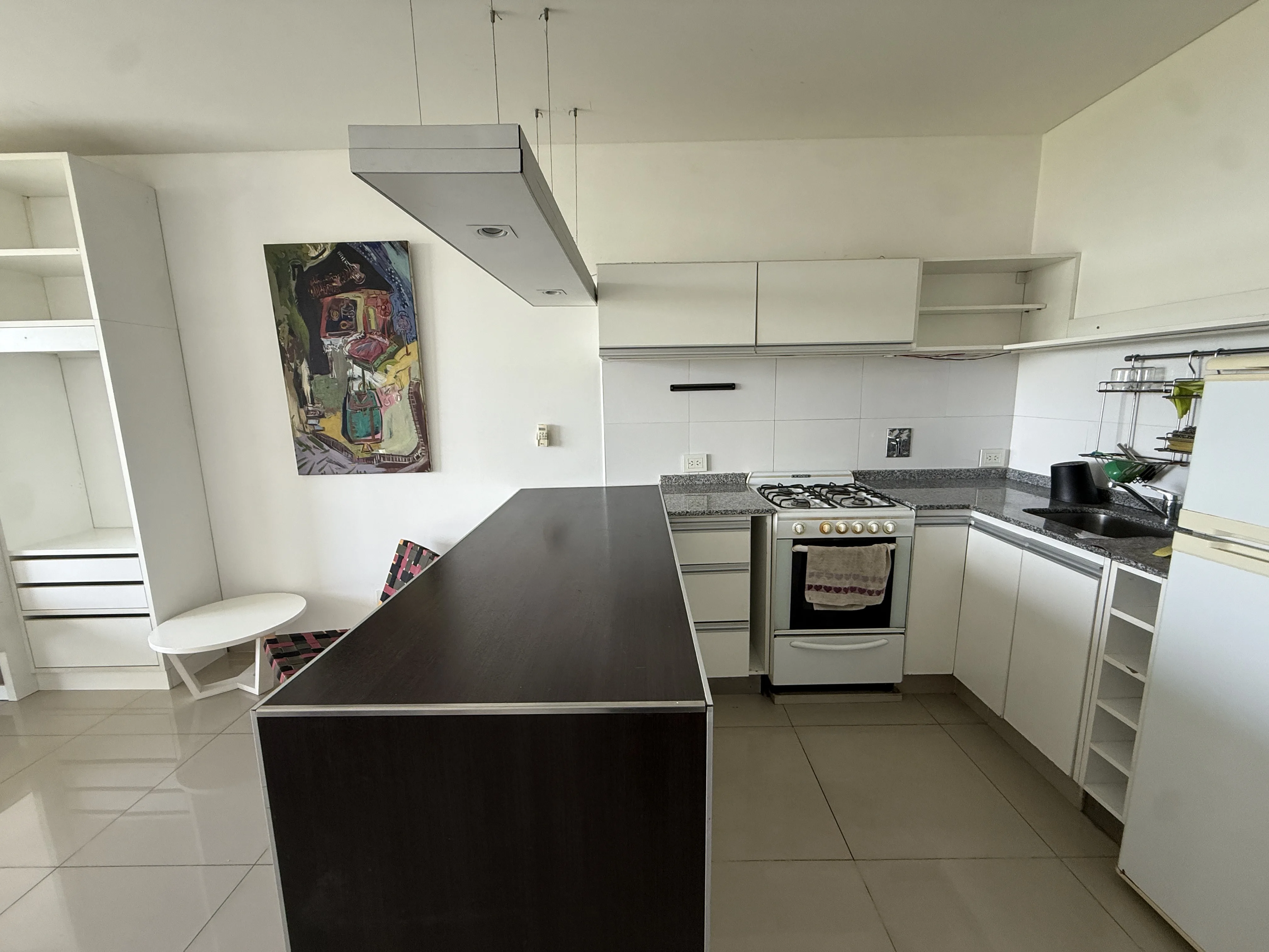 Kitnet mobiliada em Chacarita, com cozinha equipada com geladeira e micro-ondas, e cama retrátil que sobe e desce. Conta com armário e área de armazenamento, além de bancada de madeira com cadeiras e 2 banquetas. O edifício tem área de churrasco no térreo e espaço para guardar bicicletas, sem lavanderia no prédio e sem conexão para lavadora; condomínio com baixas expensas.