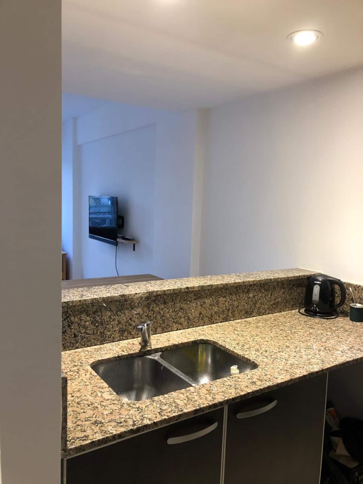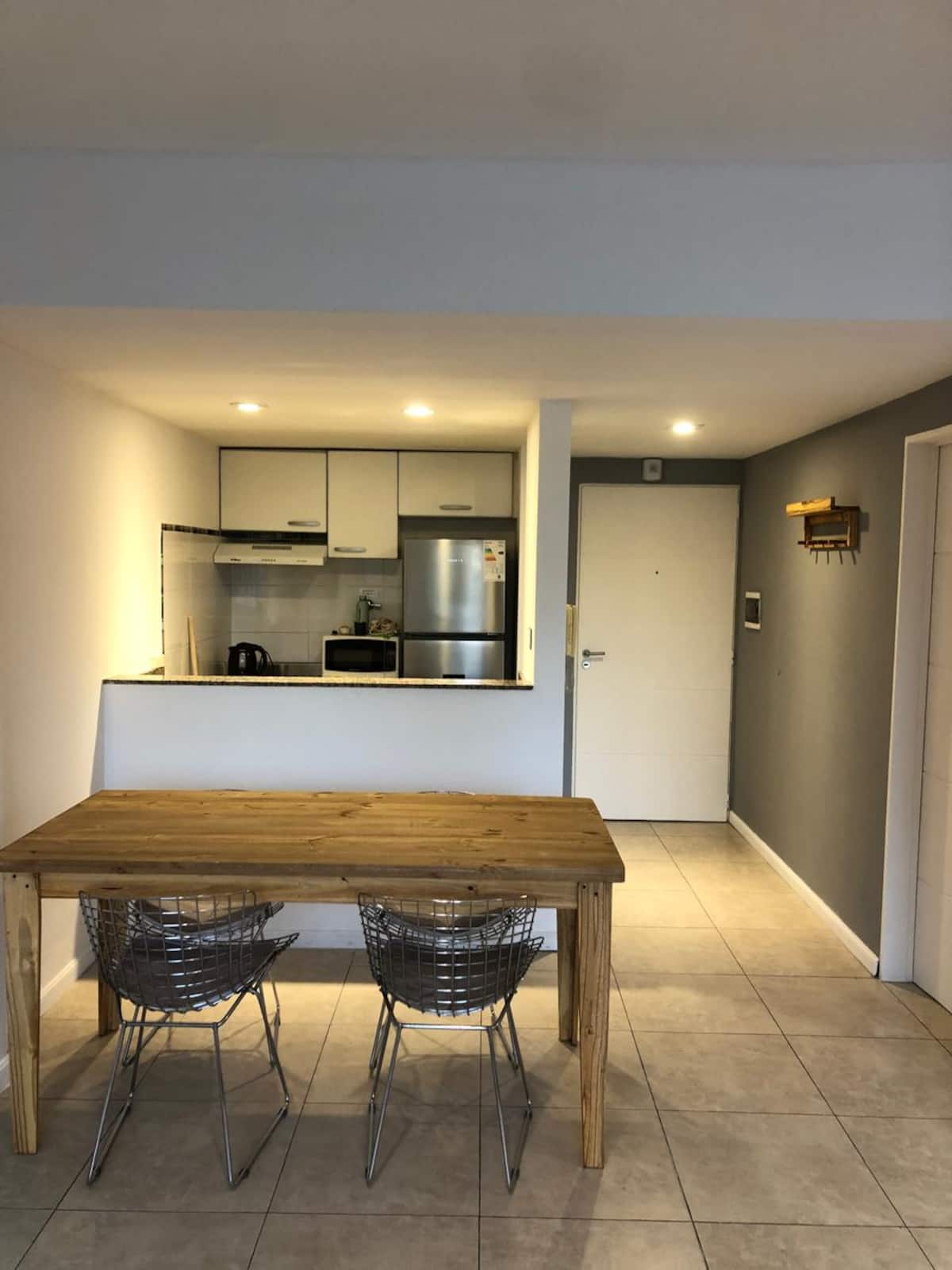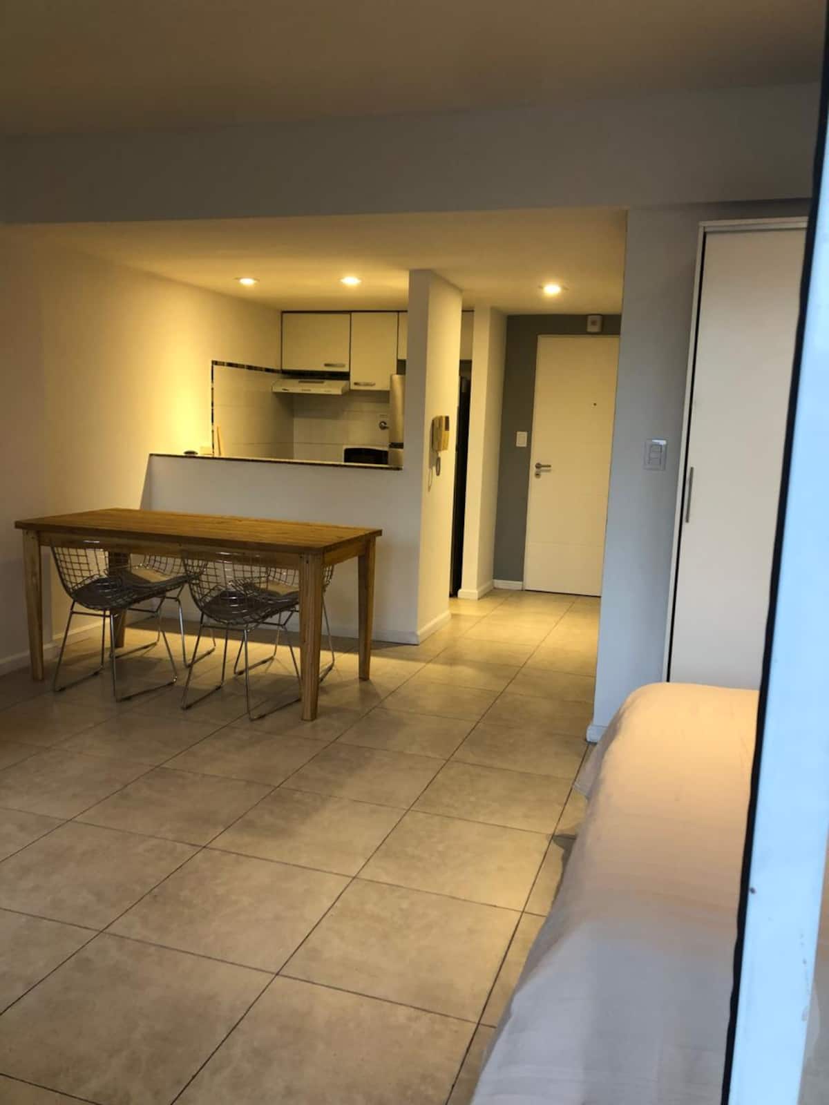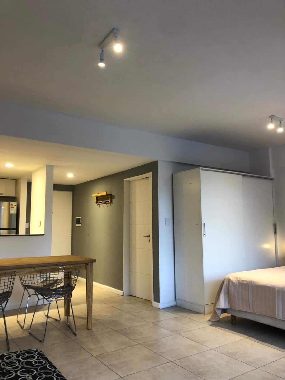 Apartamento tipo kitnet em Chacarita. O imóvel fica a 600 metros da Estação Ferroviária Federico Lacroze e a 2,1 km da Movistar Arena. Tem cama de casal e sofá-cama com carrinho e duas camas (colchões), além de ar-condicionado frio/quente. A cozinha inclui geladeira, forno e micro-ondas, além de chaleira elétrica e máquina de lavar.