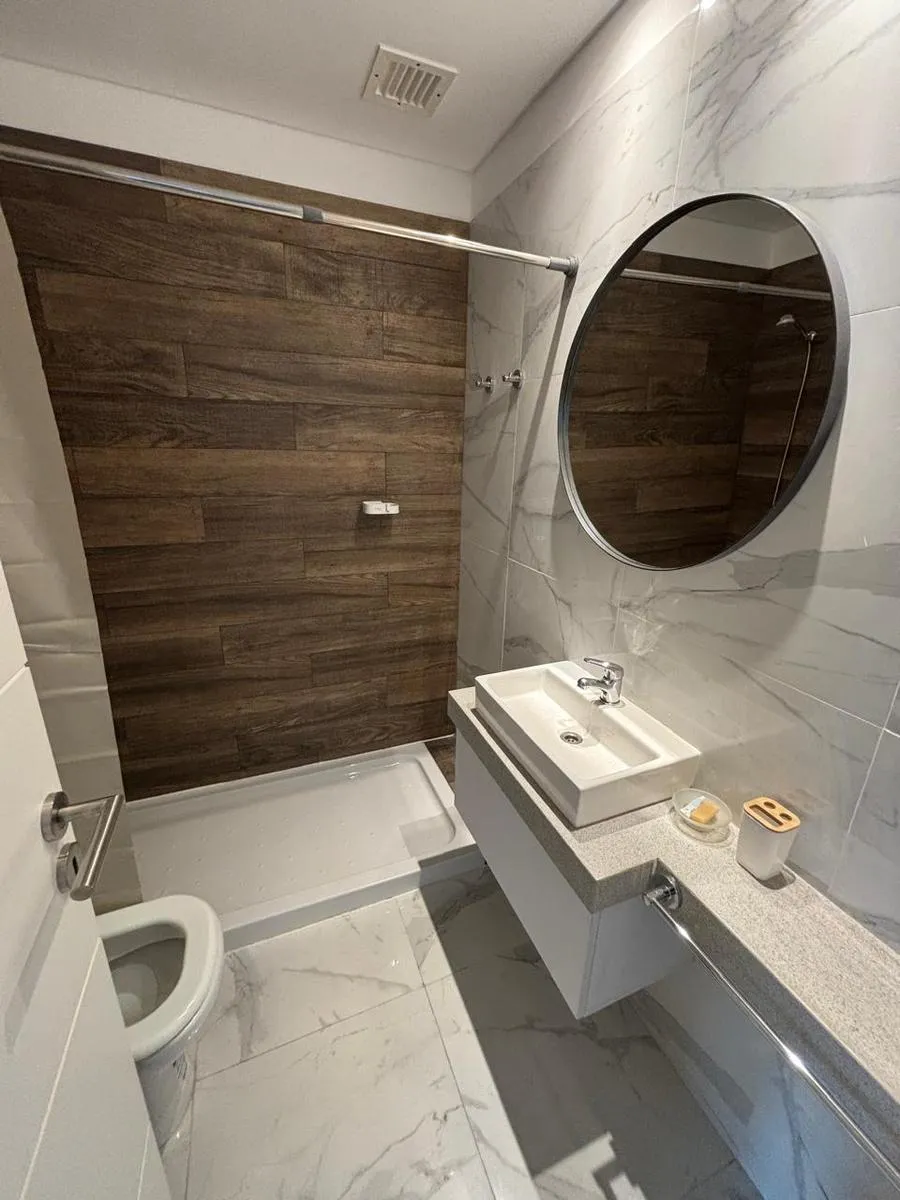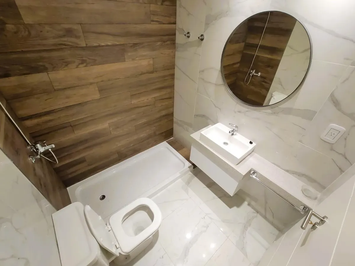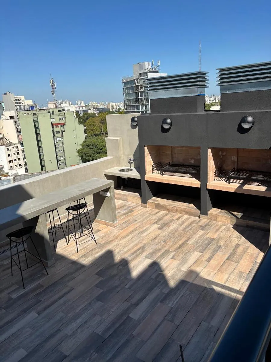 Apartamento em aluguel temporário, novo (nunca habitado), em Chacarita, no Distrito Maure. Planta tipo monoambiente dividido em L, com sala/cozinha e saída para varanda ampla contínua, banheiro completo e cozinha com área de despensa e armário sob a pia. É entregue totalmente mobiliado, com louças, micro-ondas, TV smart, ar-condicionado frio e quente e roupa de cama; janelas com cortinas blackout e venezianas de voal; luminárias em todos os ambientes. Água quente central e equipamentos elétricos