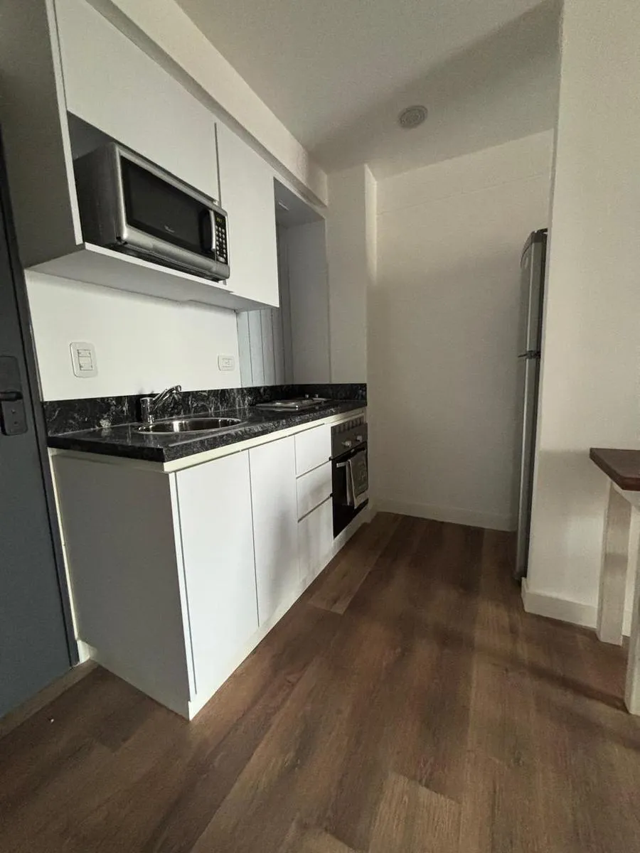 Apartamento de aluguel temporário em Chacarita, novo (nunca habitado), em Distrito Maure. Unidade monoambiente dividido em L, com área de estar e jantar e saída para varanda longa, banheiro completo e cozinha com espaço de despensa e armário inferior. É entregue totalmente mobiliado, com utensílios, micro-ondas, TV smart, ar-condicionado frio e quente e roupa de cama. O aluguel é de US$ 750 por mês, pacote com condomínio, ABL, AYSA e wifi; não inclui eletricidade. Capacidade para 2 hóspedes. O p
