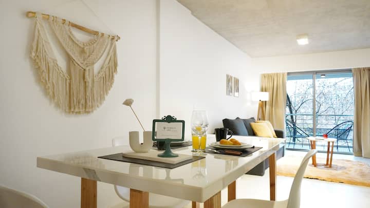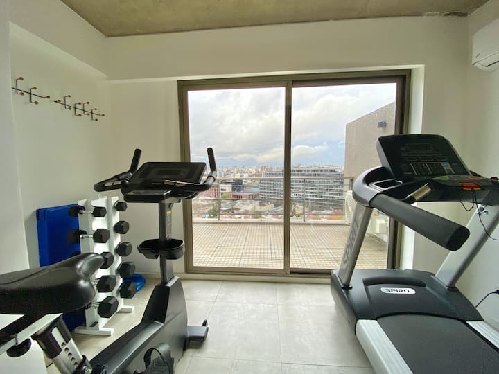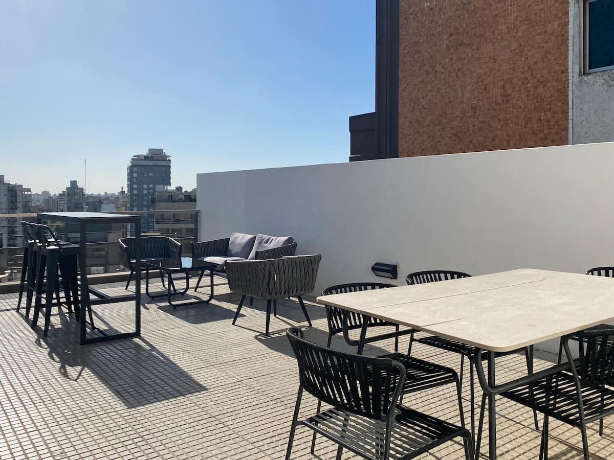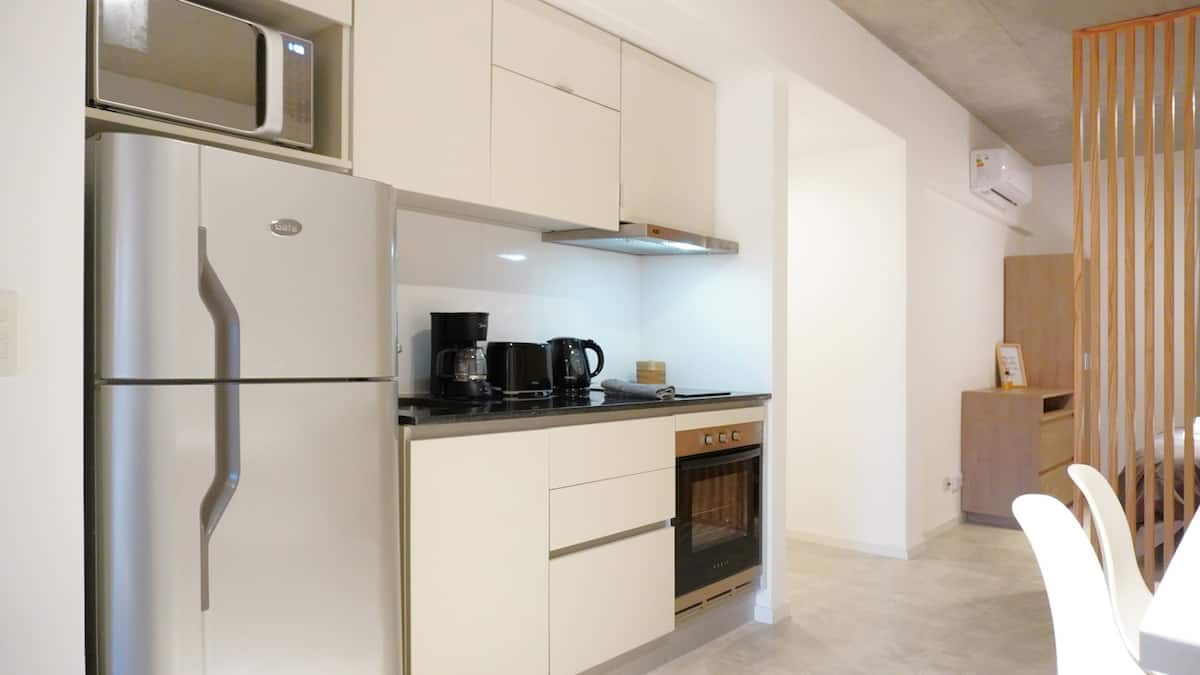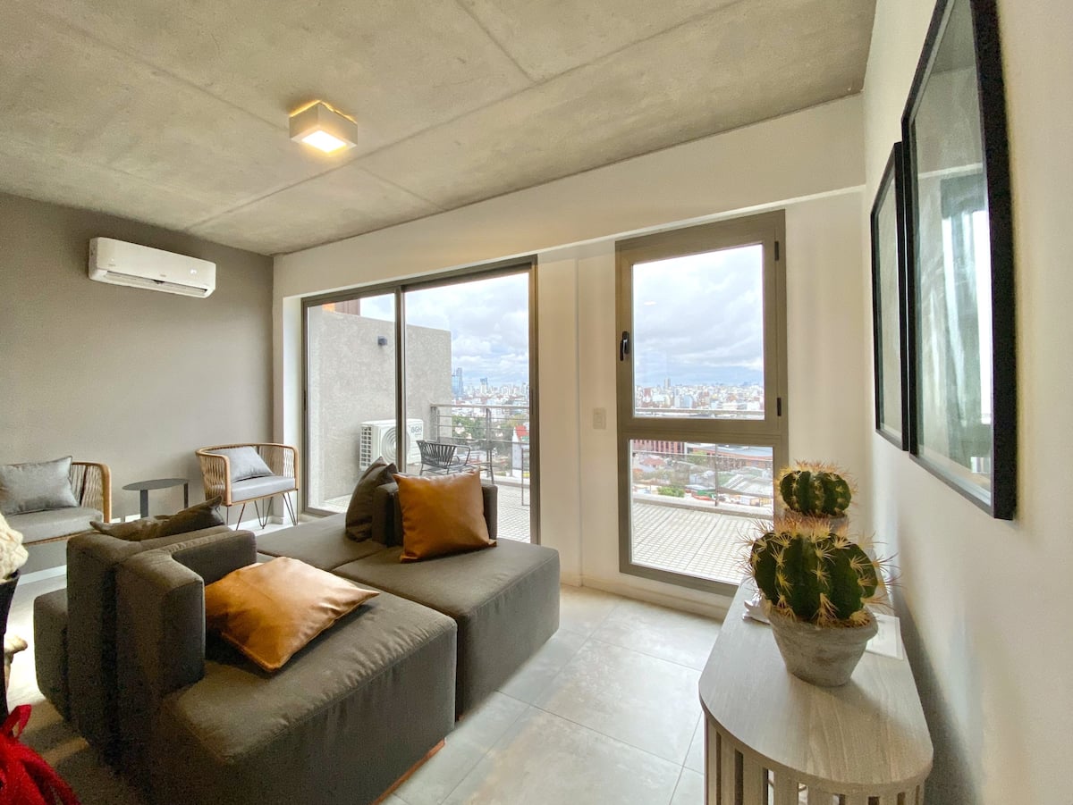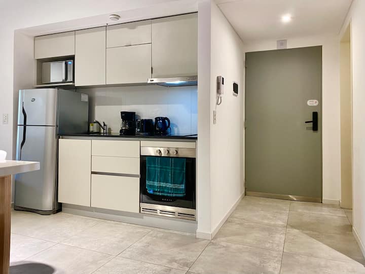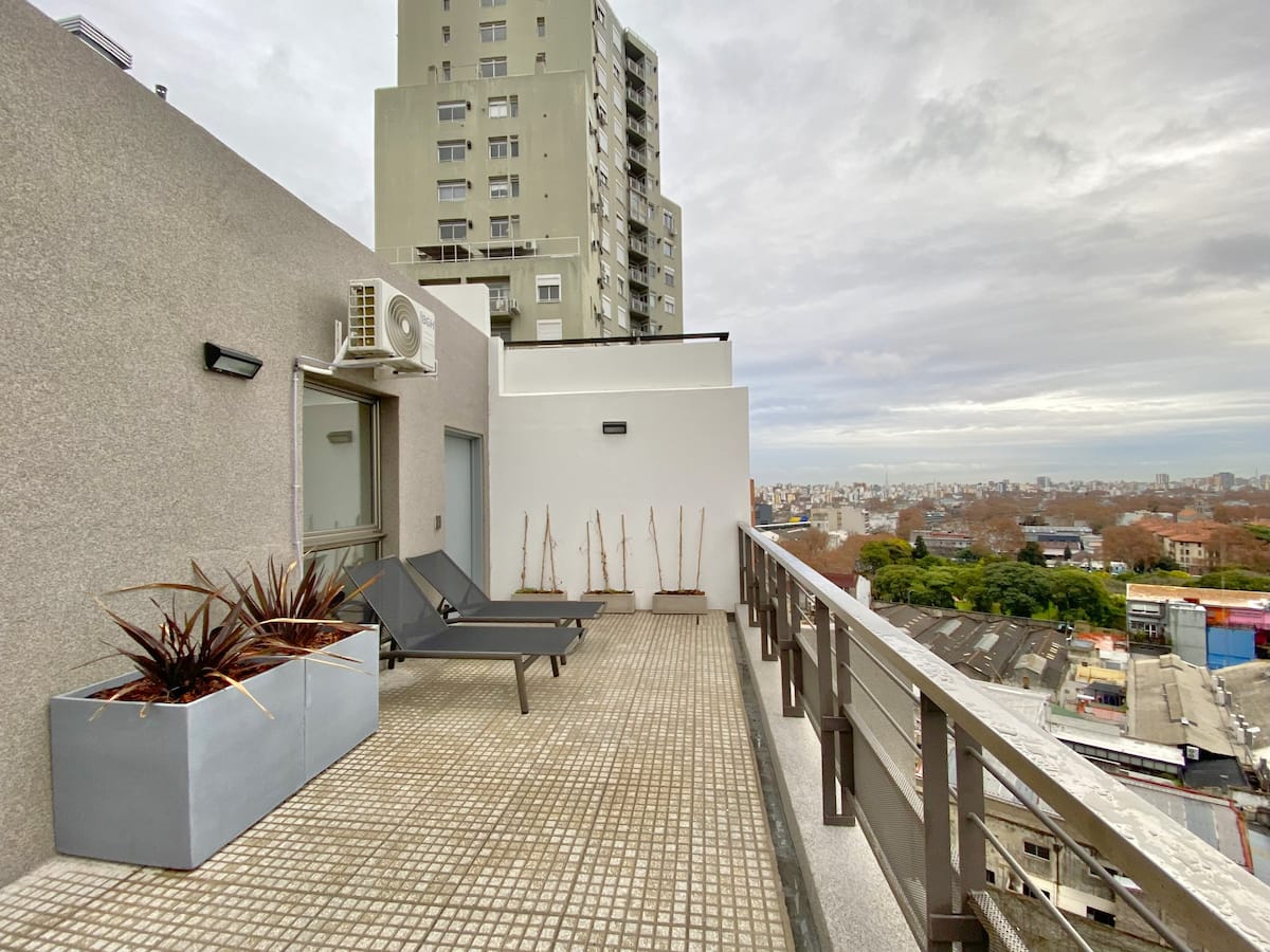 Kitnet no Chacarita, com área integrada e varanda externa. O prédio oferece coworking, academia e terraço com vista panorâmica. Fica a 3 quadras da Movistar Arena.