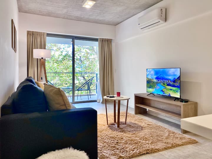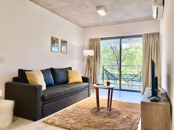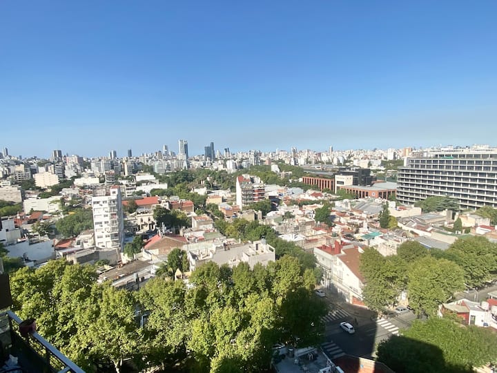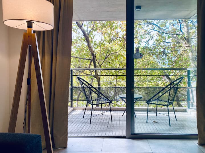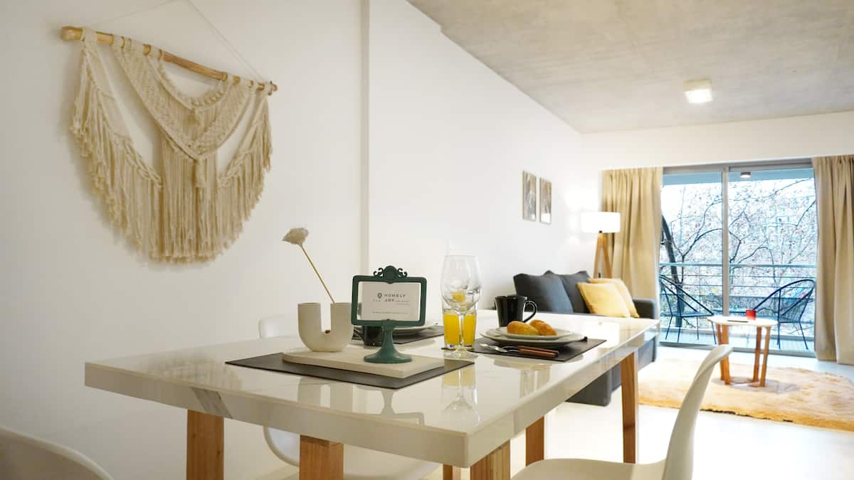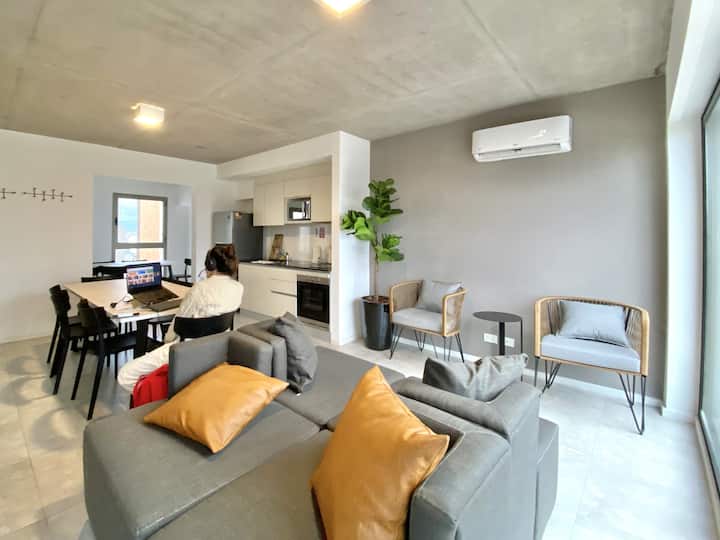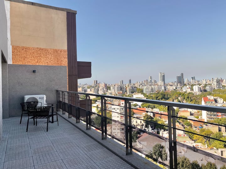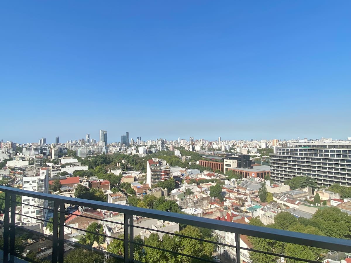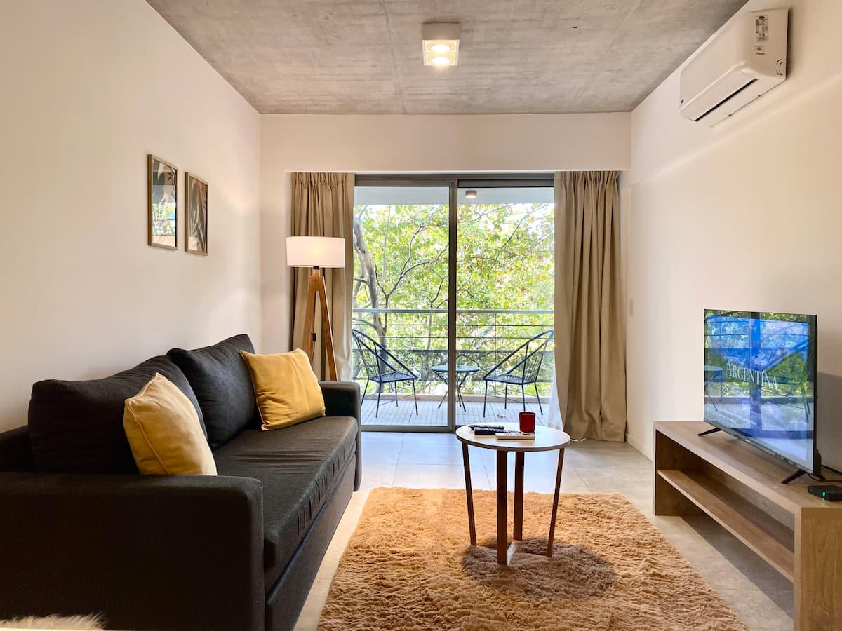 Kitnet no Chacarita, com área integrada e varanda externa. O prédio oferece coworking, academia e terraço com vista panorâmica. Fica a 3 quadras da Movistar Arena.