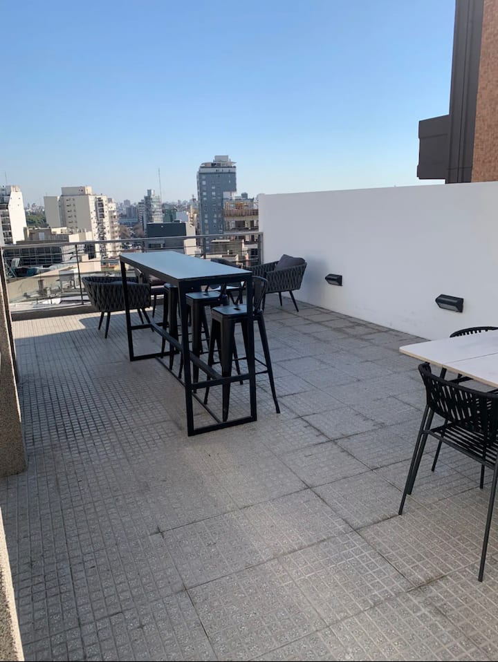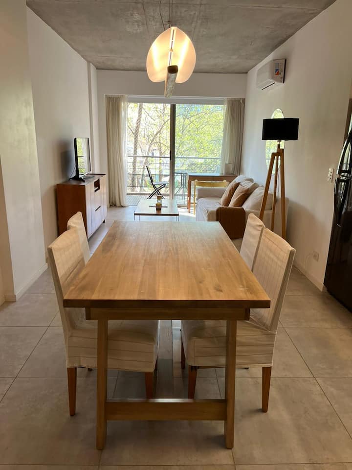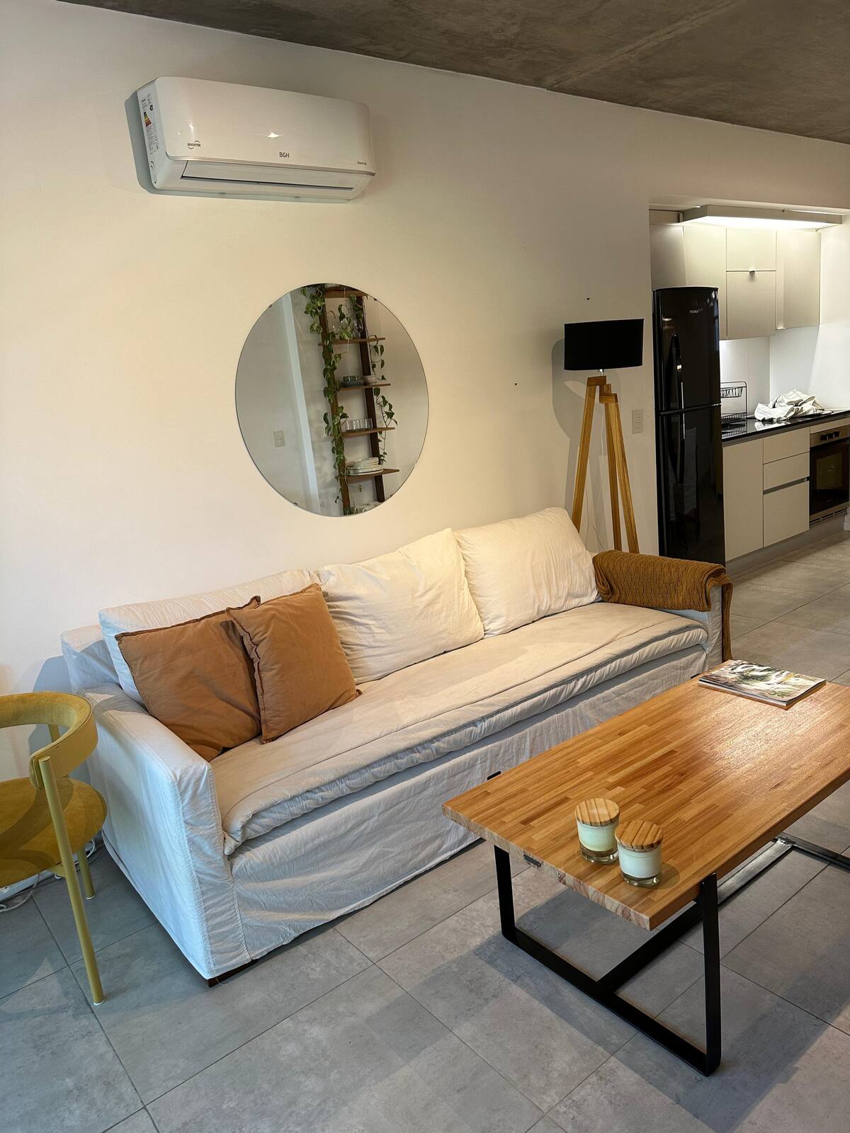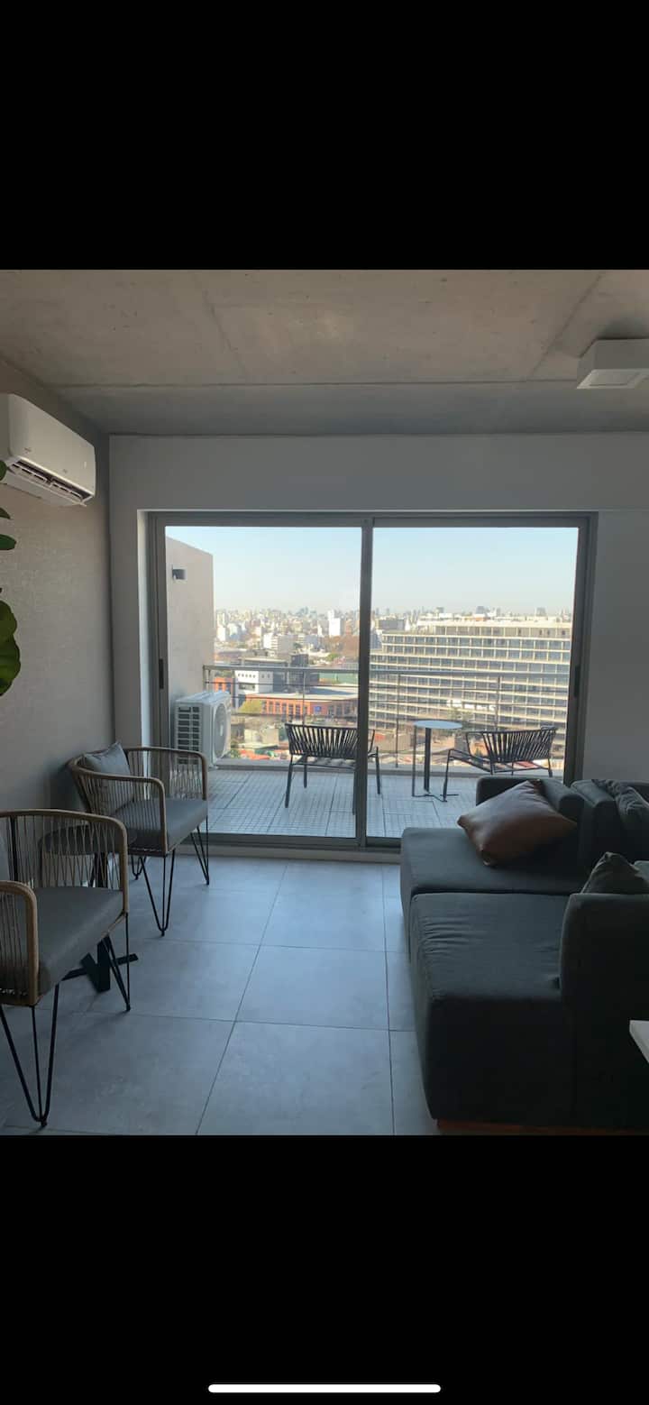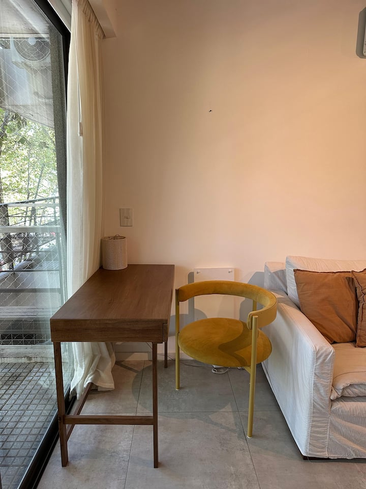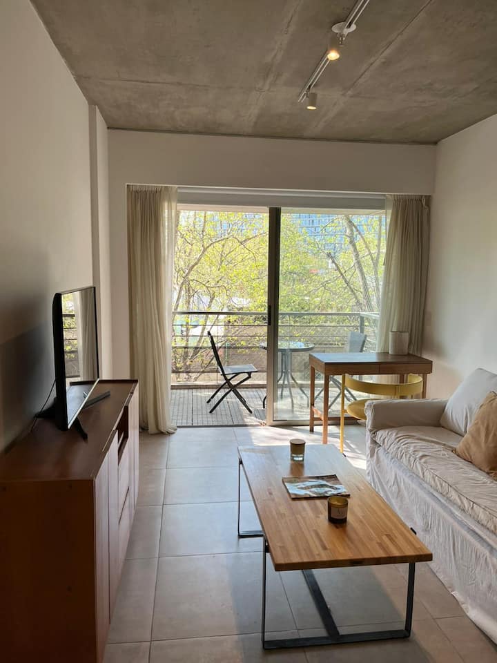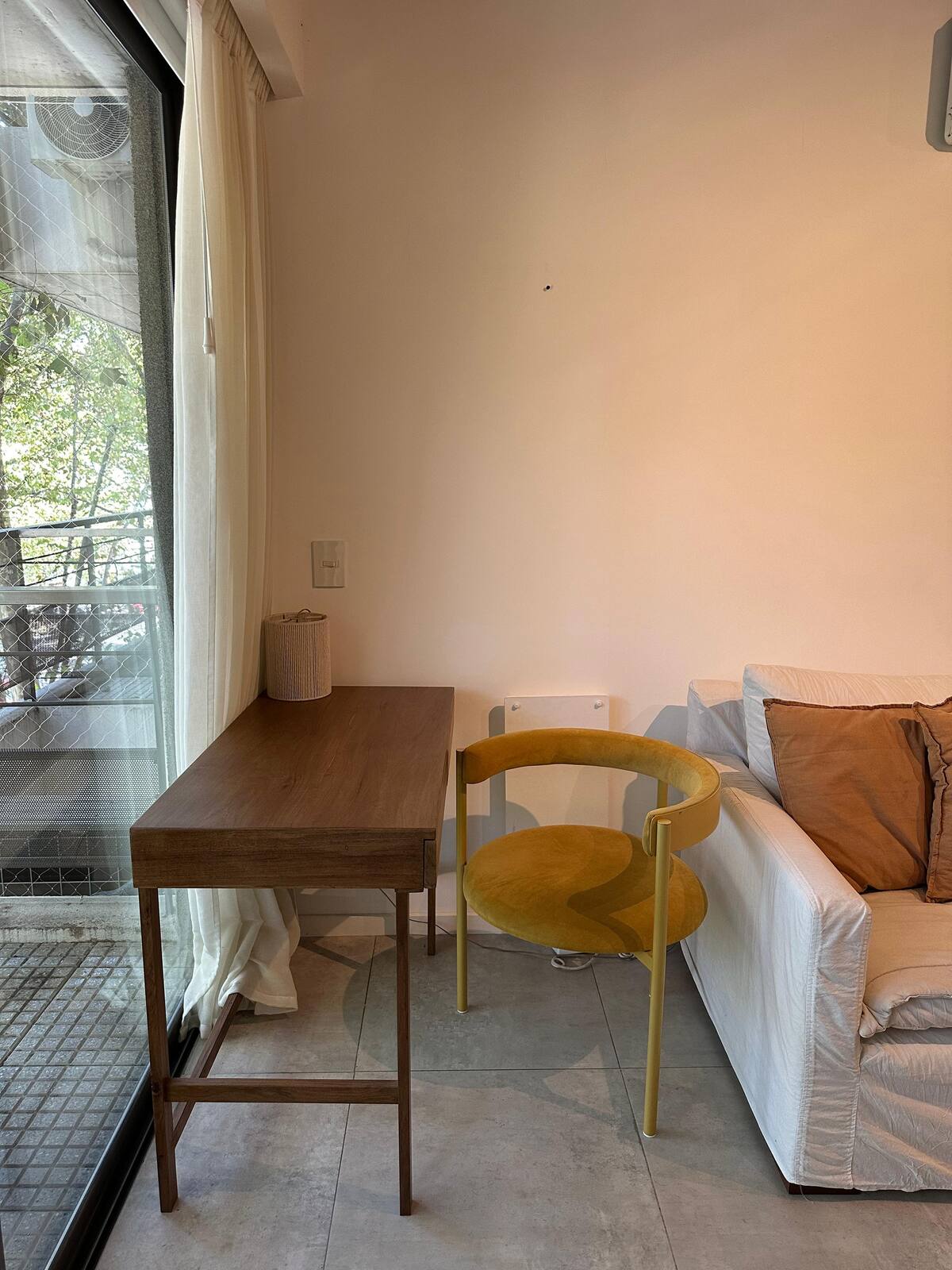 Kitnet em Chacarita, com varanda. Cozinha totalmente equipada, sala com mesa de madeira para quatro pessoas e sofá de três lugares. Há Smart TV para uso na área de estar.