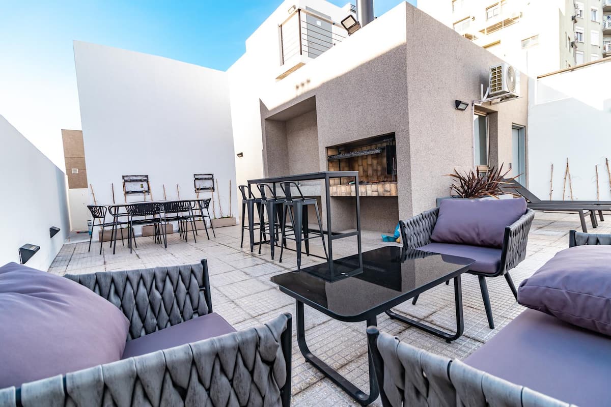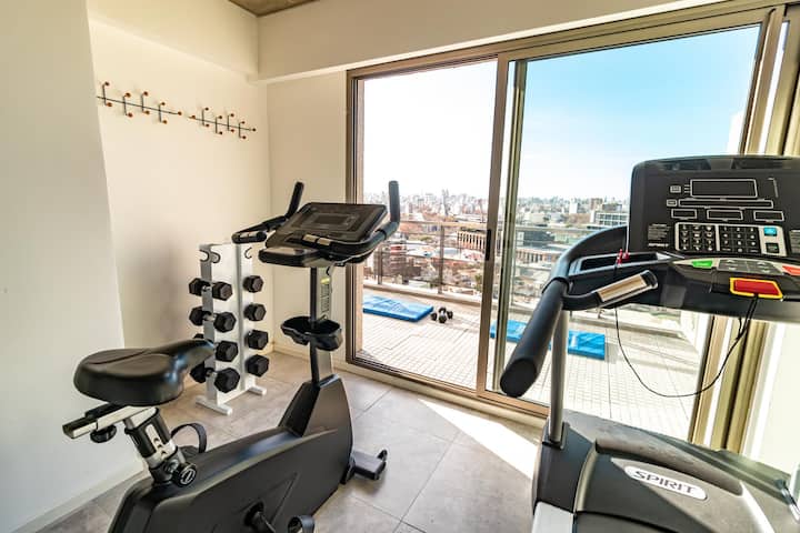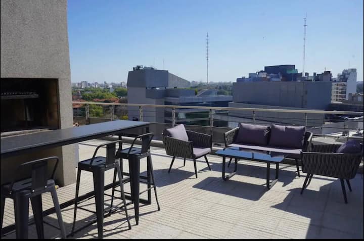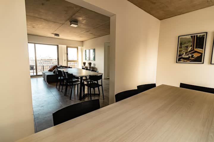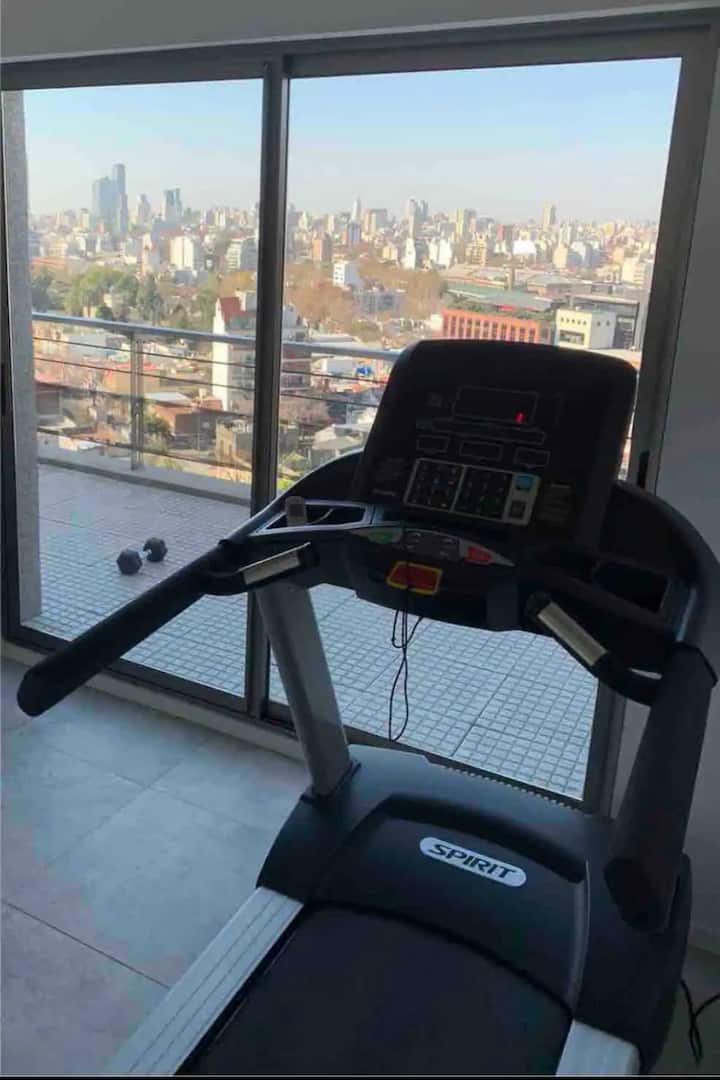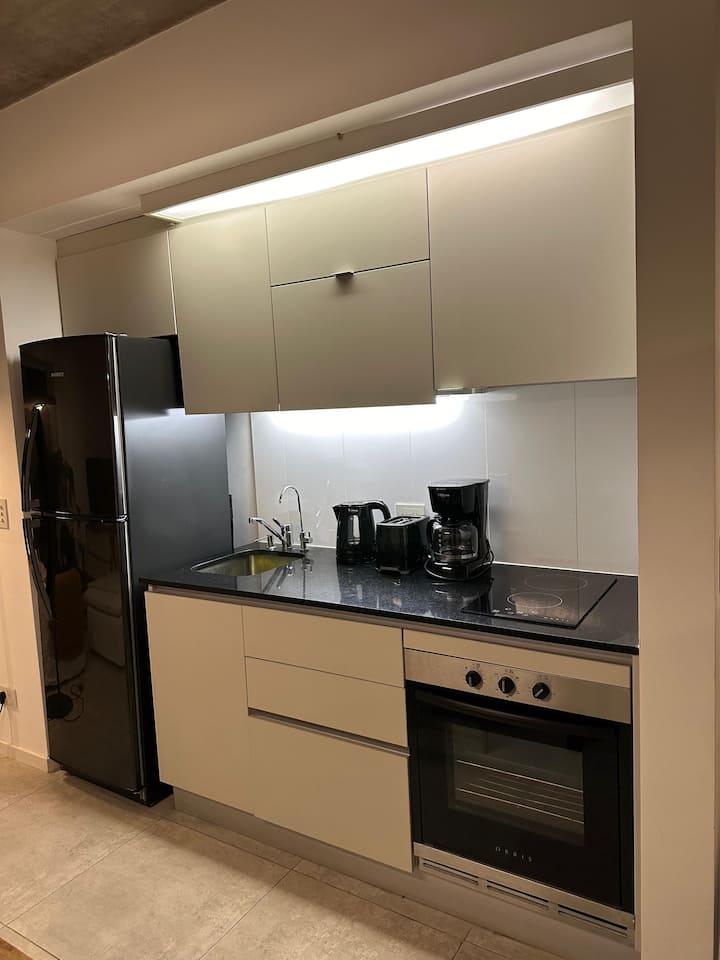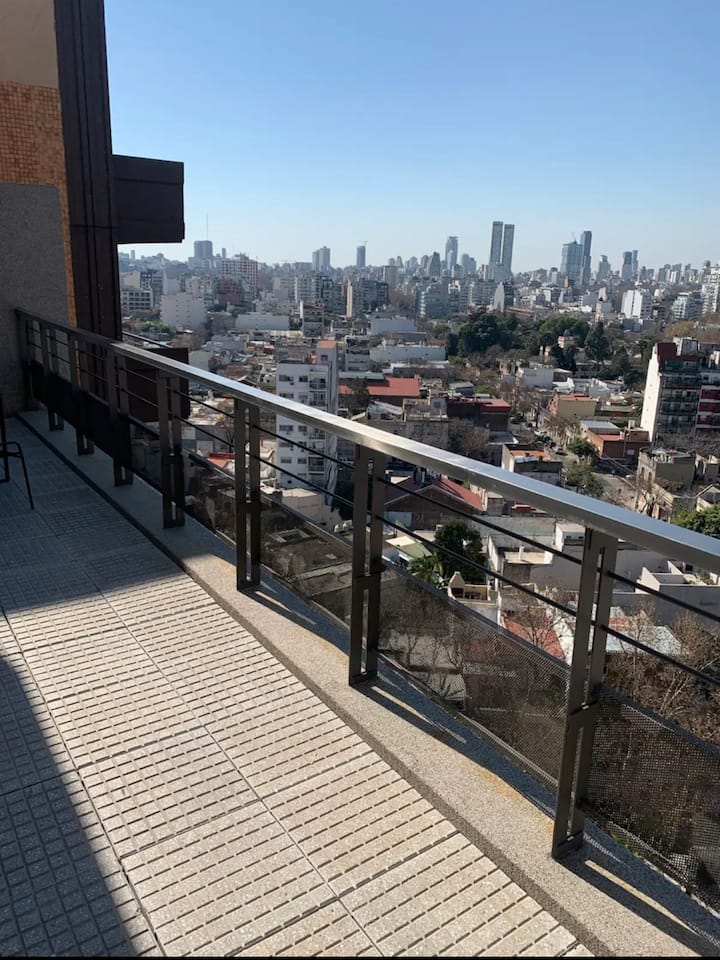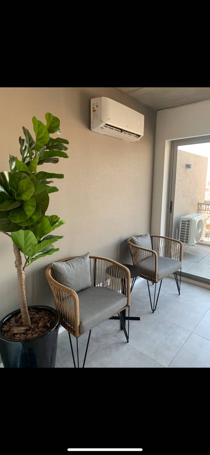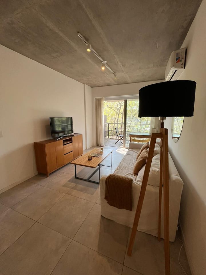 Kitnet em Chacarita, com varanda. Cozinha totalmente equipada, sala com mesa de madeira para quatro pessoas e sofá de três lugares. Há Smart TV para uso na área de estar.