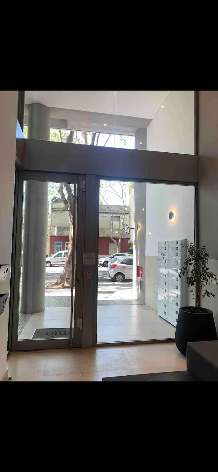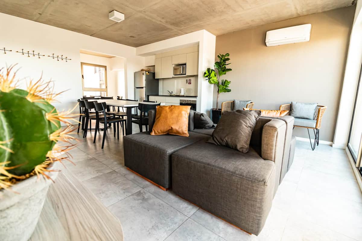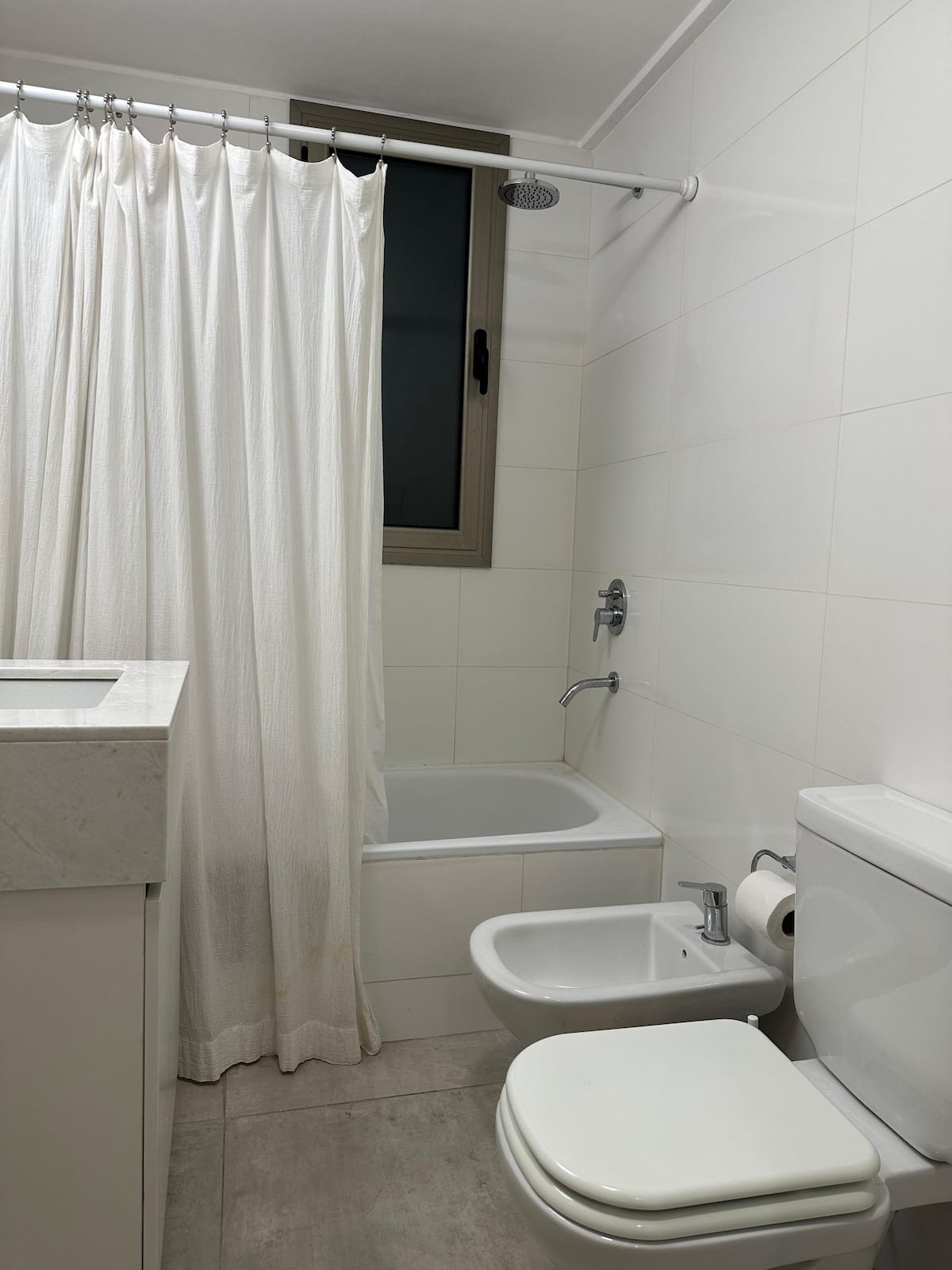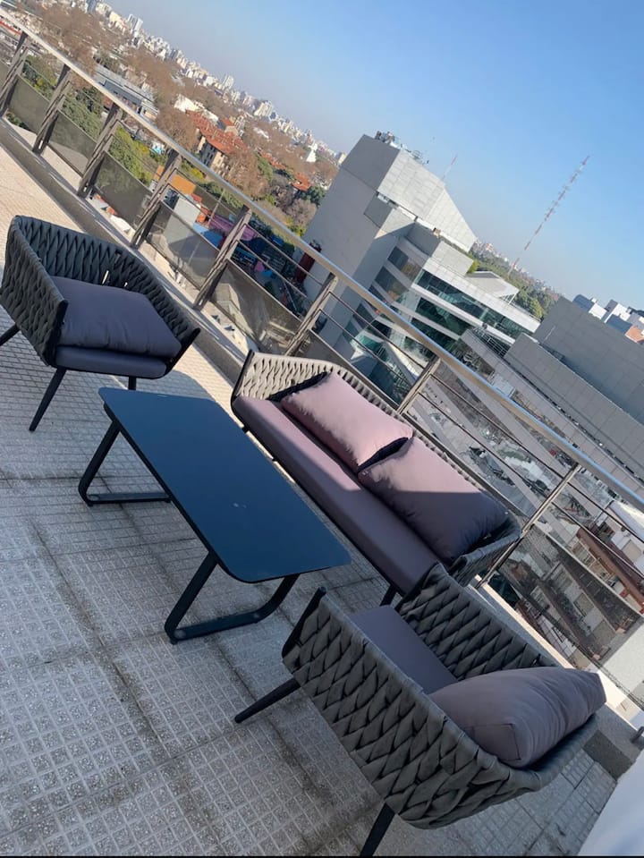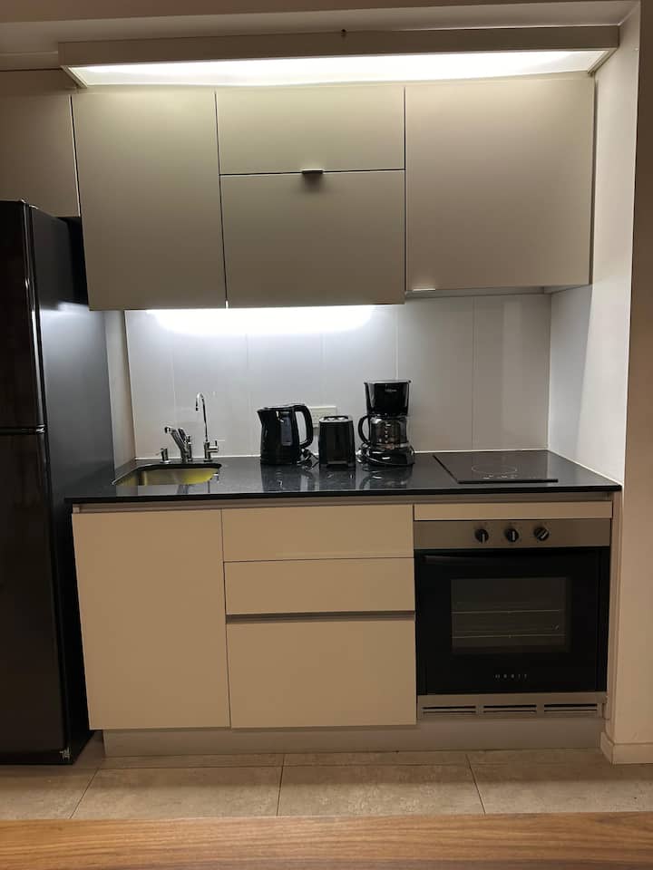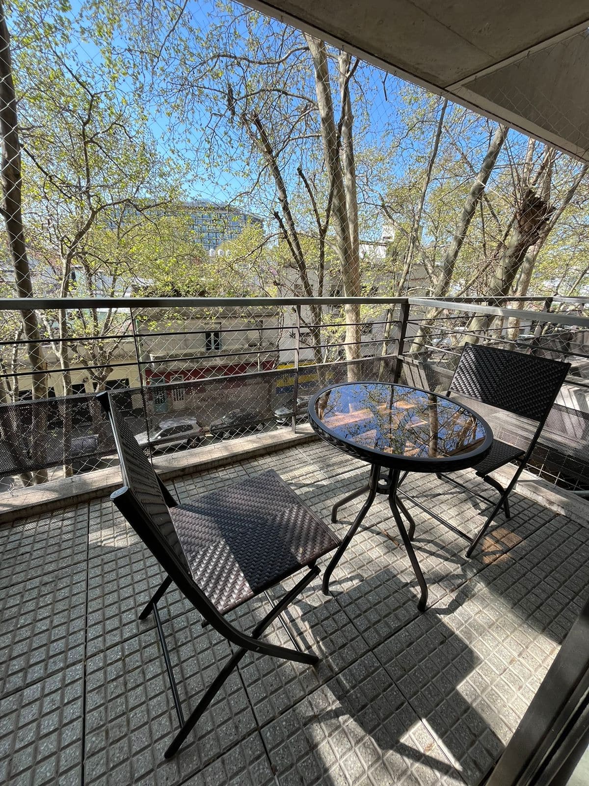 Kitnet em Chacarita, com varanda. Cozinha totalmente equipada, sala com mesa de madeira para quatro pessoas e sofá de três lugares. Há Smart TV para uso na área de estar.