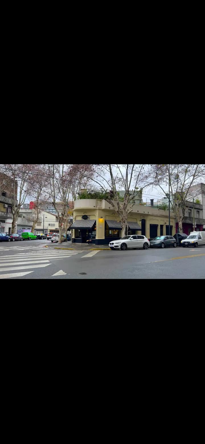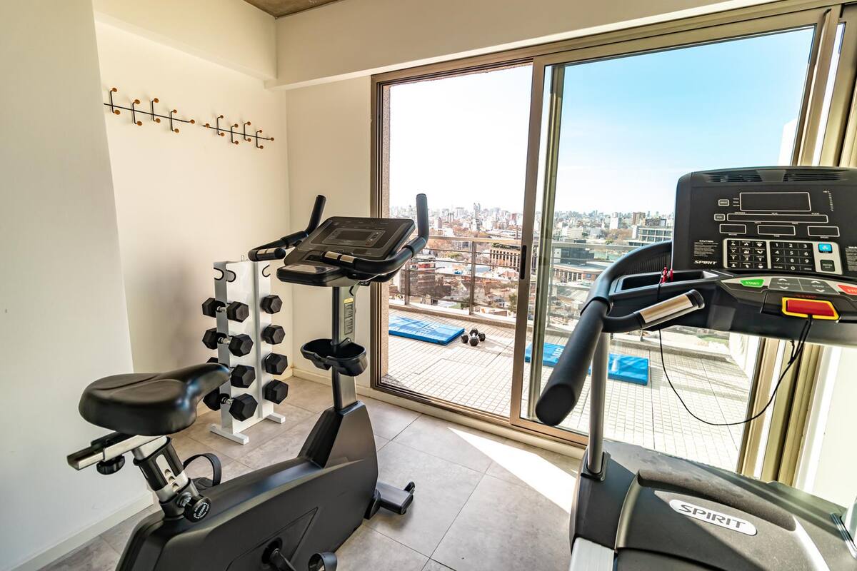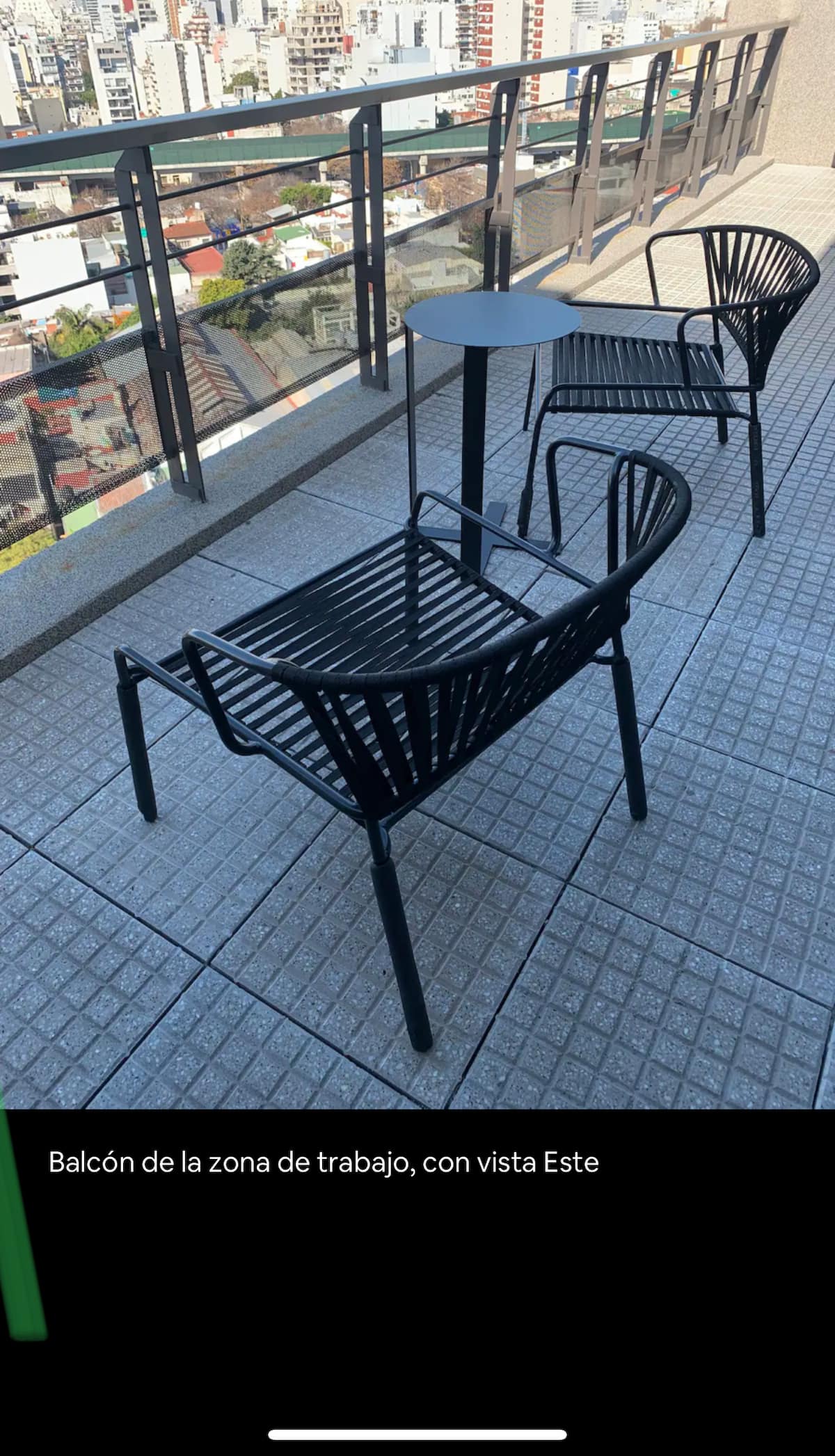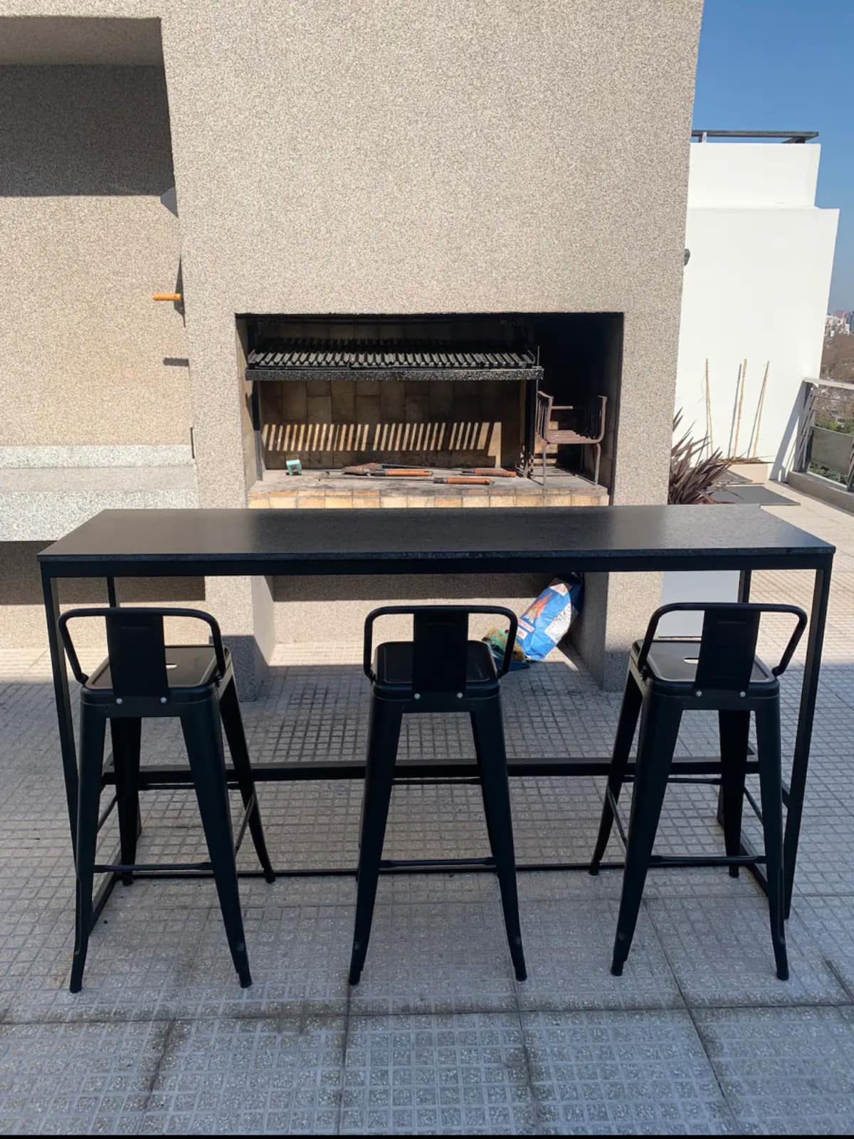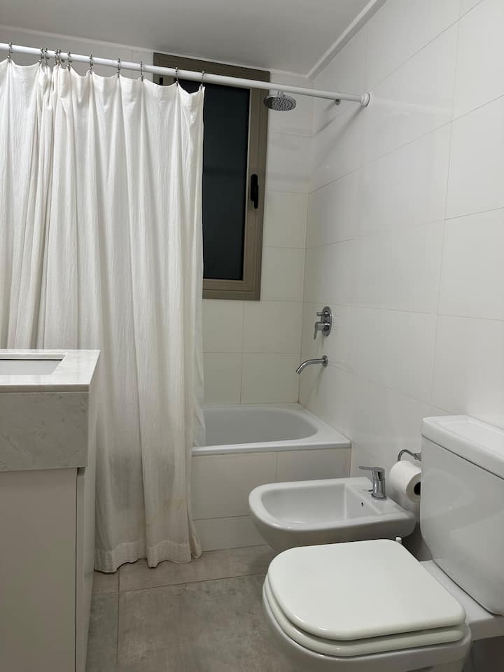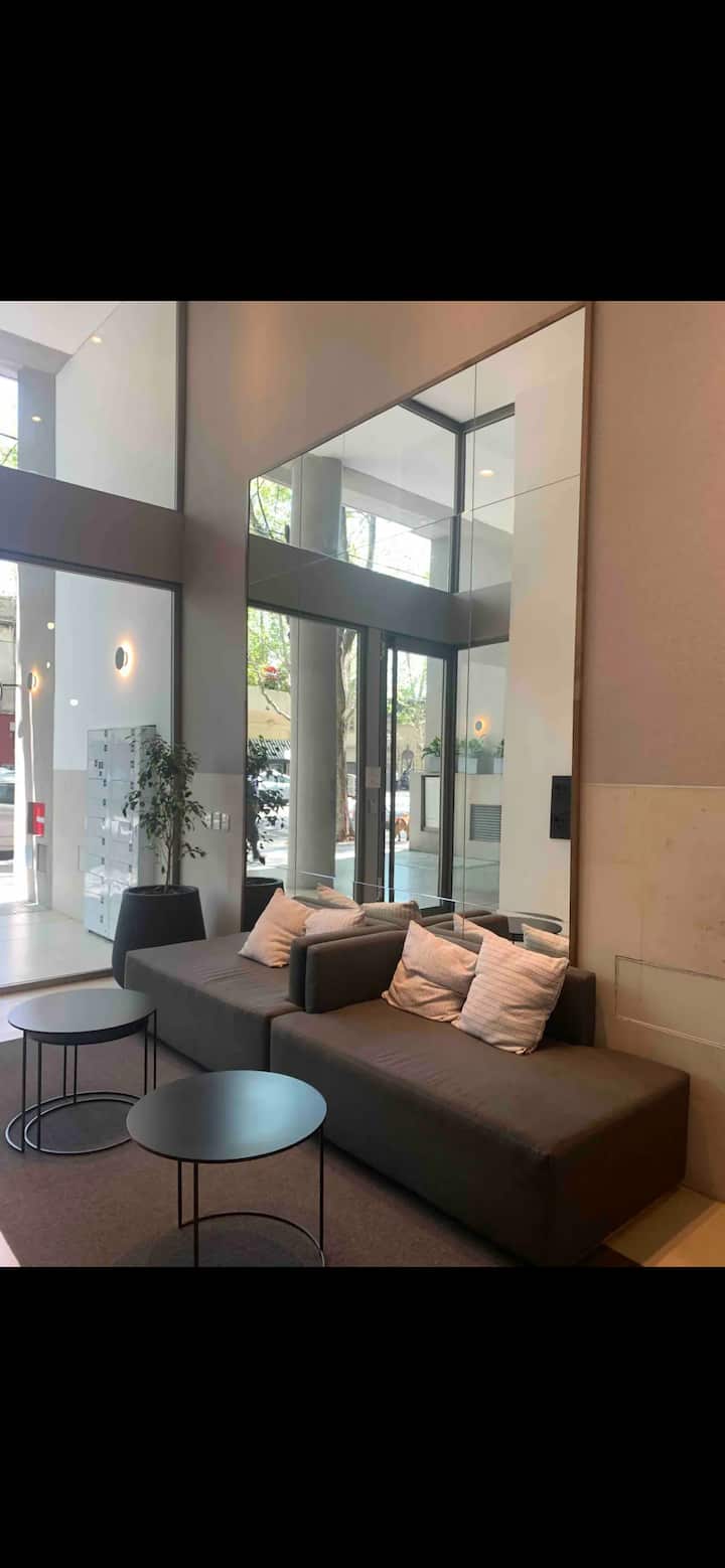 Kitnet em Chacarita, com varanda. Cozinha totalmente equipada, sala com mesa de madeira para quatro pessoas e sofá de três lugares. Há Smart TV para uso na área de estar.