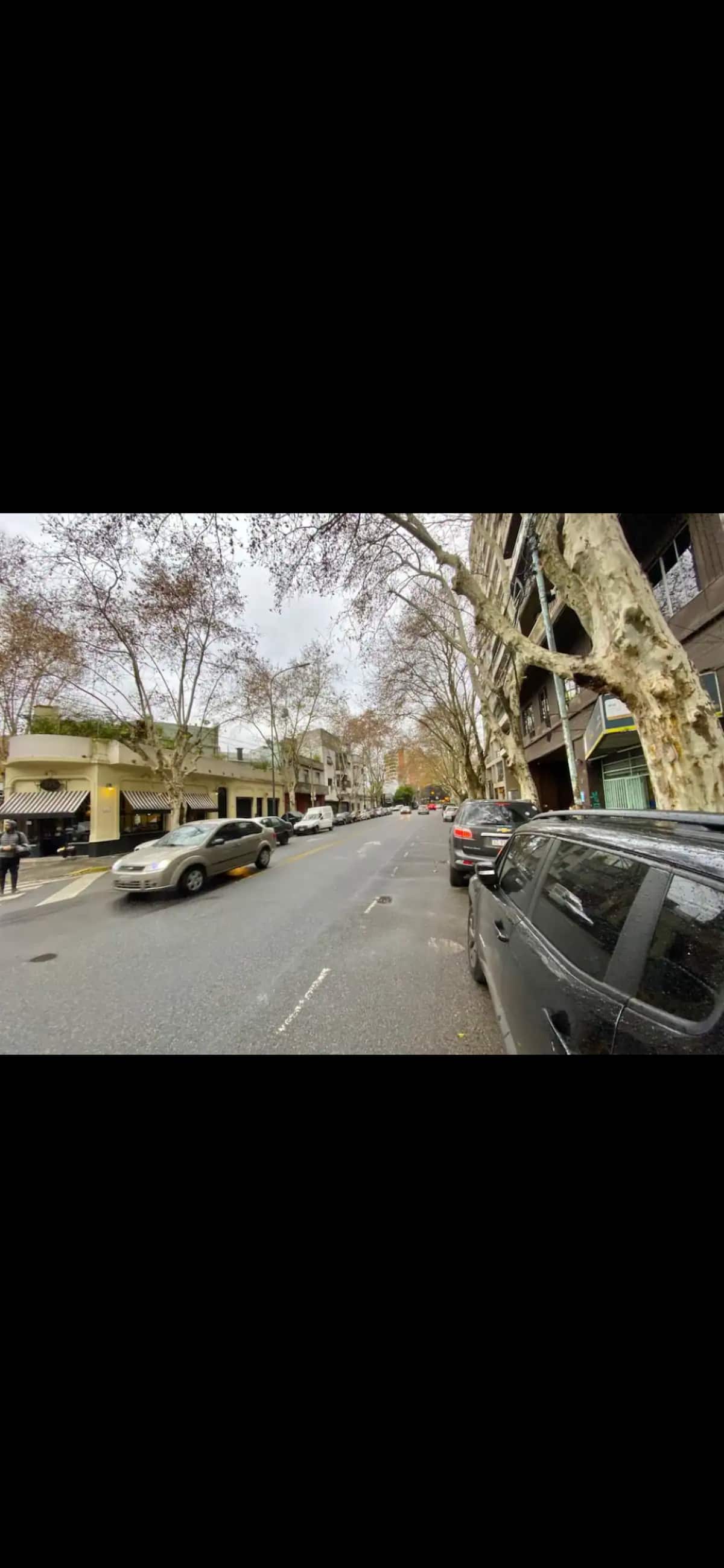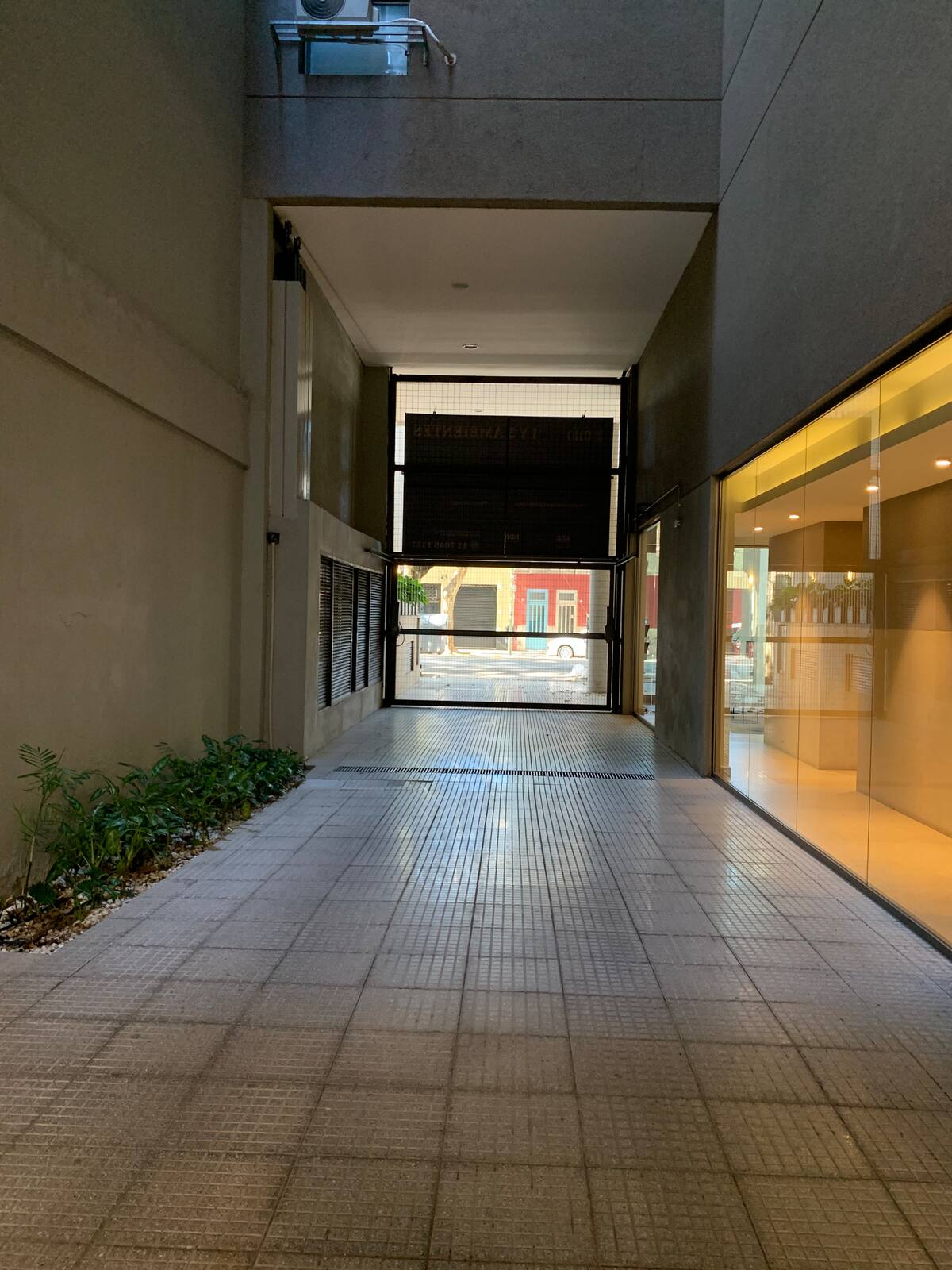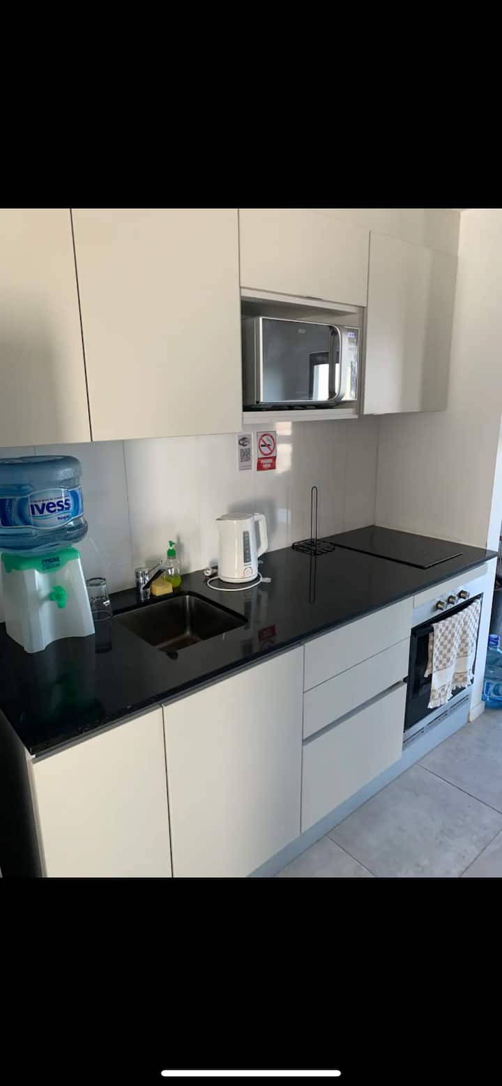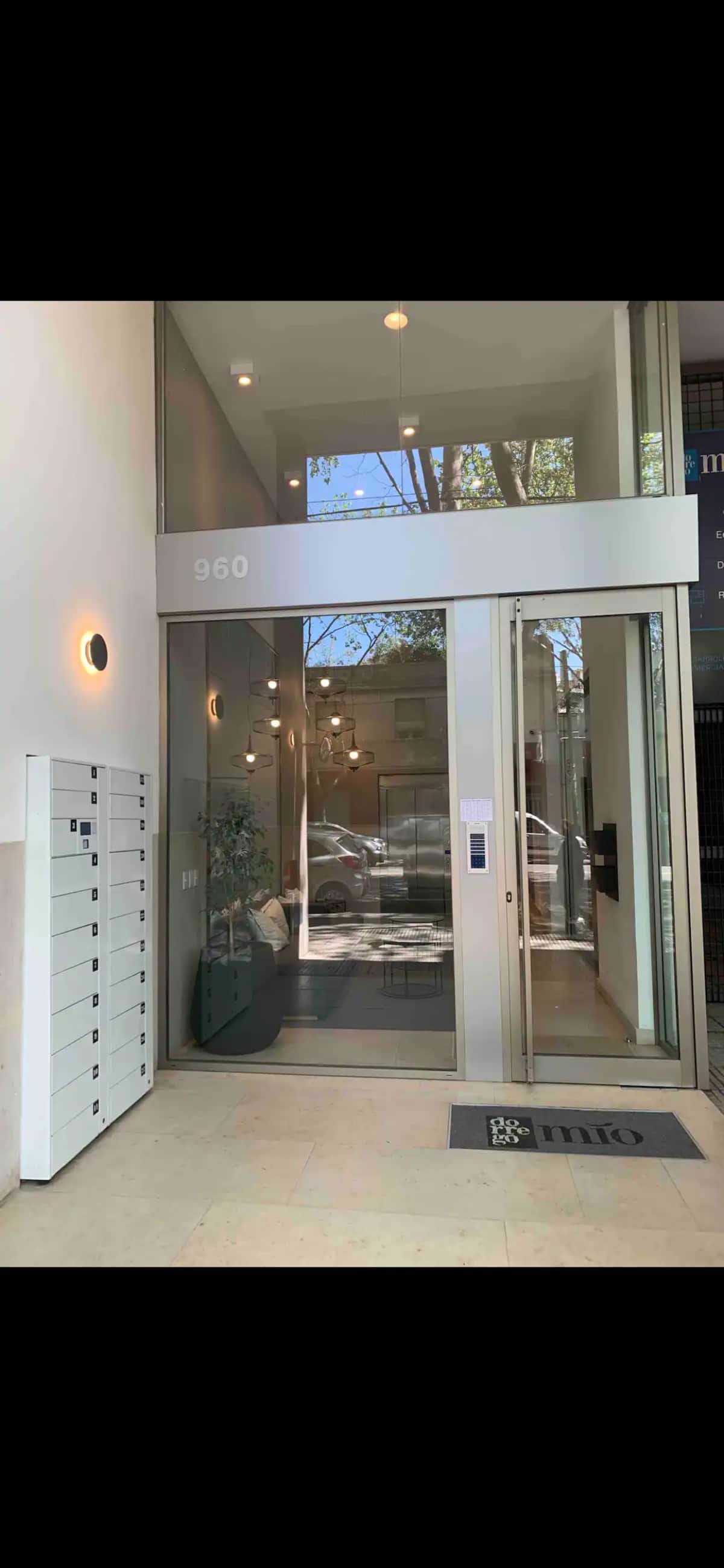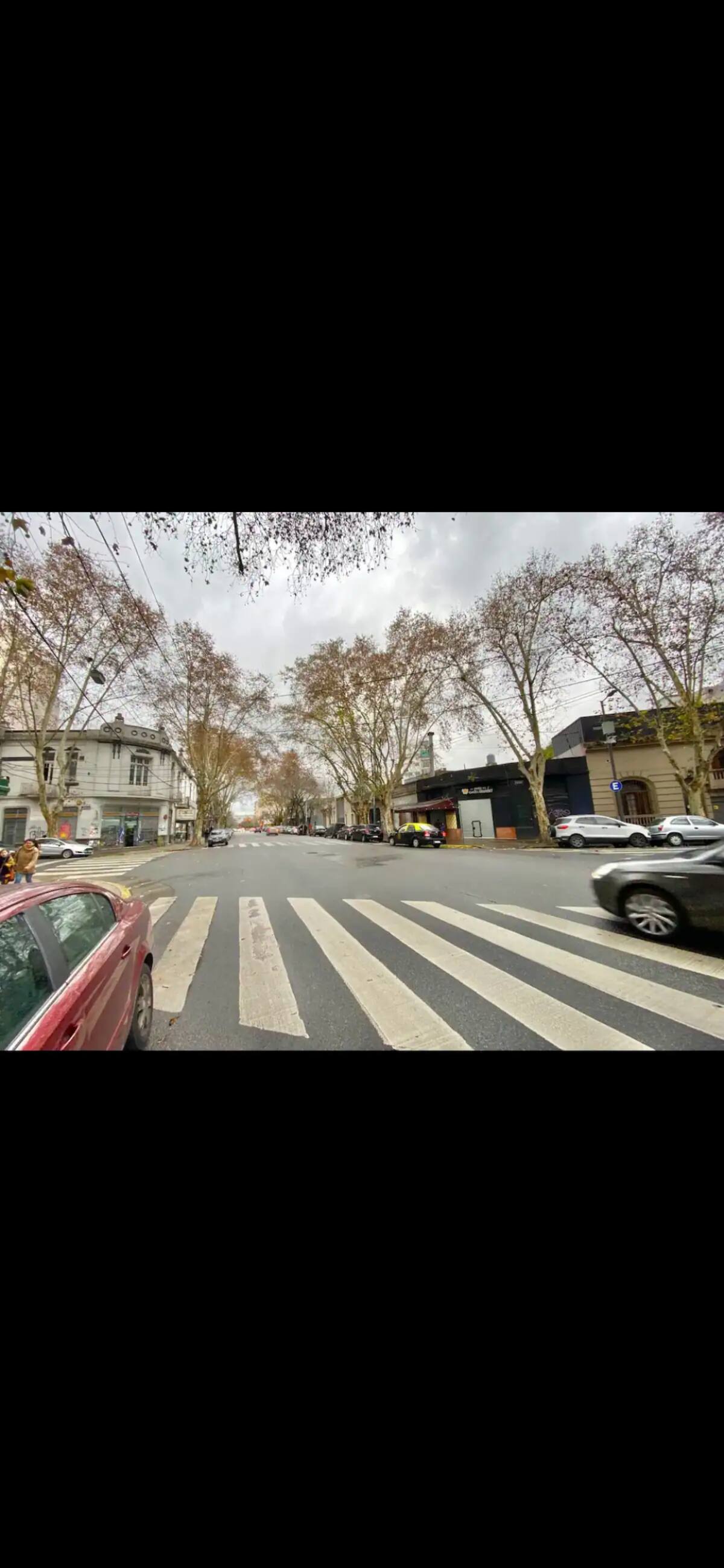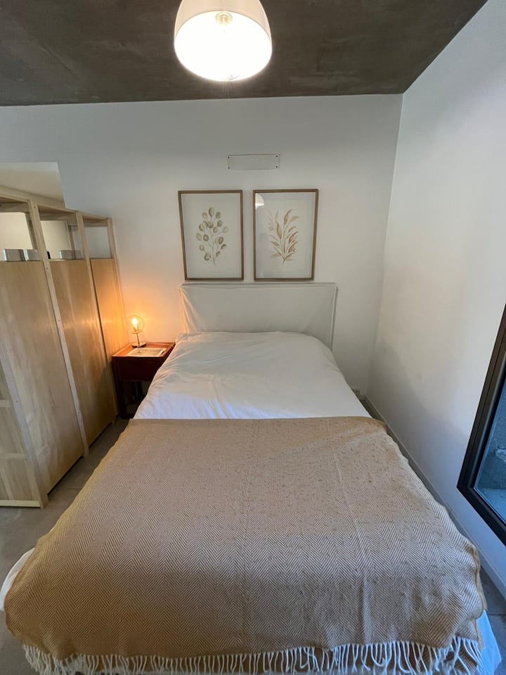 Kitnet em Chacarita, com varanda. Cozinha totalmente equipada, sala com mesa de madeira para quatro pessoas e sofá de três lugares. Há Smart TV para uso na área de estar.