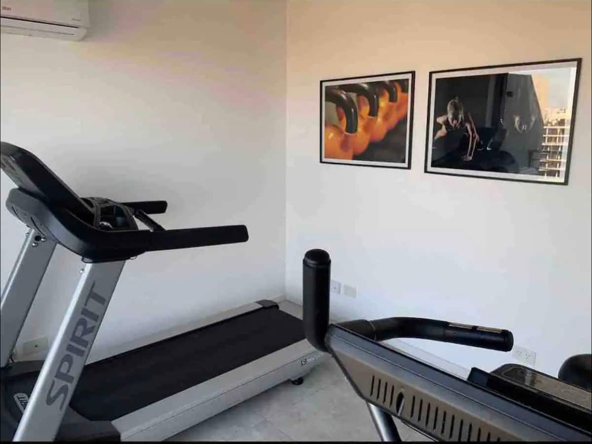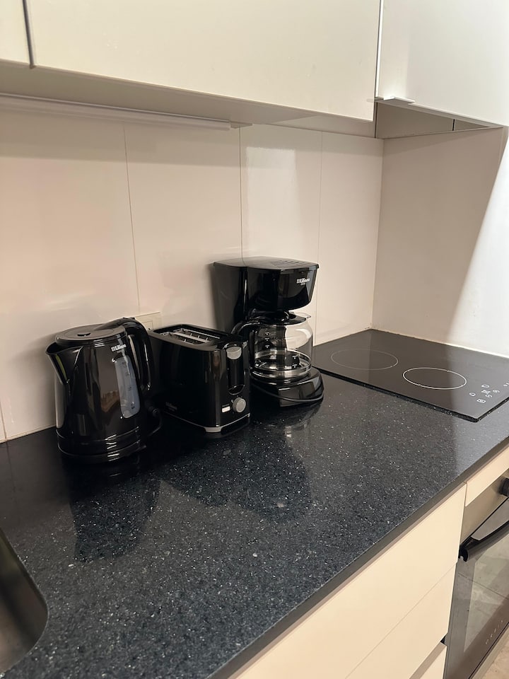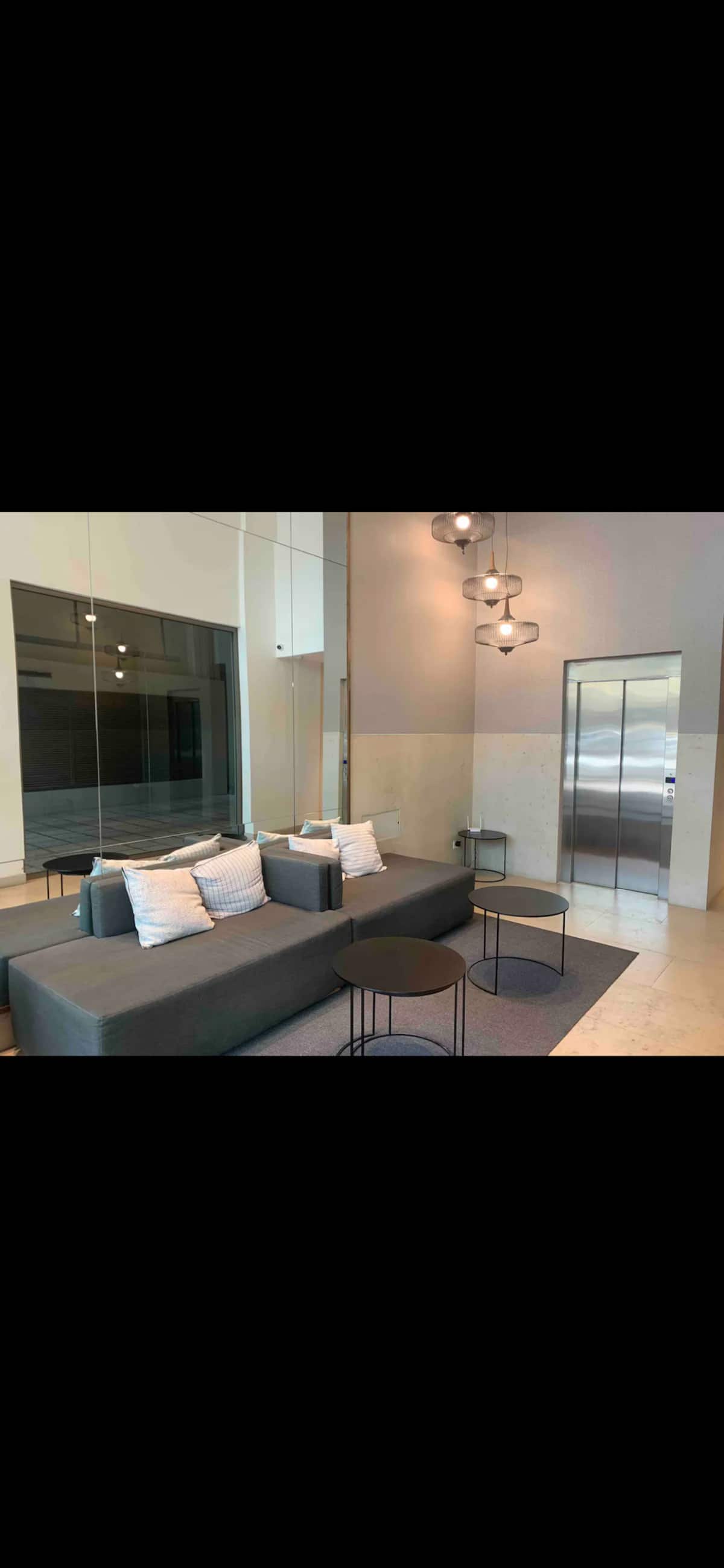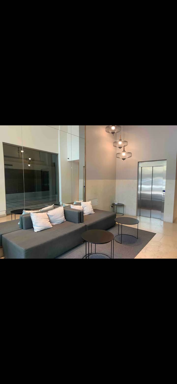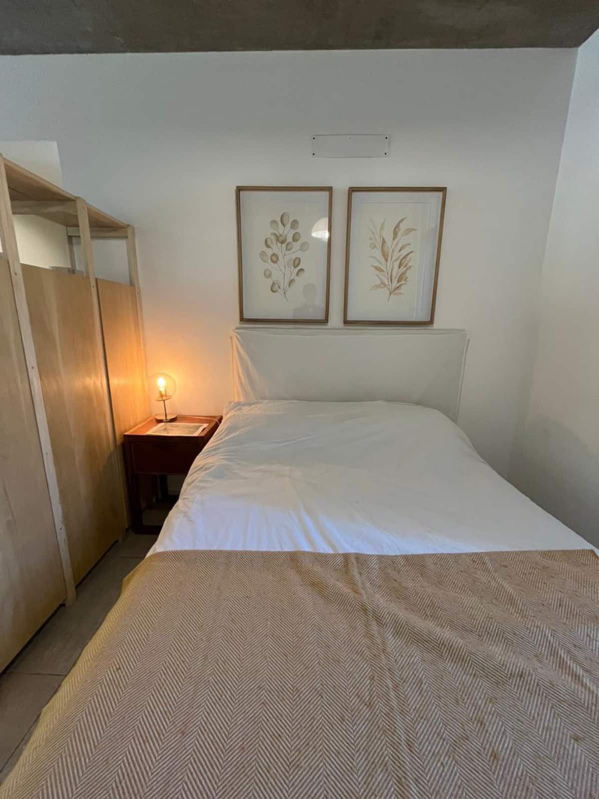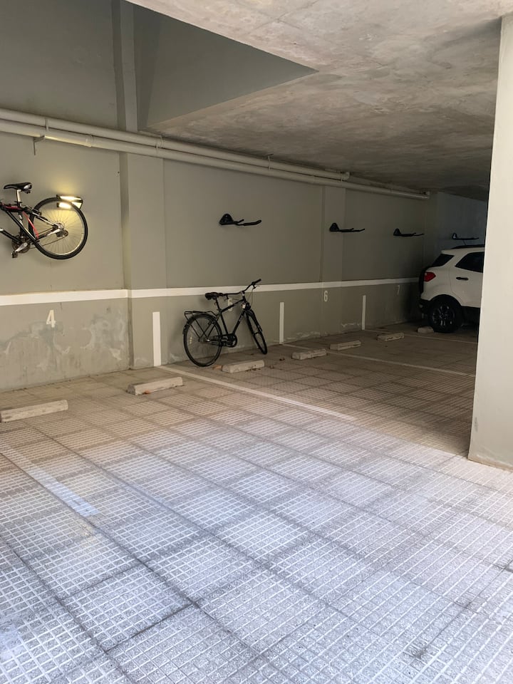 Kitnet em Chacarita, com varanda. Cozinha totalmente equipada, sala com mesa de madeira para quatro pessoas e sofá de três lugares. Há Smart TV para uso na área de estar.