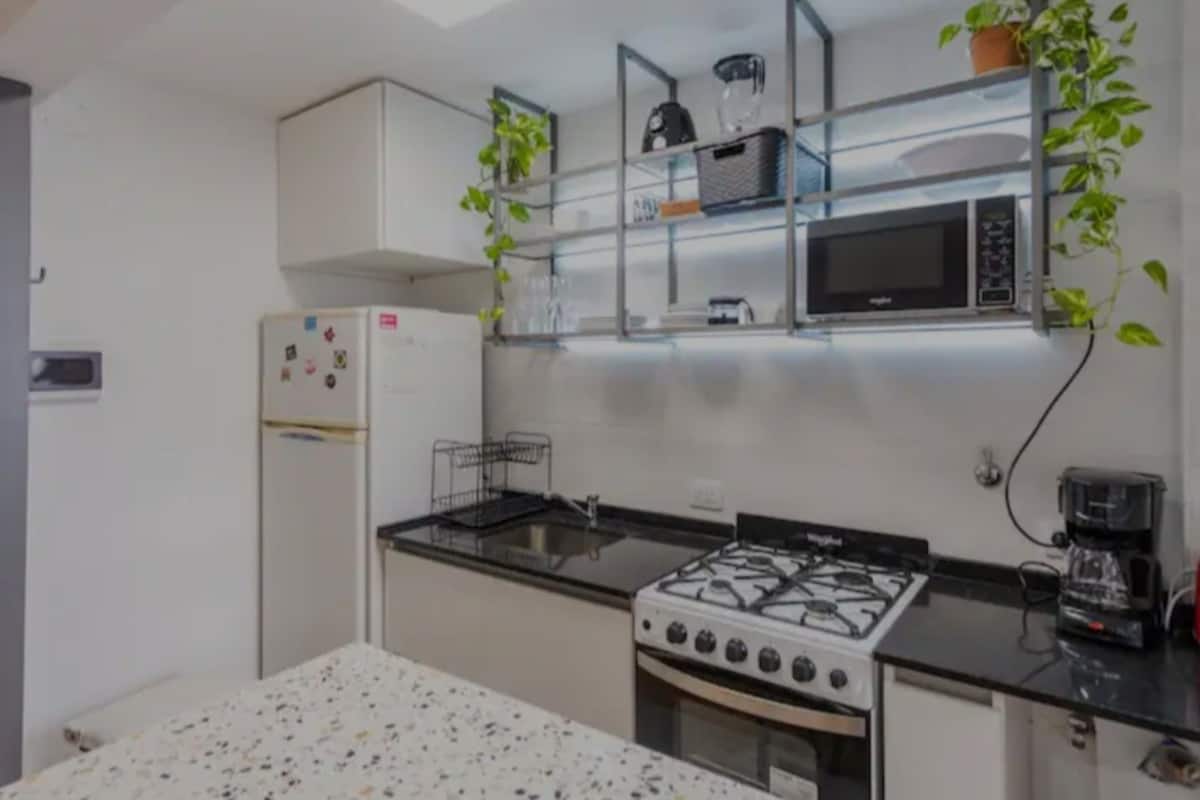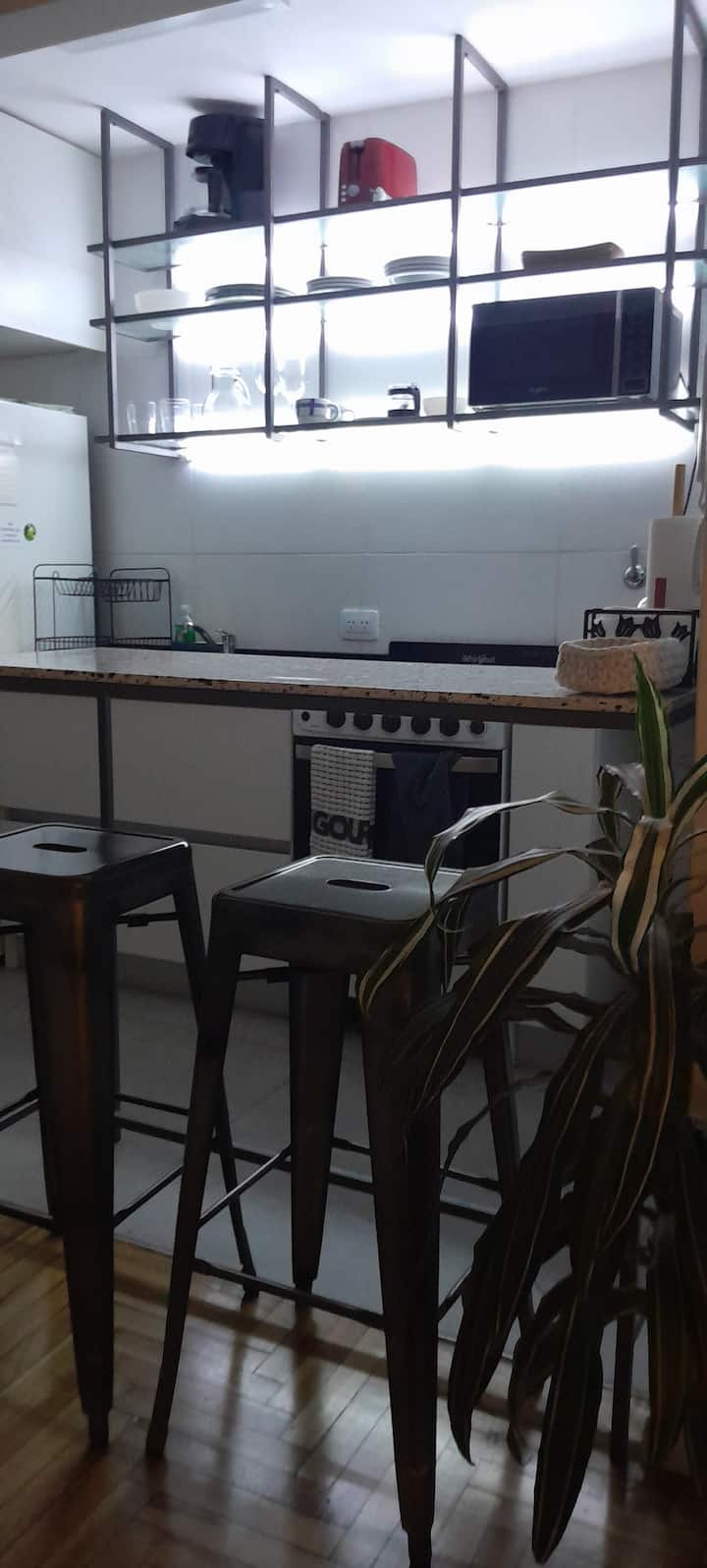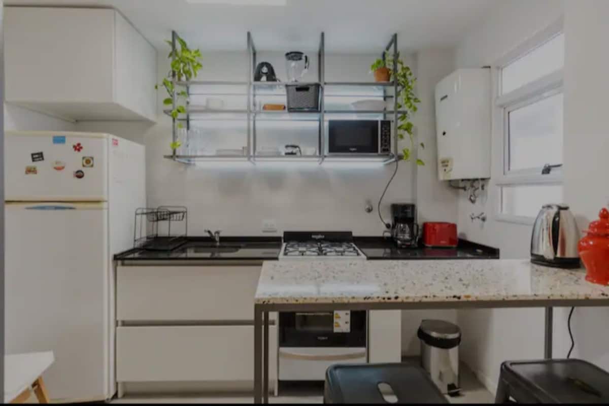 Apartamento de 1 quarto com sala e cozinha integrada, com área descrita no anúncio como “two-room”. Cozinha com geladeira com freezer, cafeteira, micro-ondas, torradeira e liquidificador. Sala com poltronas, mesa de apoio e mesa para trabalho remoto. Ar-condicionado e Smart TV. Quarto com base de cama de casal nova e guarda-roupa com espelho. Banheiro completo com box, secador de cabelo e espelho grande; berço infantil disponível mediante solicitação. Wi-Fi de 307 Mbps. Check-in das 15:00 às 23: