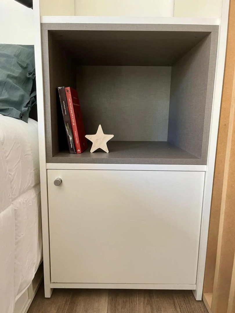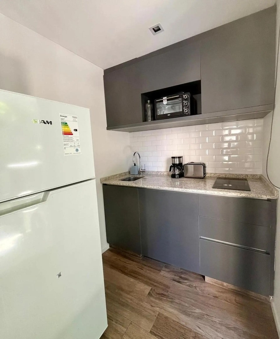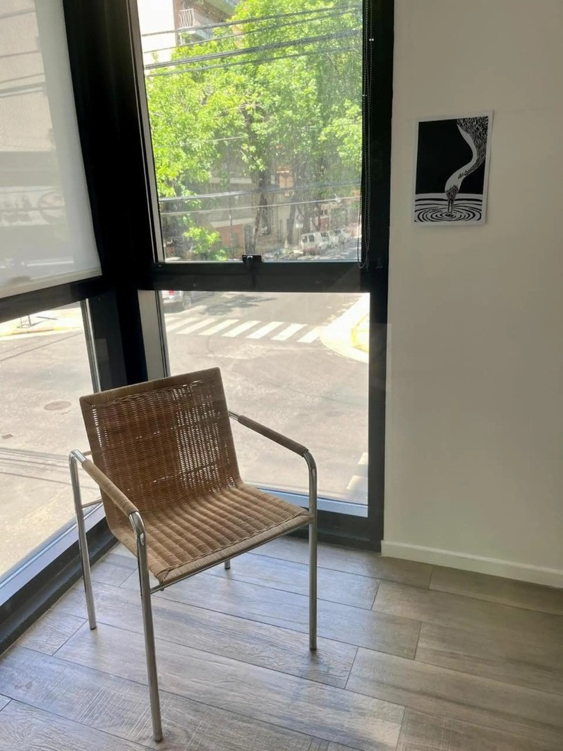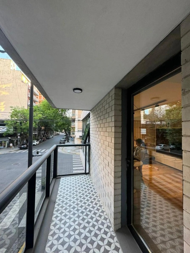 Apartamento de 1 quarto em Colegiales, com living e sala de jantar integrados, janelas para a rua e varanda. Varanda corrida, dormitório com cama de casal com espaço de guarda e 1 futon-cama, além de cozinha integrada com 2 fogões elétricos e 1 banheiro completo. Cortinas roller screen e black out; equipado e “todo a estrenar”. O aluguel por 6 meses é de USD 690 por mês, com depósito de 1 mês e taxa de 1 mês. O preço inclui condomínio, imposto imobiliário e água, além de internet; não inclui ele