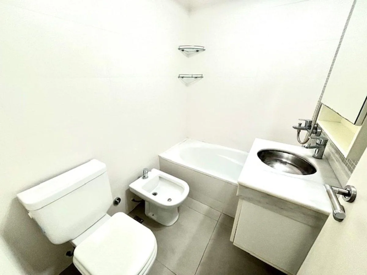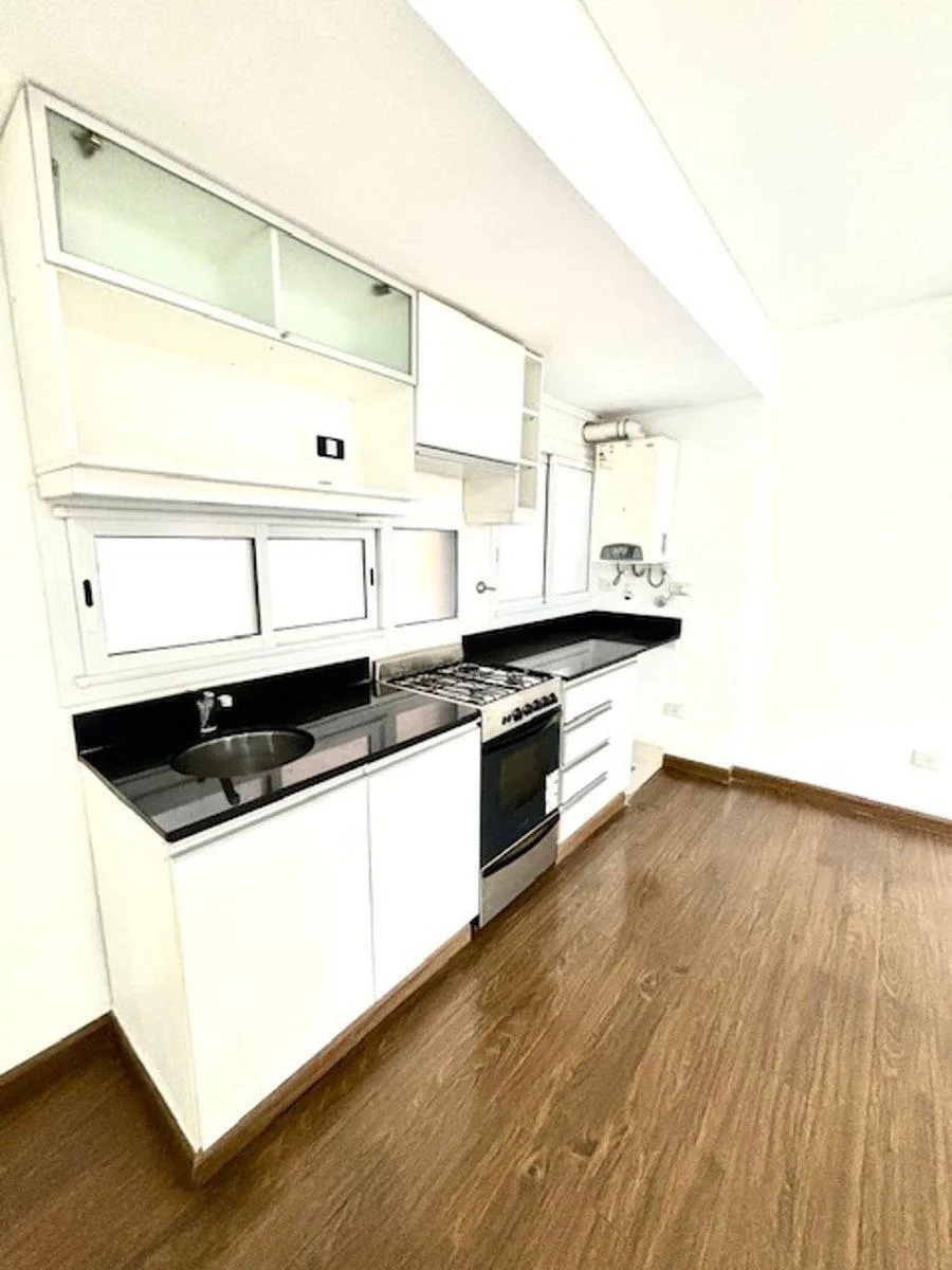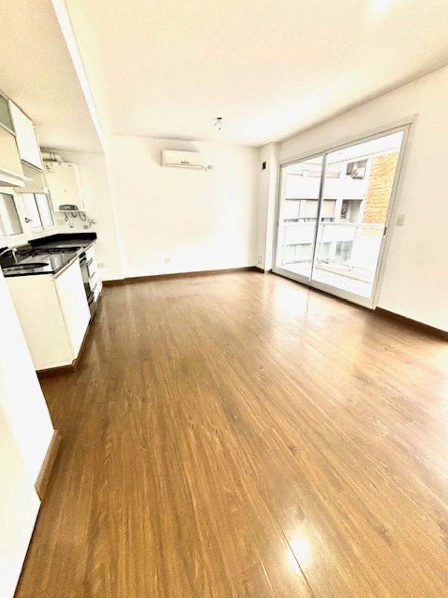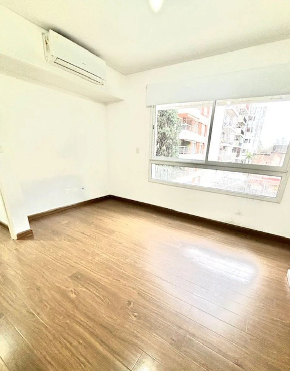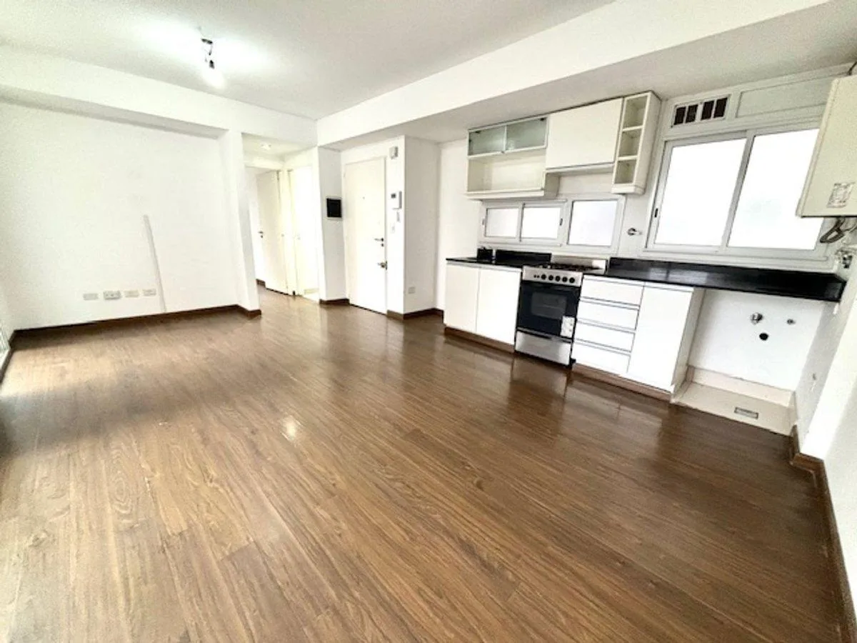 Apartamento de dois ambientes para aluguel em Belgrano, CABA, sem mobília, com orientação este. Fica no 3º andar de fundos em um edifício de 10 andares, 4 unidades por andar, com elevador amplo. Tem living com cozinha integrada e conexão para máquina de lavar, varanda, lavabo e suíte com closet, além de janelas de alumínio com vidro duplo (DVH), ar-condicionado nos dois ambientes e aquecimento por piso radiante individual.