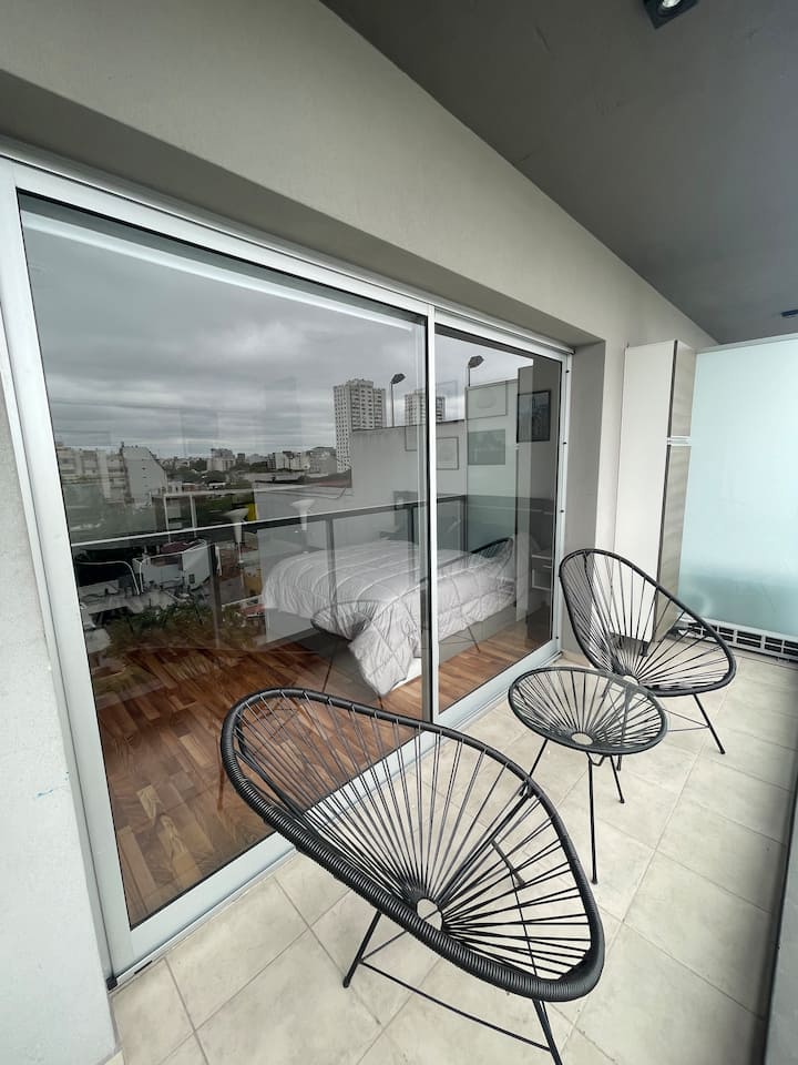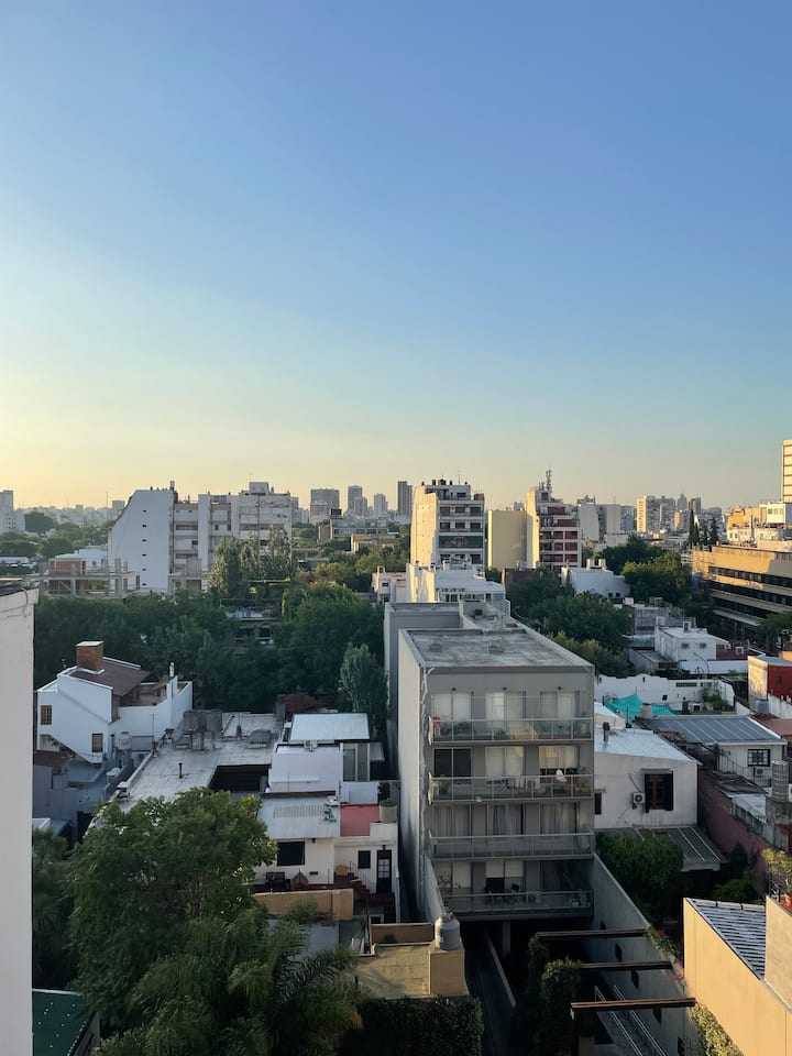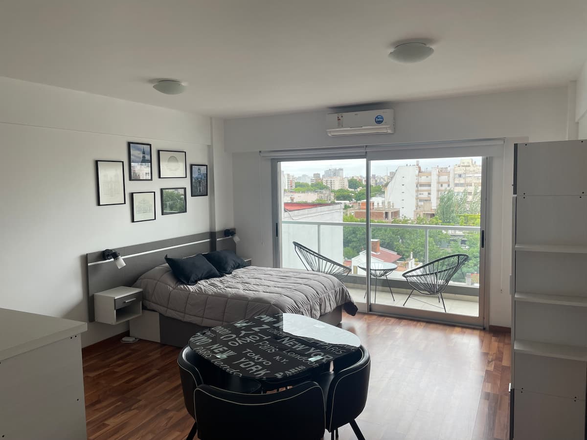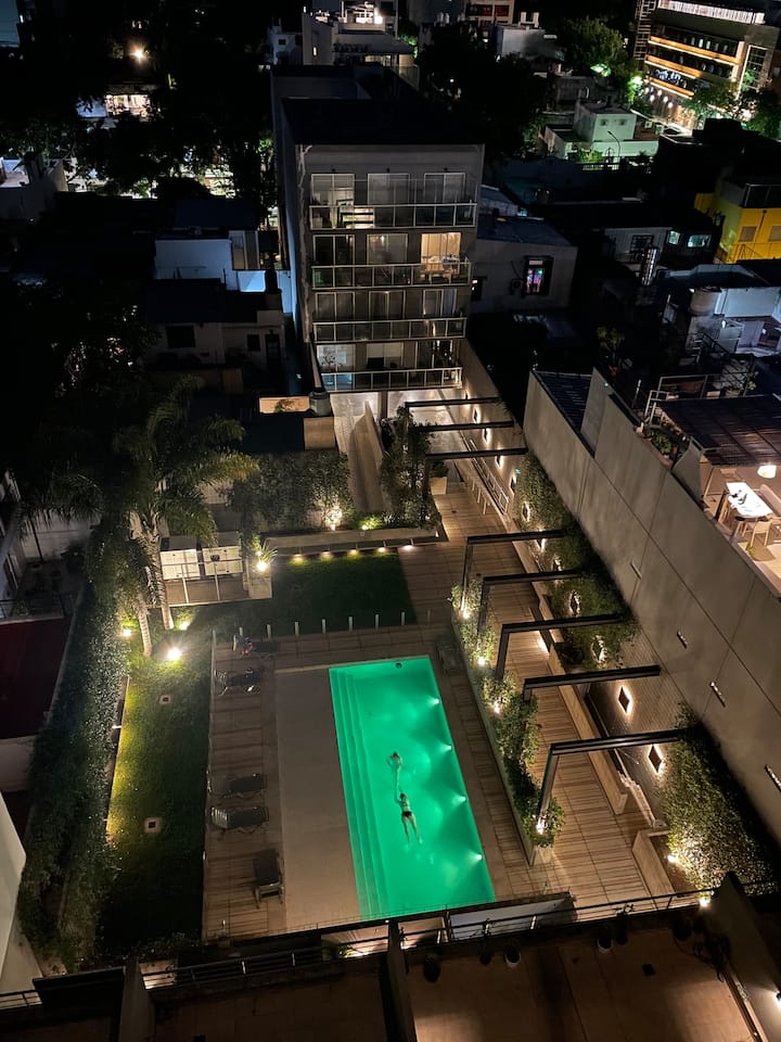 Apartamento em Colegiales. Ambiente único, com vista aberta para a piscina do edifício. O condomínio conta com piscina ao ar livre com chuveiros, lavanderia, academia, salão de festas com área de churrasco e terraço, além de vigilância 24 horas. A região tem comércio e acesso a linhas de ônibus, ao trem Mitre e a estações de metrô.