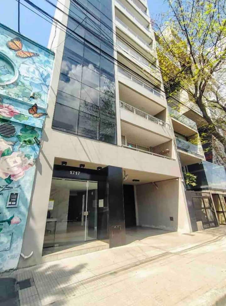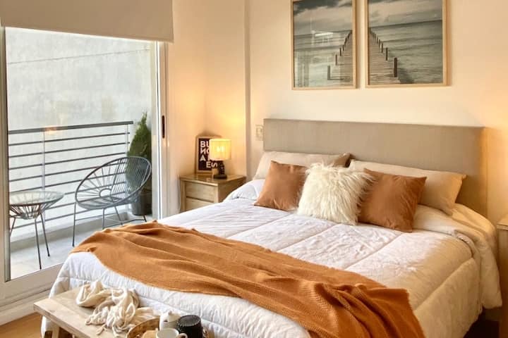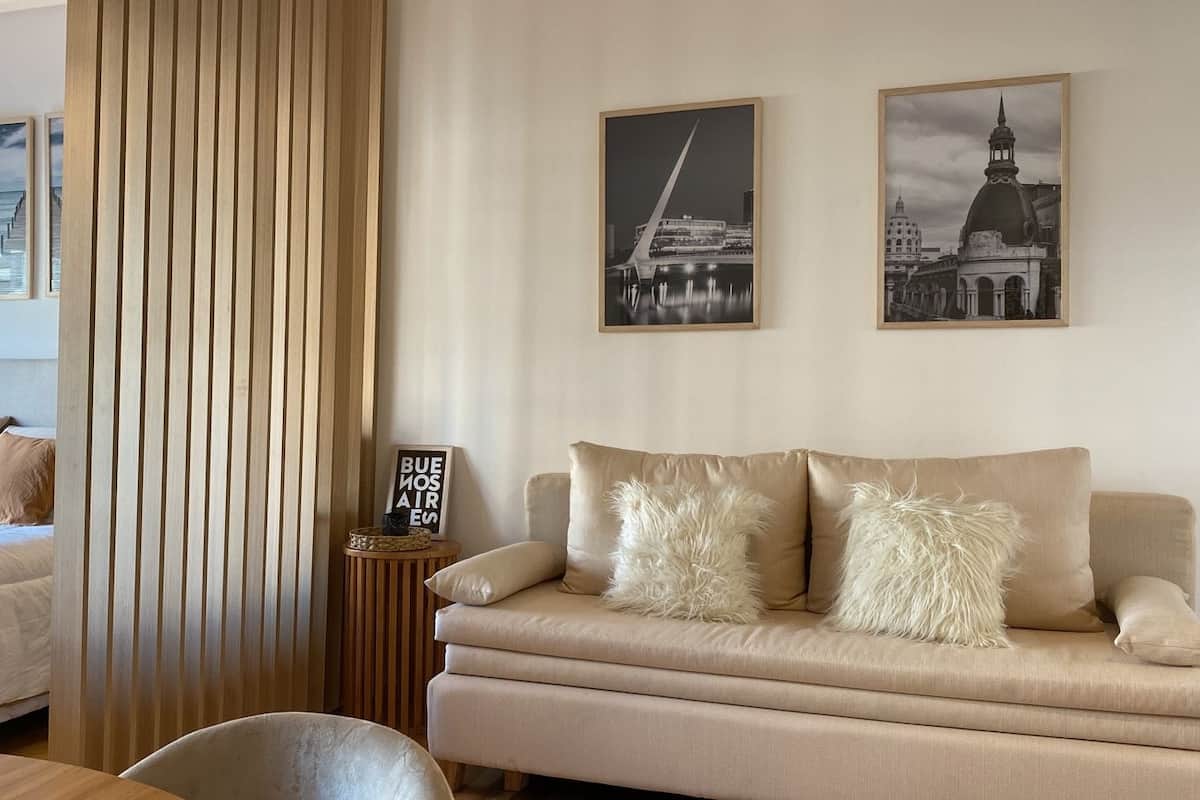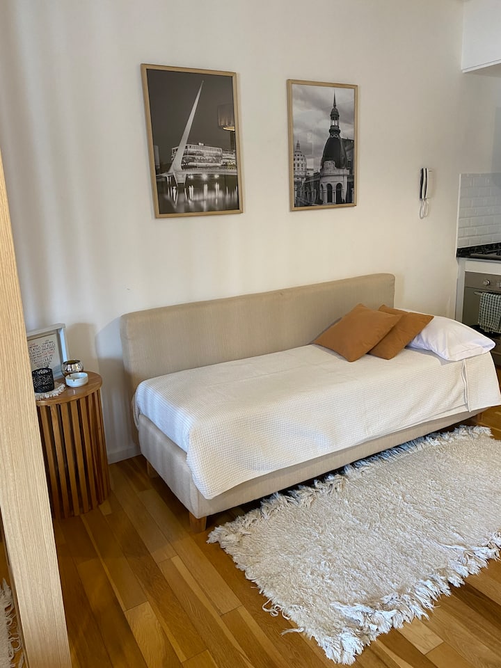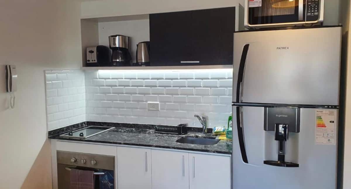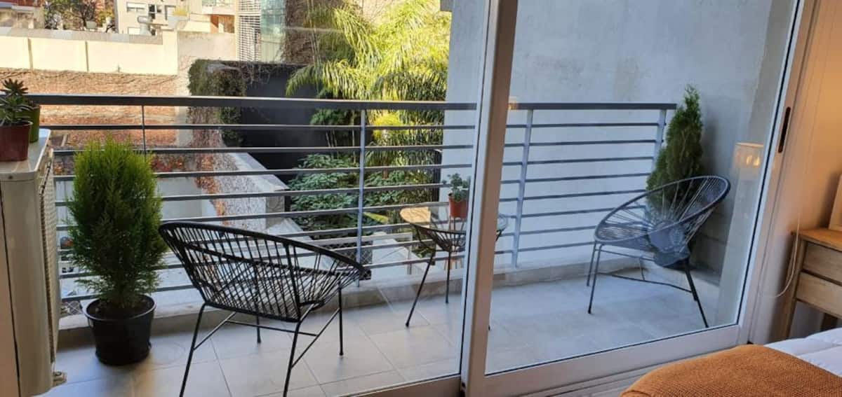 Kitnet em Colegiales com 43 m², mobiliada e com varanda. Cozinha completa para até 3 pessoas, com geladeira com freezer, forno, micro-ondas, forno elétrico, torradeira e cafeteira. Ar-condicionado frio e quente, Wi-Fi gratuito com internet ilimitada de 300 megabytes e TV de 45" com TV a cabo. Localizado a 2 km de Palermo Soho.