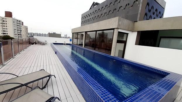 Apartamento de dois ambientes tipo loft com 40 m² no Edificio Brasilia, em andar alto, com grandes janelas e varanda. Cozinha americana com vitrocerâmica e forno acoplado, pisos de porcelanato tipo madeira e ar-condicionado frio e quente. O acesso é por sensor de impressão digital ou cartão magnético. Possui água quente central e amenities como piscina de 13 m, solário, sala de meditação, laundry e jacuzzi. O condomínio inclui AYSA (por ora indicada como incluída no condomínio). Permite uso prof
