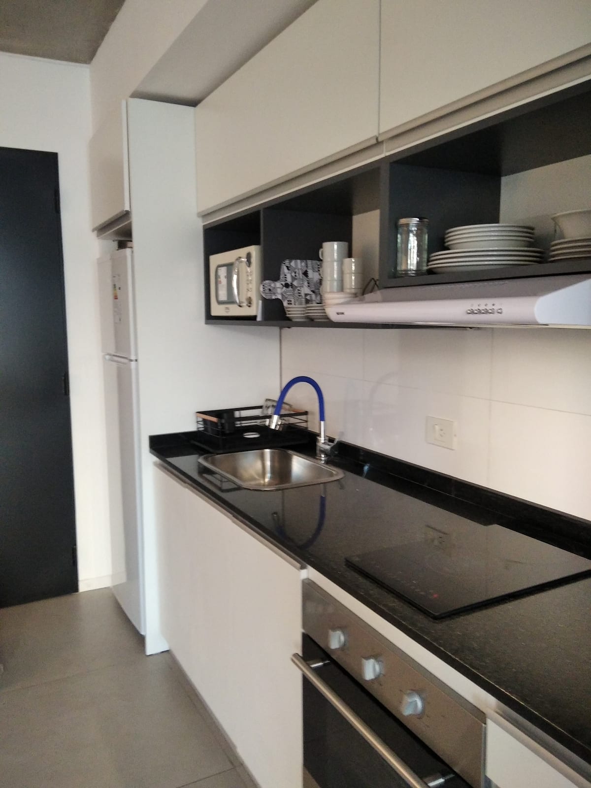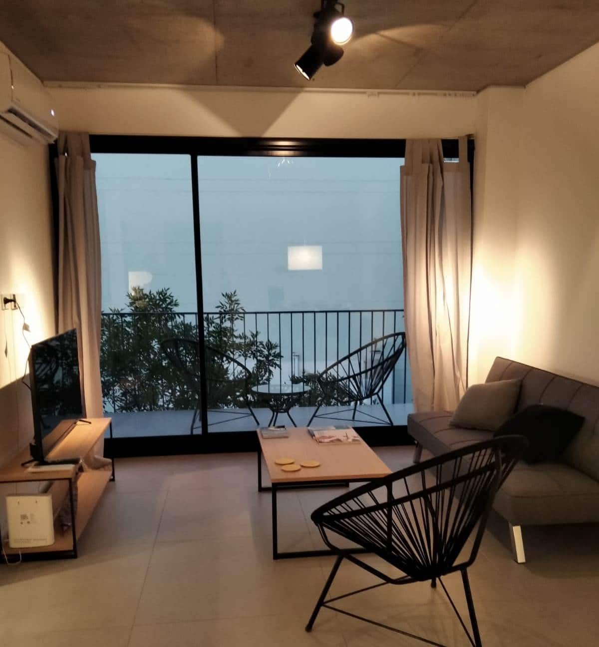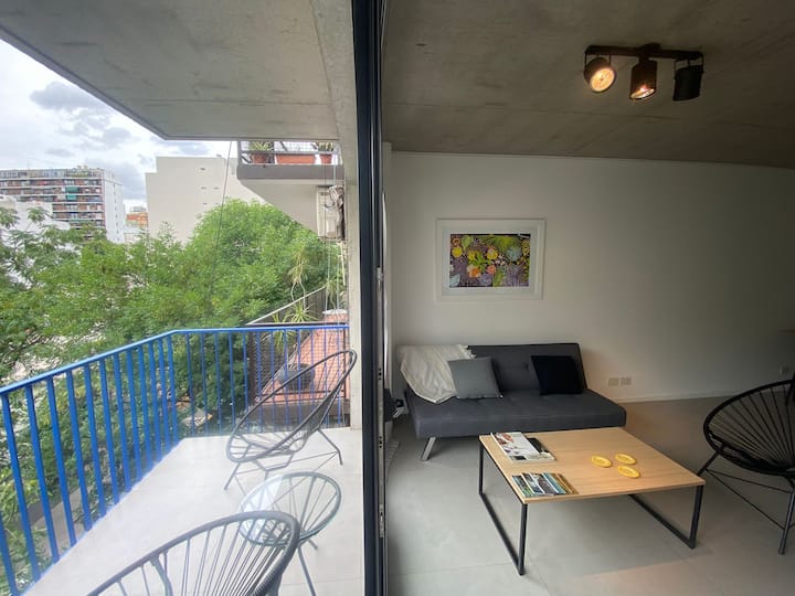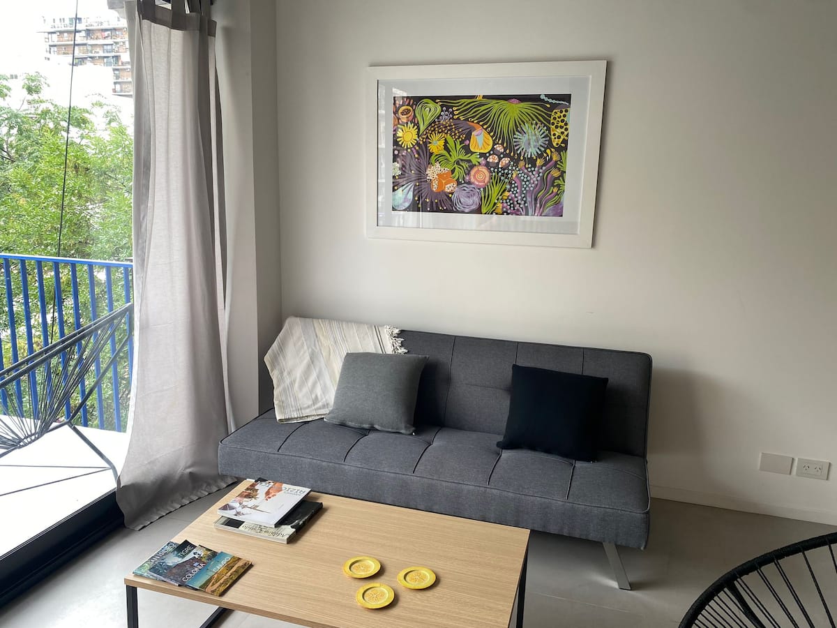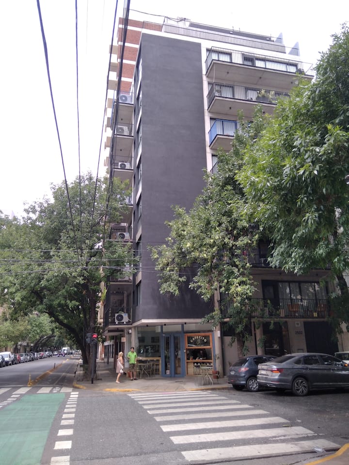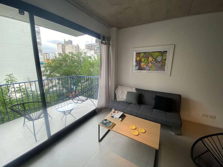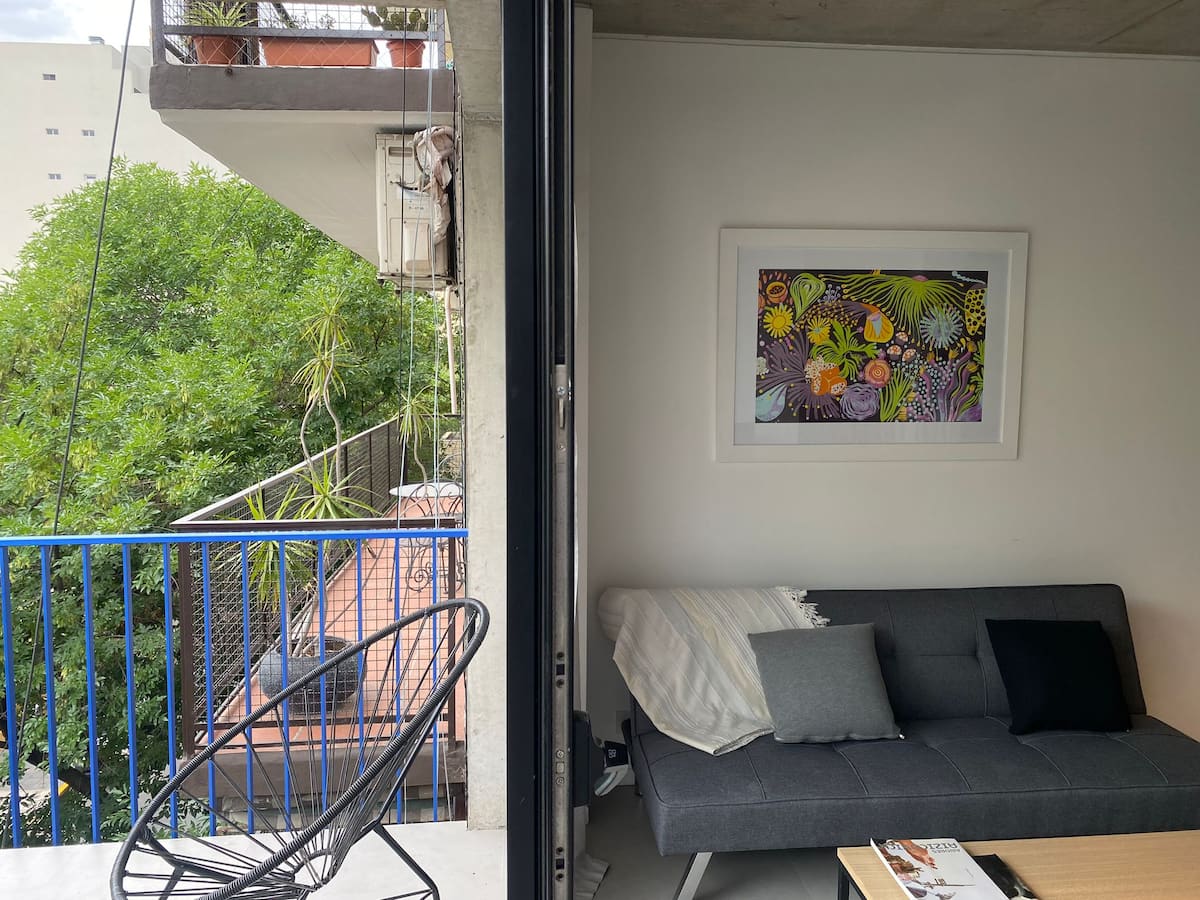Apartamento de 44 m² em Belgrano, com vista para a copa das árvores e varanda. No térreo, há uma área de cozinha/dining/living integrada à varanda e um quarto com cama de casal, além de 1 banheiro. O imóvel tem TV HD Smart, Wi-Fi, micro-ondas, geladeira com freezer, fogão a gás e ar-condicionado frio/quente; a cozinha inclui forno elétrico, fogão de vidro-cerâmica, chaleira elétrica, torradeira e cafeteira elétrica. O prédio oferece bicicletário no térreo e, no 8º andar, uma área de terraço com