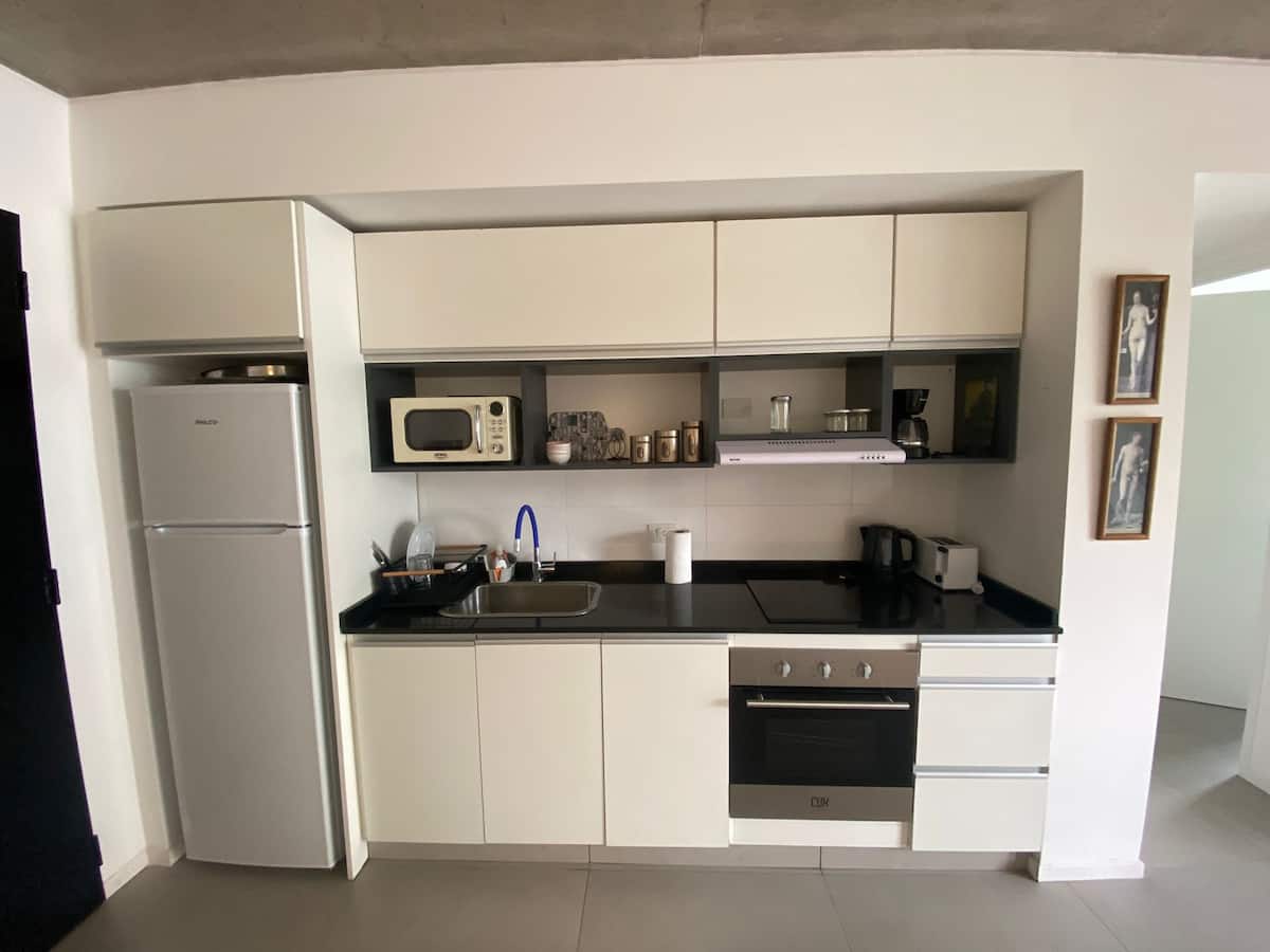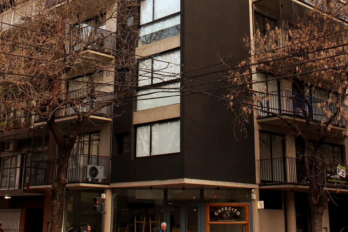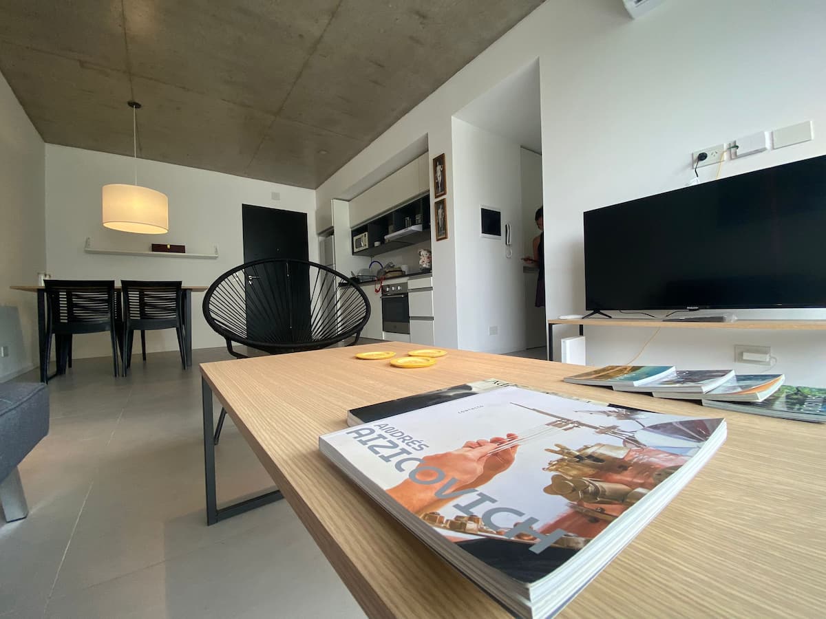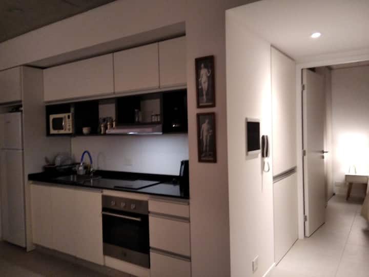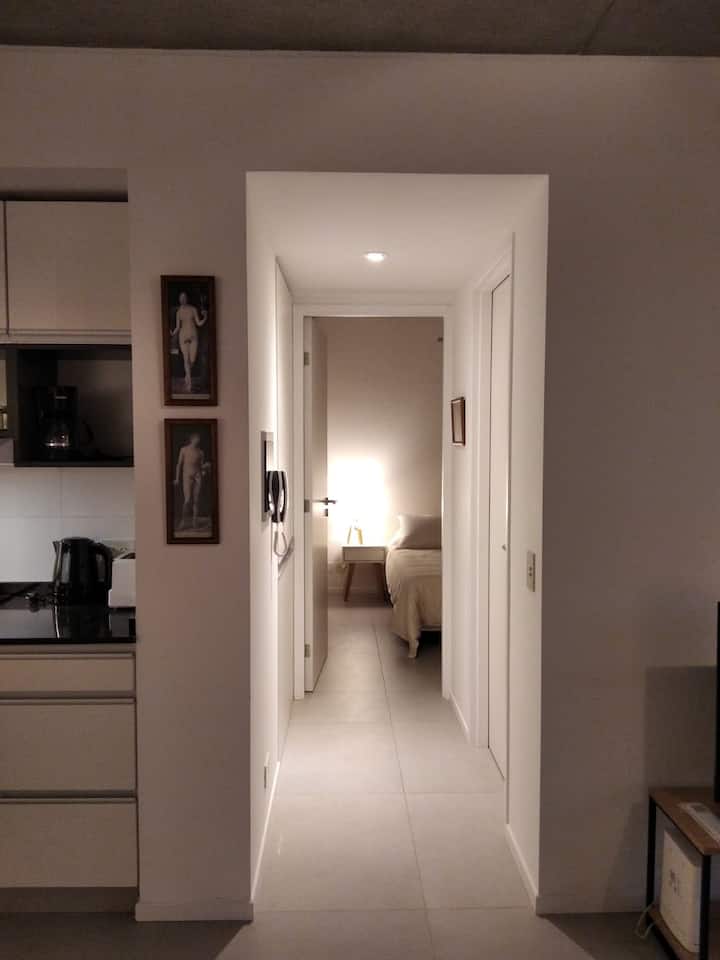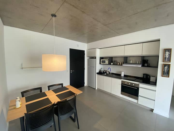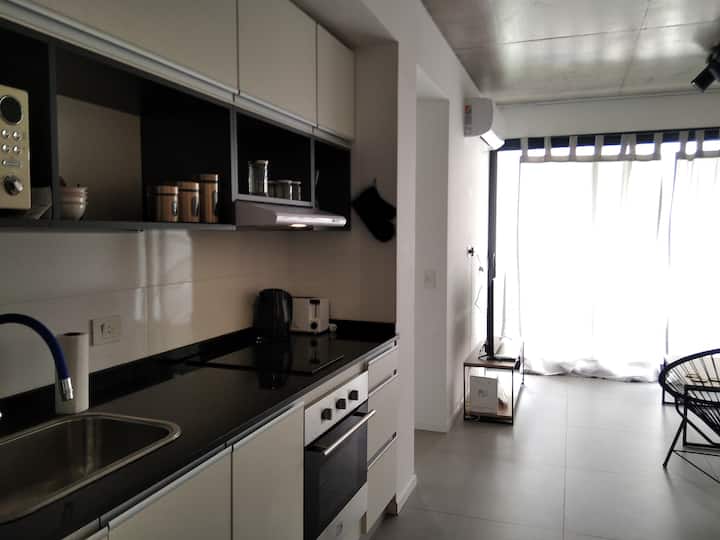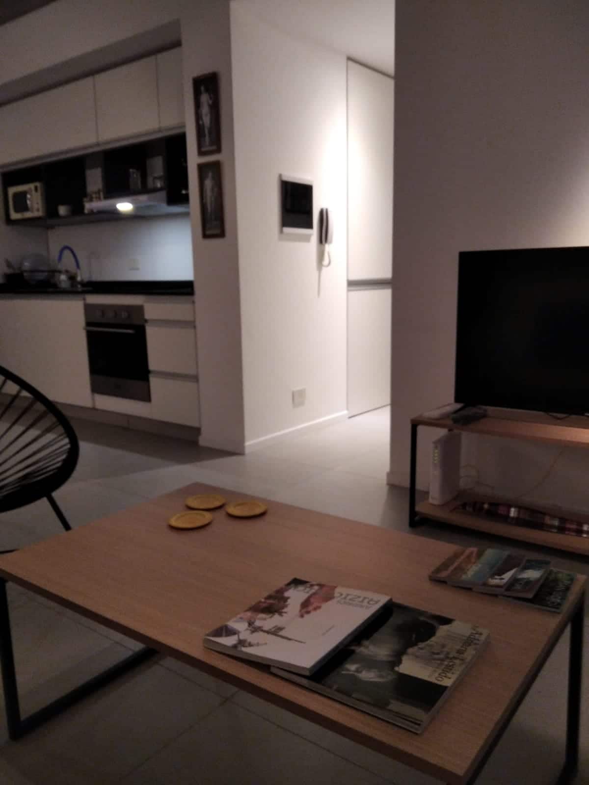 Apartamento de 44 m² em Belgrano, com vista para a copa das árvores e varanda. No térreo, há uma área de cozinha/dining/living integrada à varanda e um quarto com cama de casal, além de 1 banheiro. O imóvel tem TV HD Smart, Wi-Fi, micro-ondas, geladeira com freezer, fogão a gás e ar-condicionado frio/quente; a cozinha inclui forno elétrico, fogão de vidro-cerâmica, chaleira elétrica, torradeira e cafeteira elétrica. O prédio oferece bicicletário no térreo e, no 8º andar, uma área de terraço com